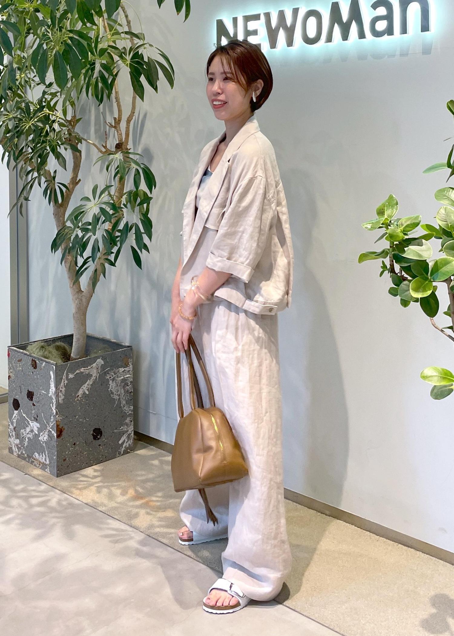 ベージュのセットアップなので、小物もクリーンでナチュラルな色合わせで大人っぽく。