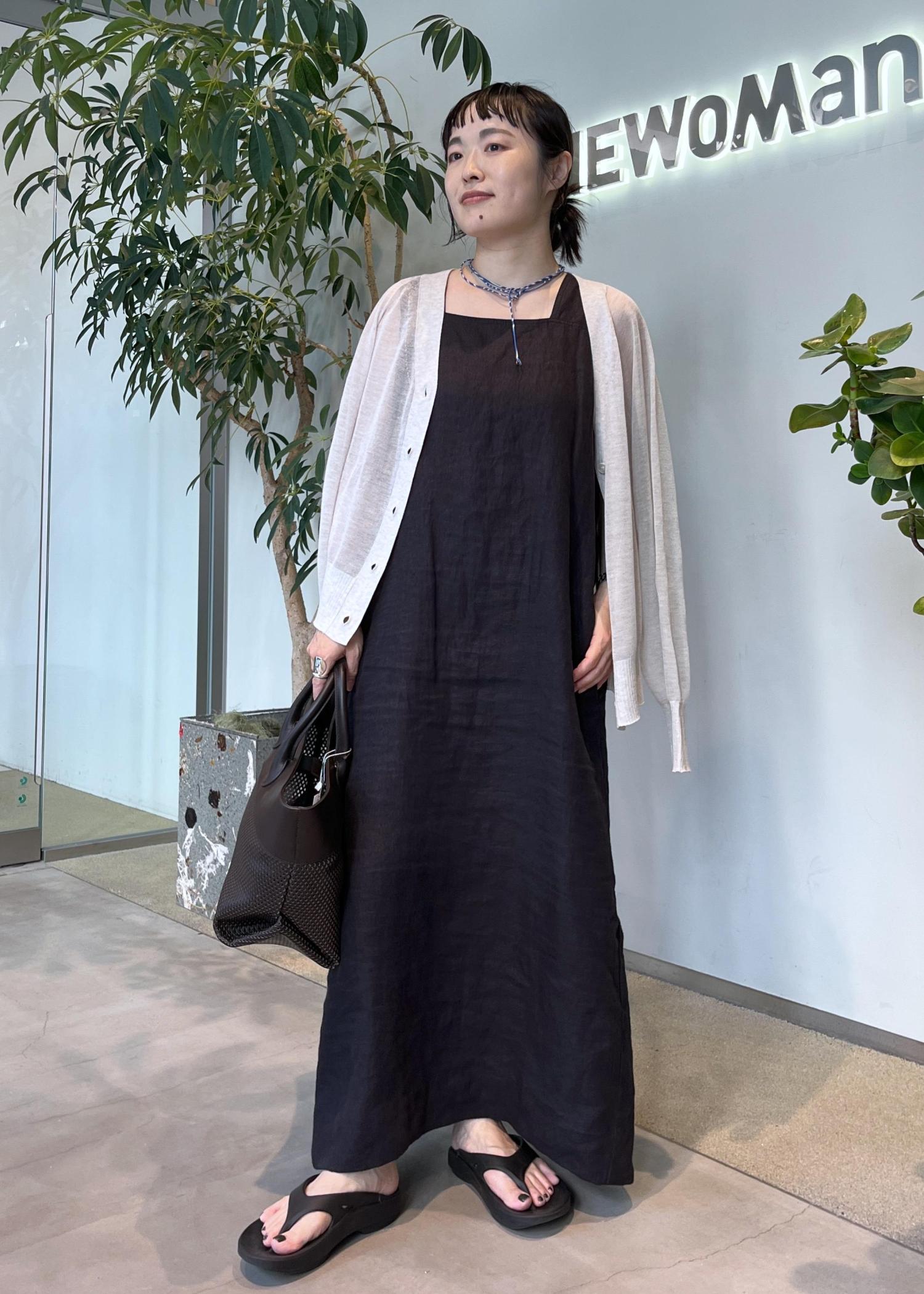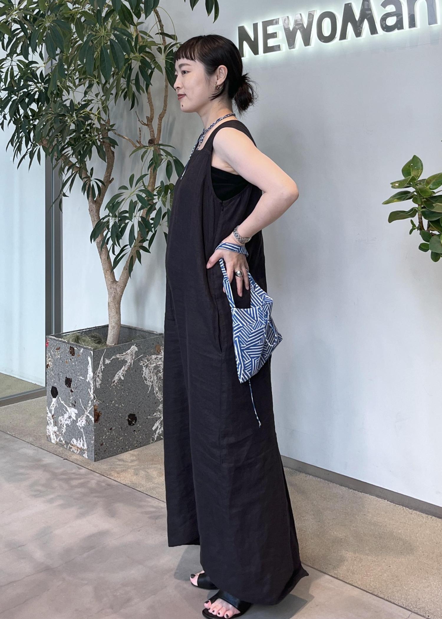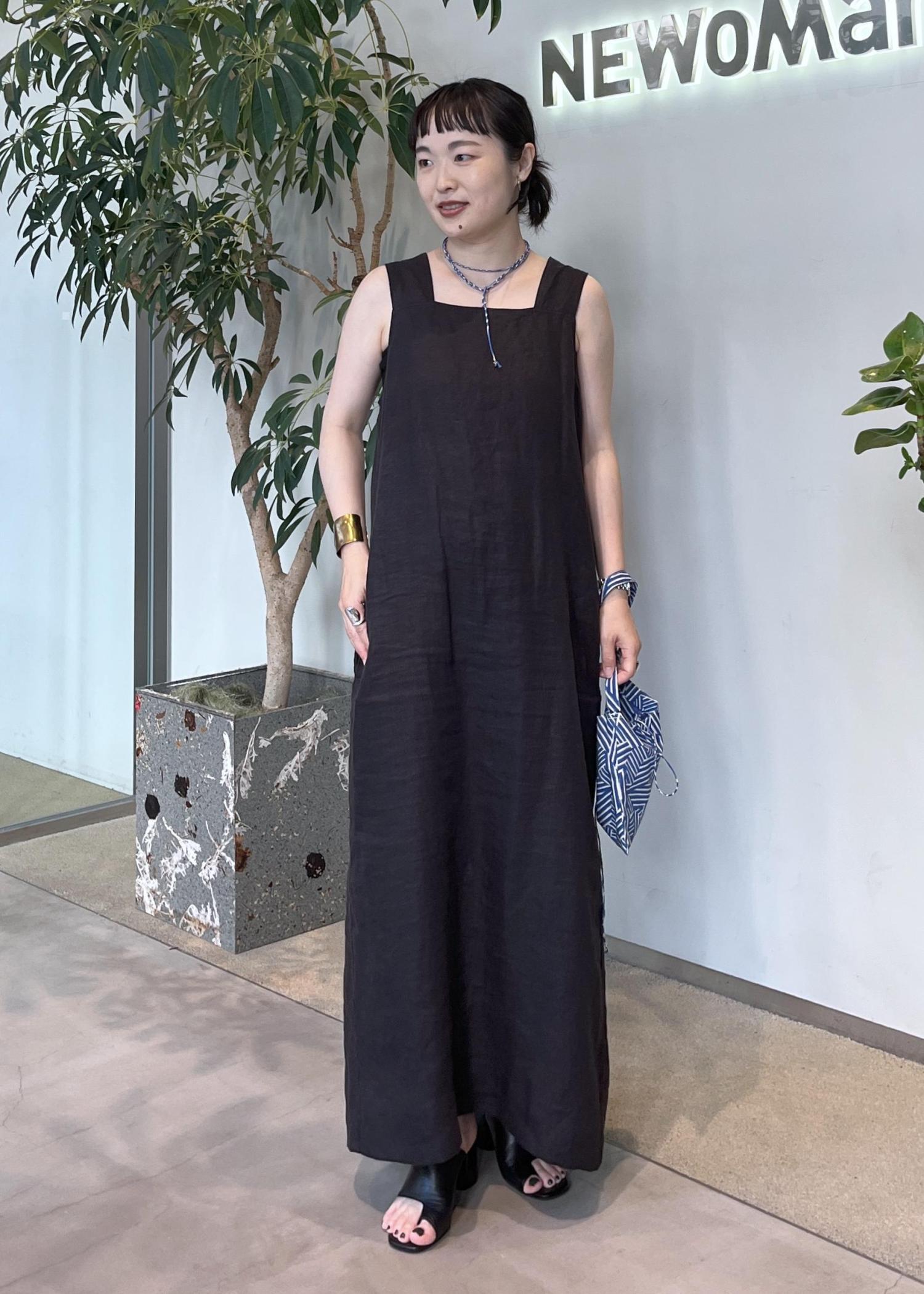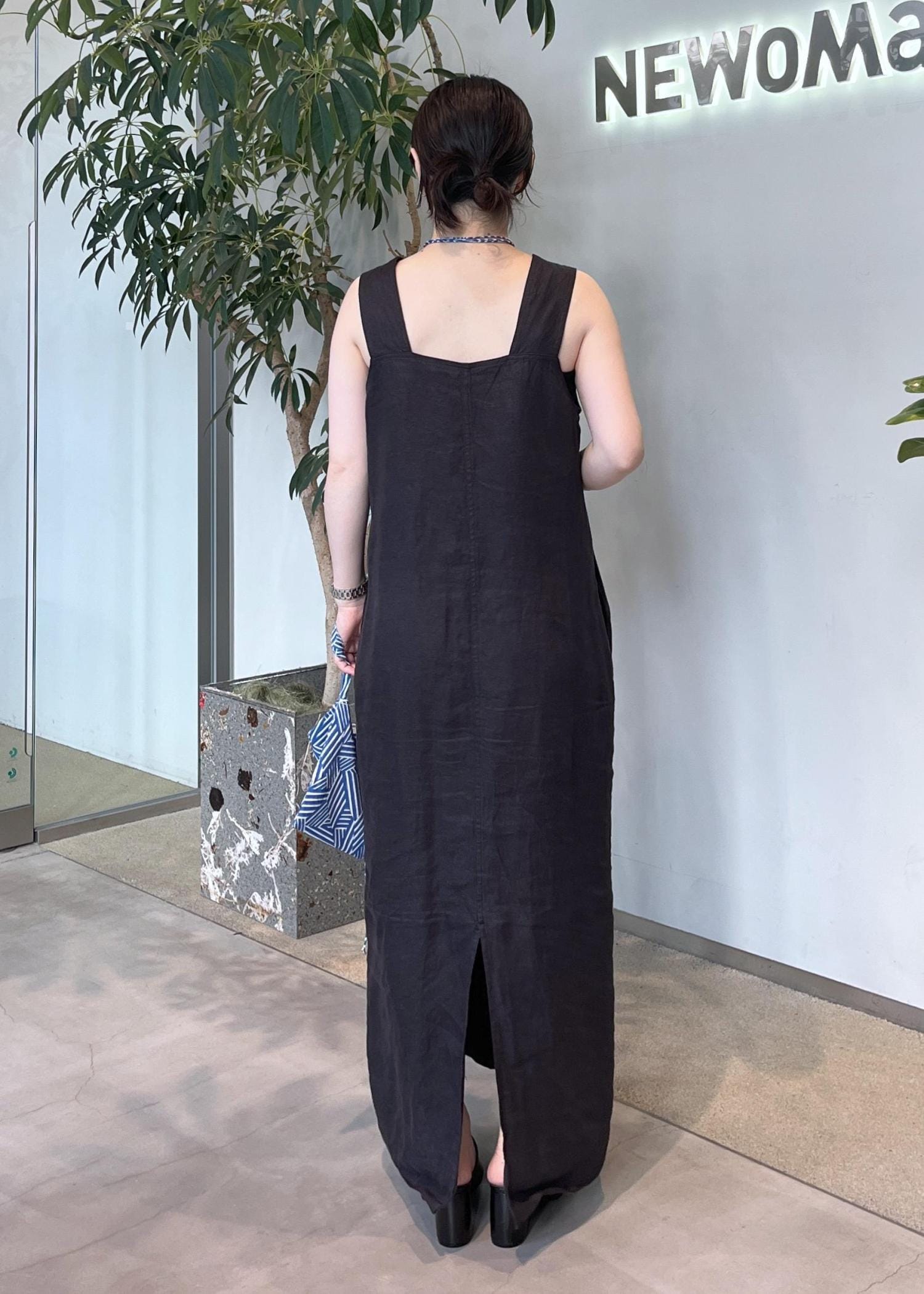 SALON adam et ropéリネンツイルスクエアーネックジャンパースカートブラック / S¥25,300レビュー丈は長めのデザインで、写真ではサイズを5〜6cm、丈詰めして着用しています。