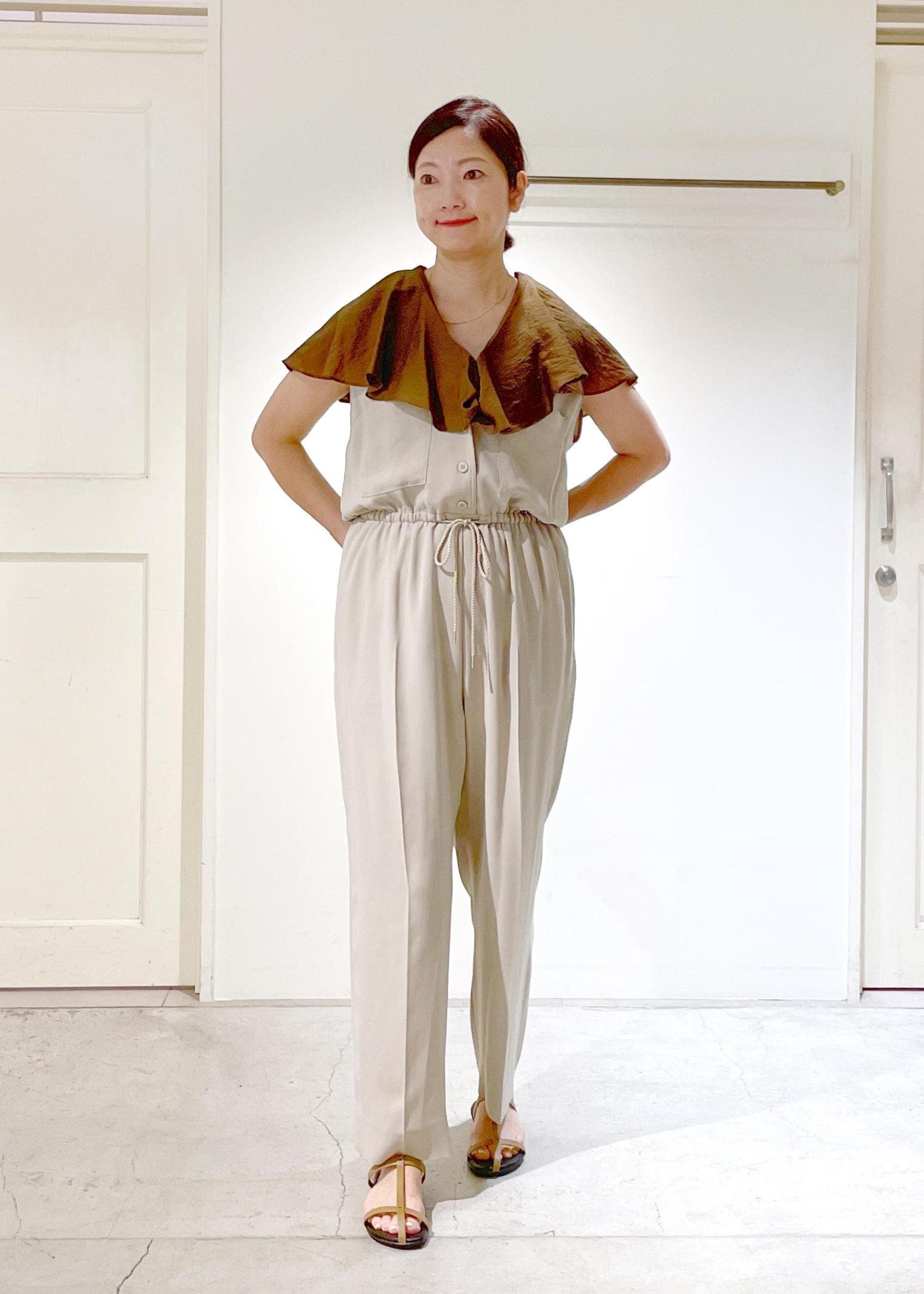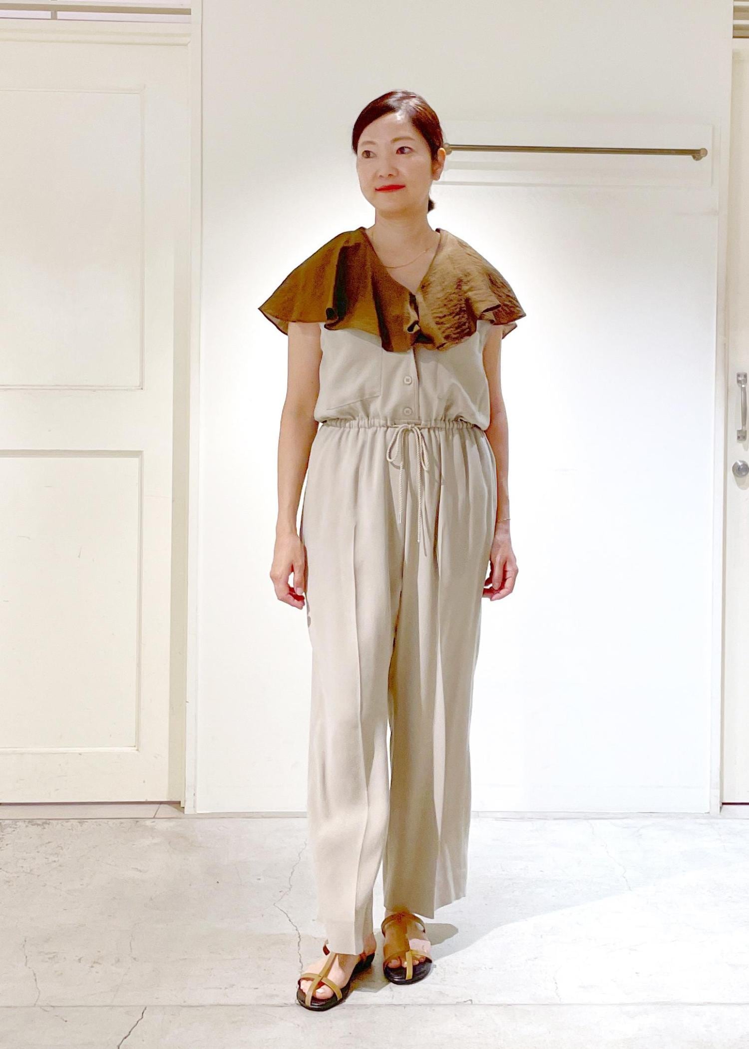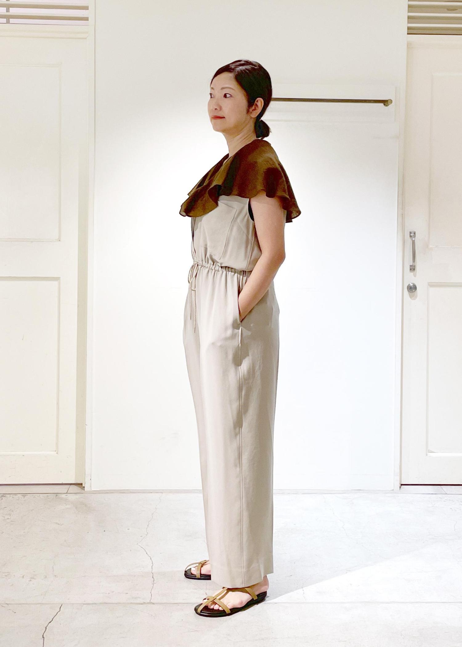 オールインワンにブラウンのラッフルブラウスをレイヤード。甘さとモードを掛け合わせてみました。