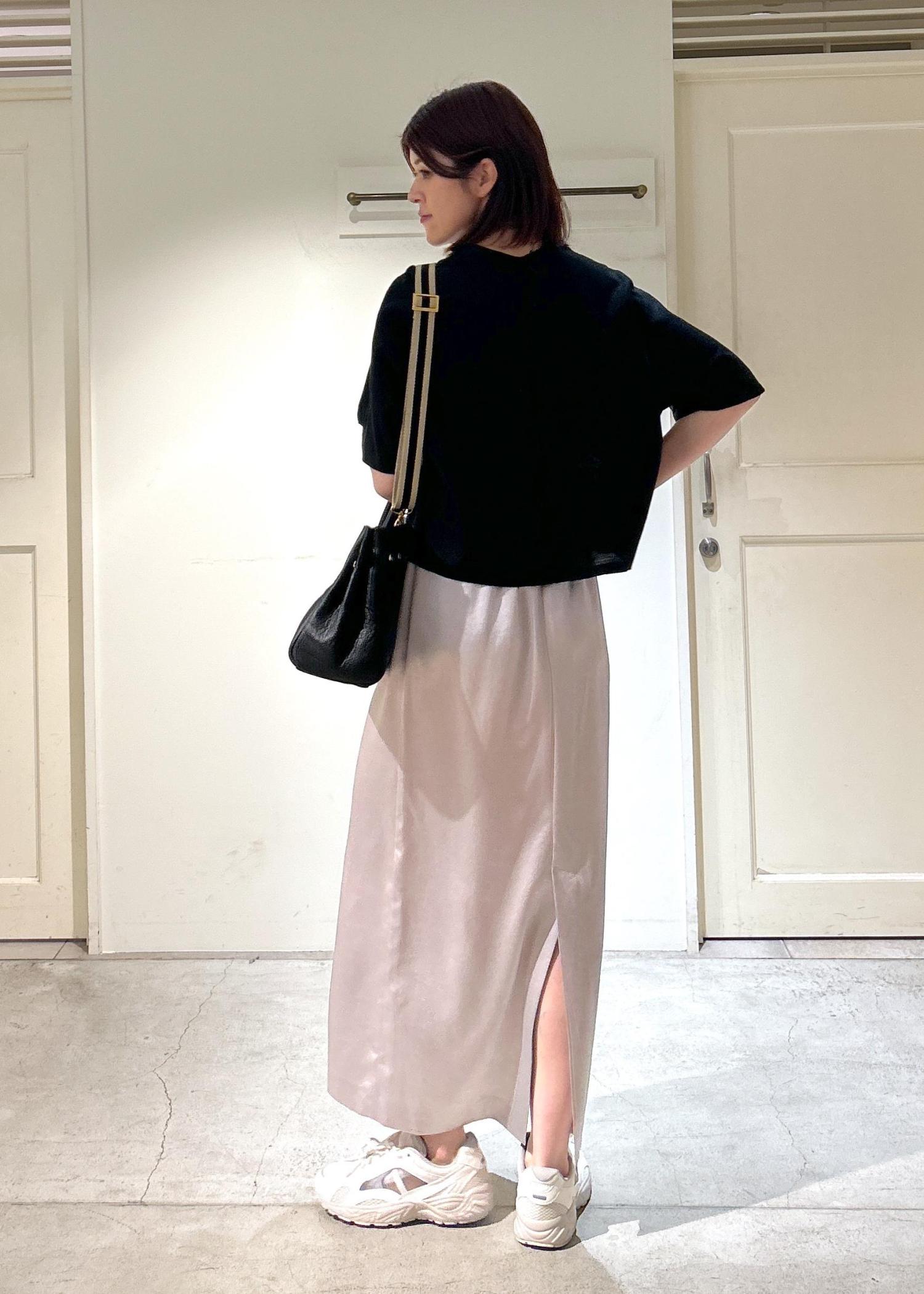 普段はLサイズを着用しています。タイトスカートですが、落ち感のある素材なので、体のラインは目立ちにくいです。サイズ展開が増えたので、高身長の方は大きめサイズが良いと思います。