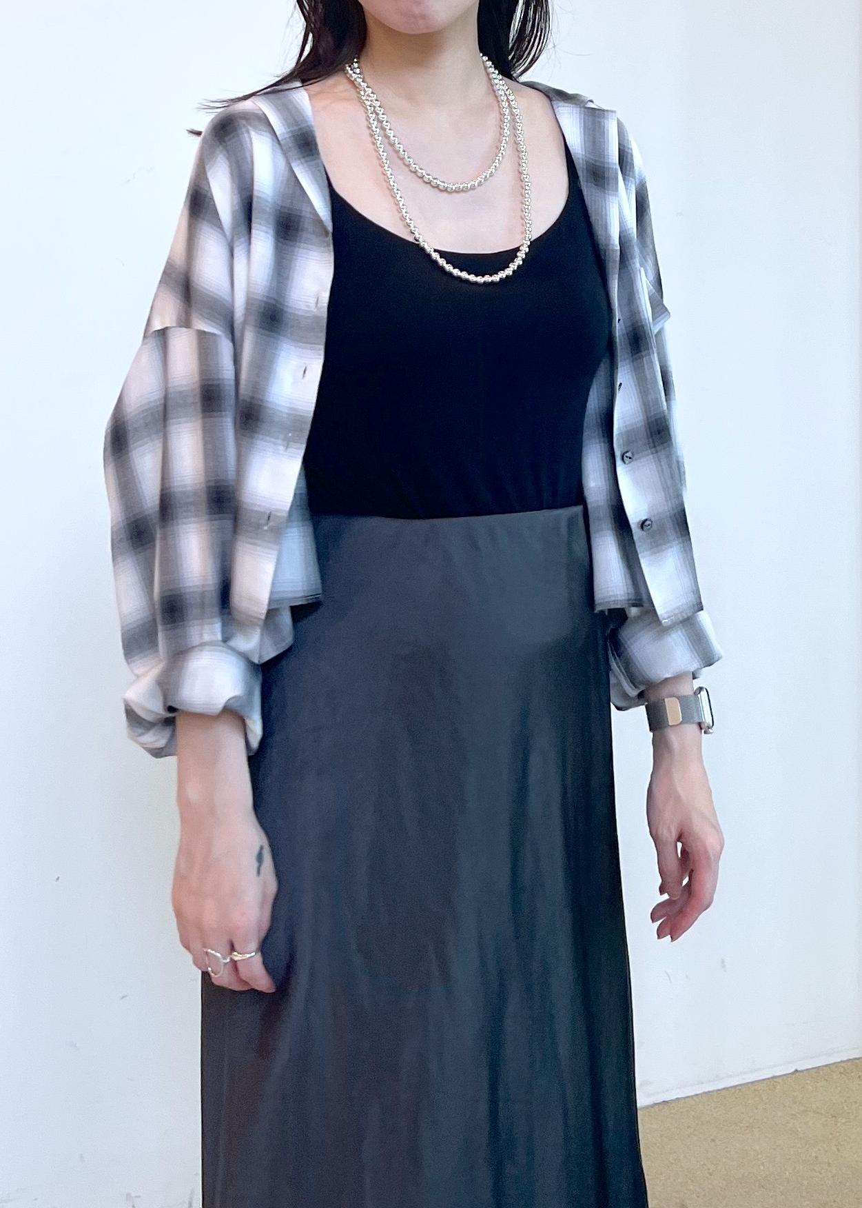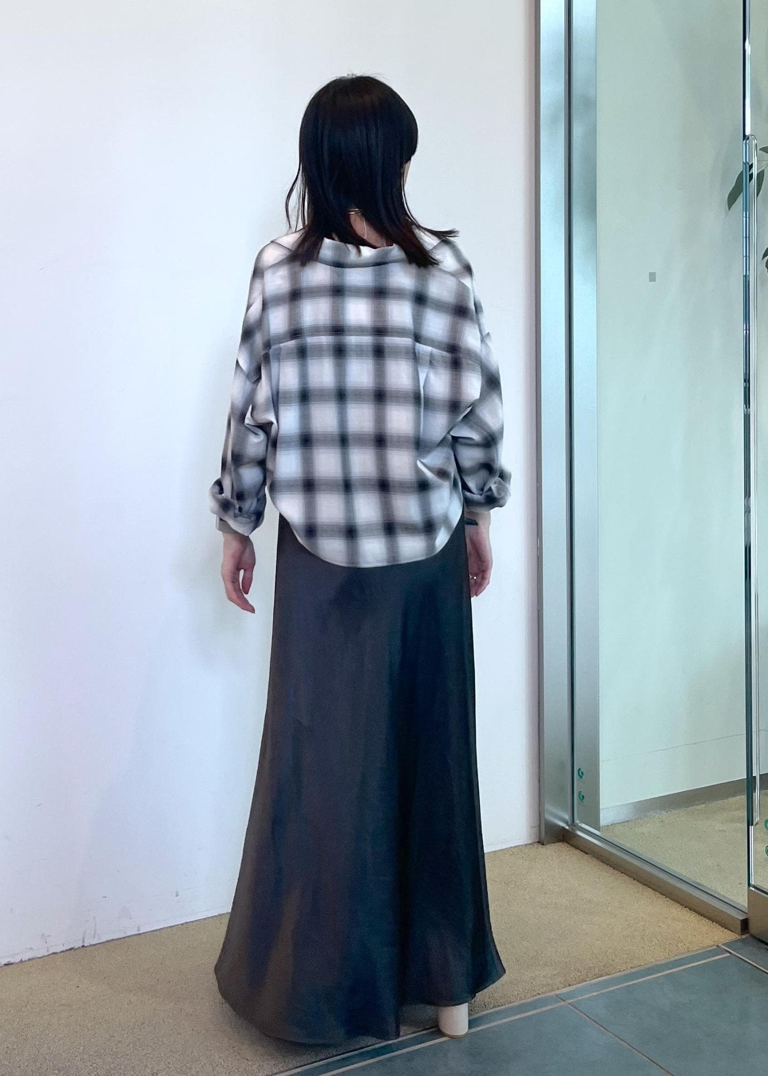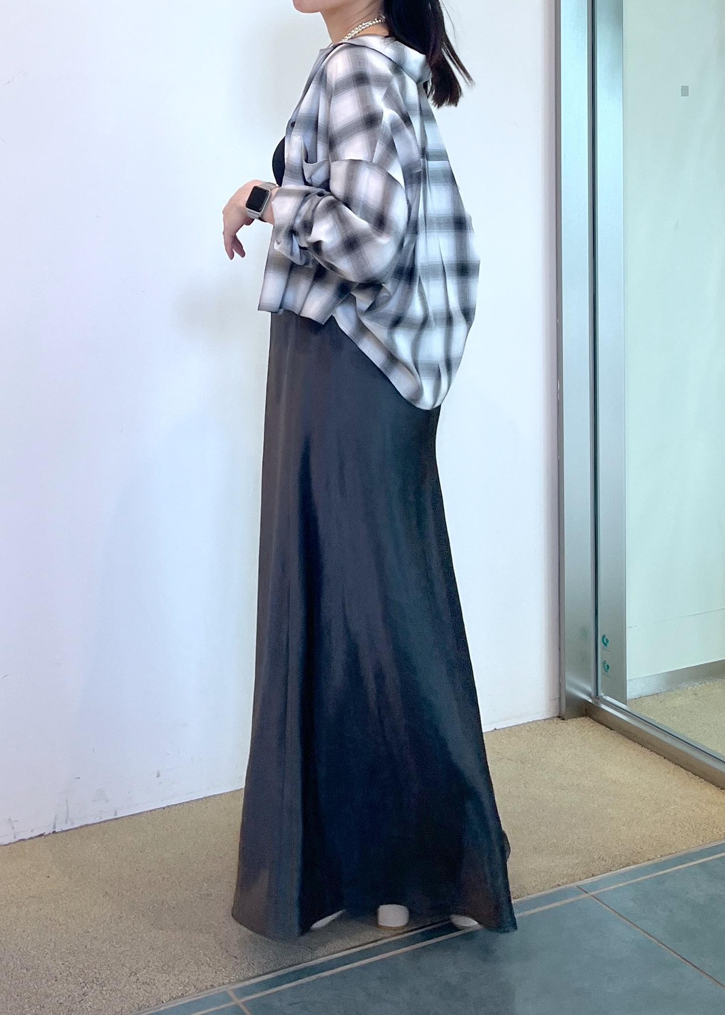 カジュアルなチェックシャツに光沢のあるスカートを合わせて大人っぽくまとめました。