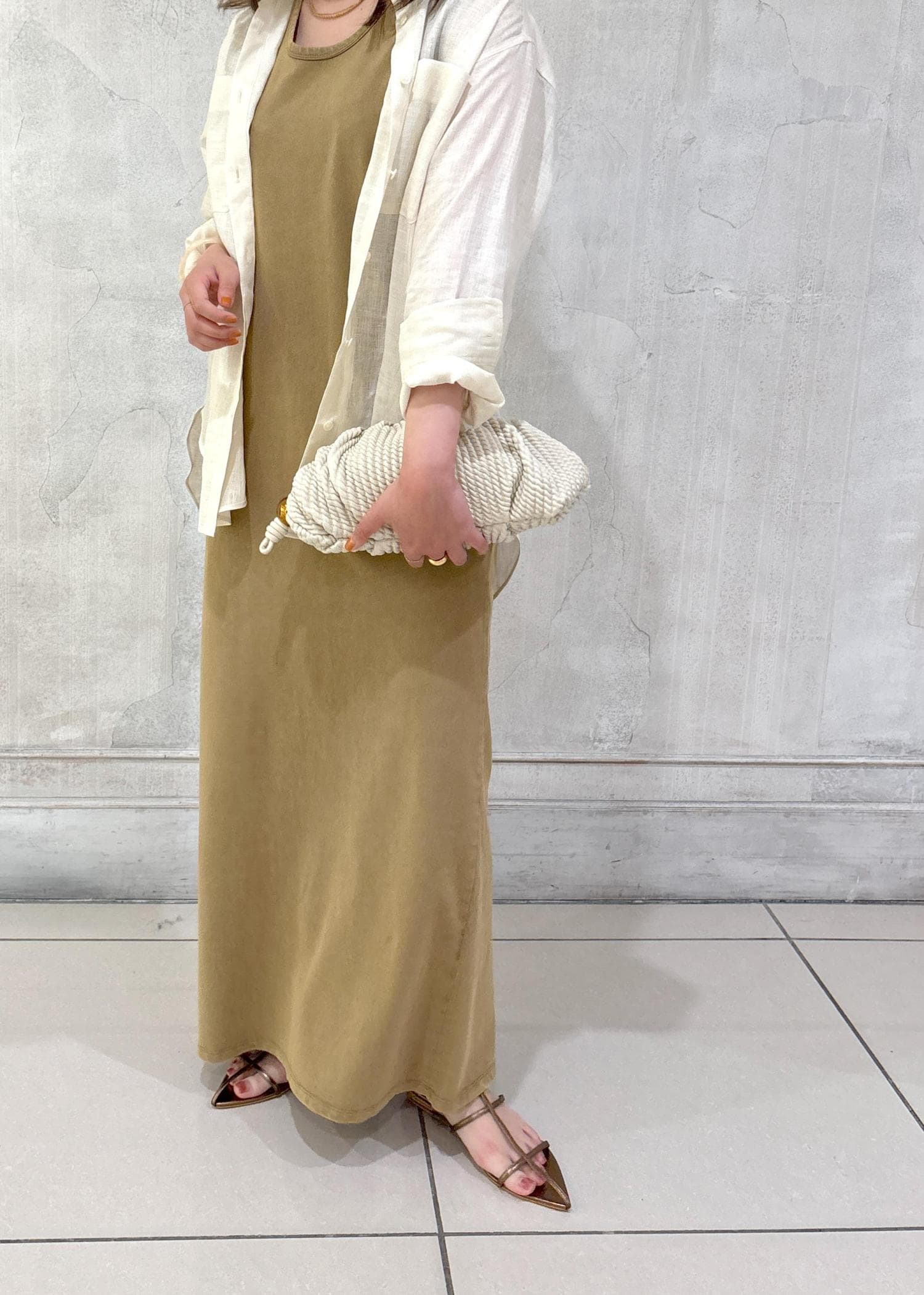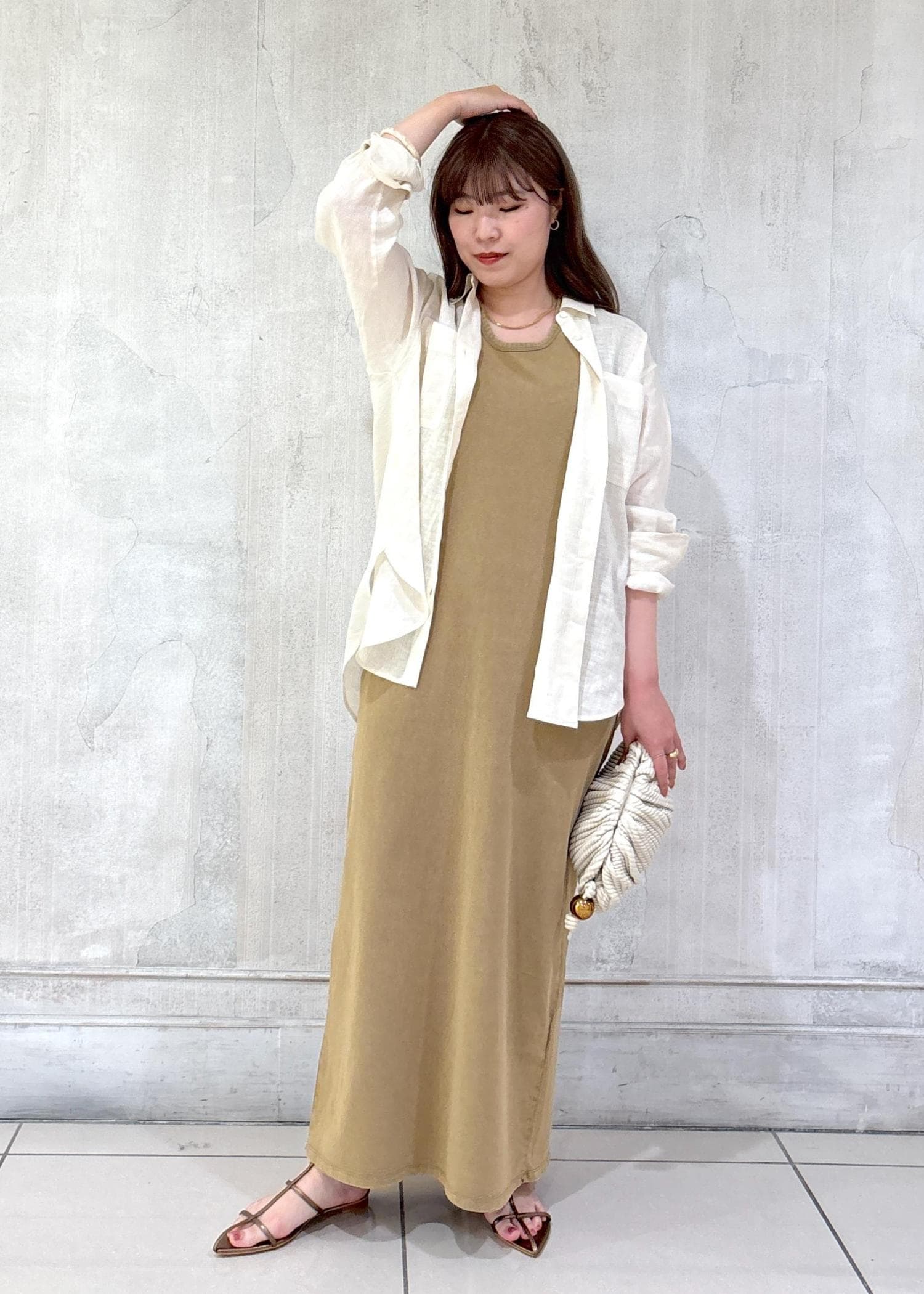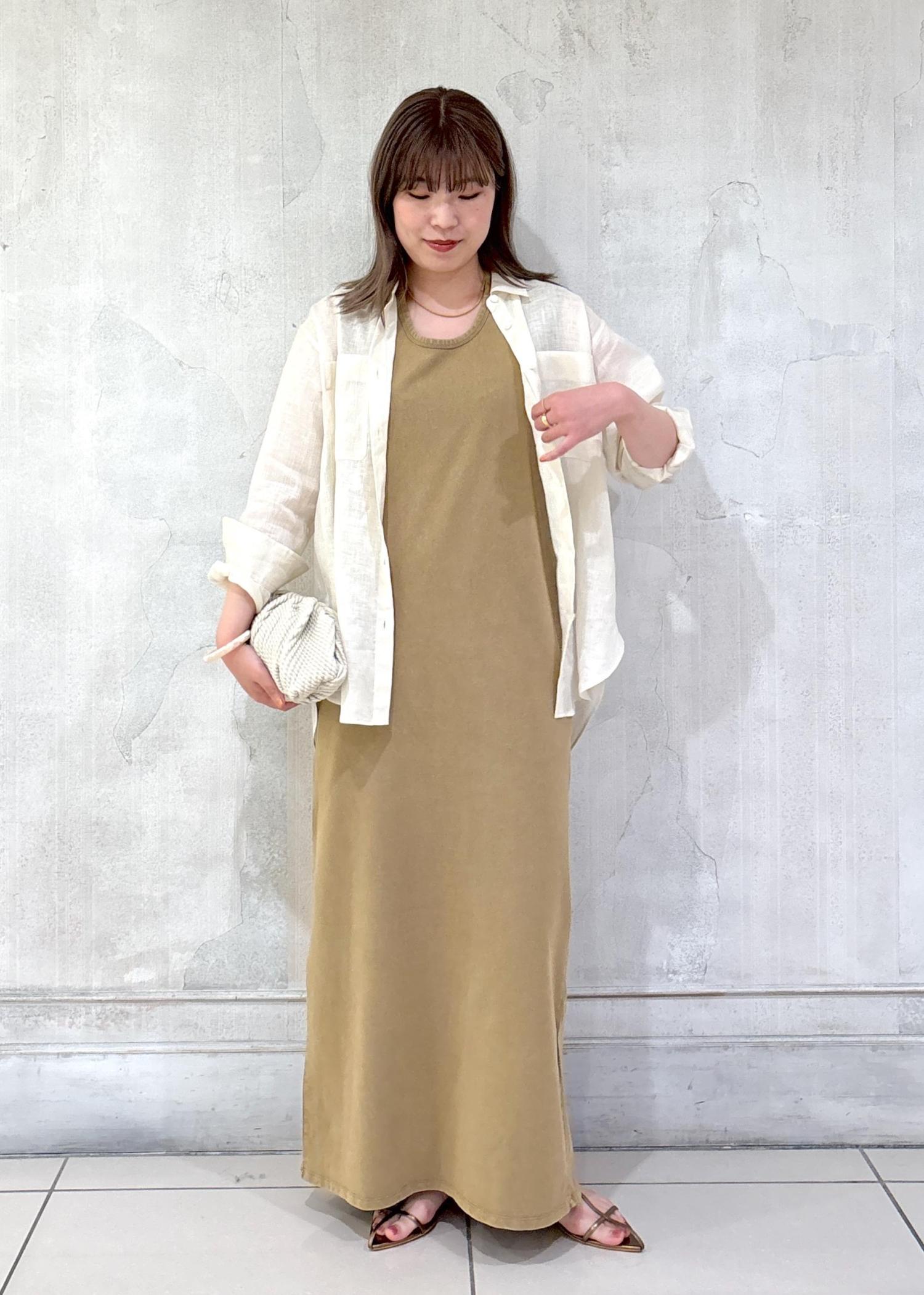 リラックス感のあるワンピとリネンシャツを合わせた、簡単おしゃれ見えスタイリング。