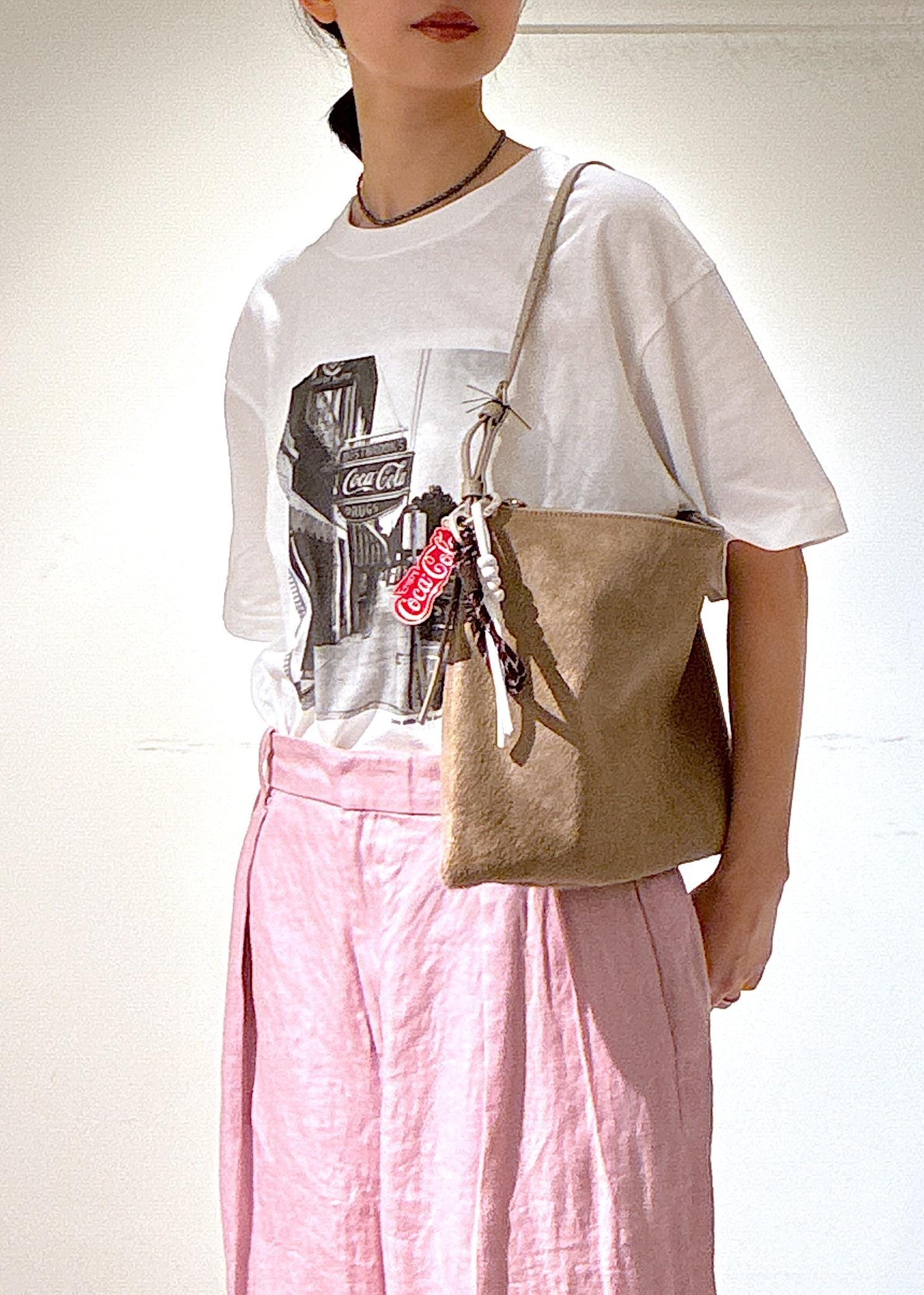 Coca-ColaのモノクロフォトTシャツとピンクのリネンタックパンツ、足元は私物のJOJO