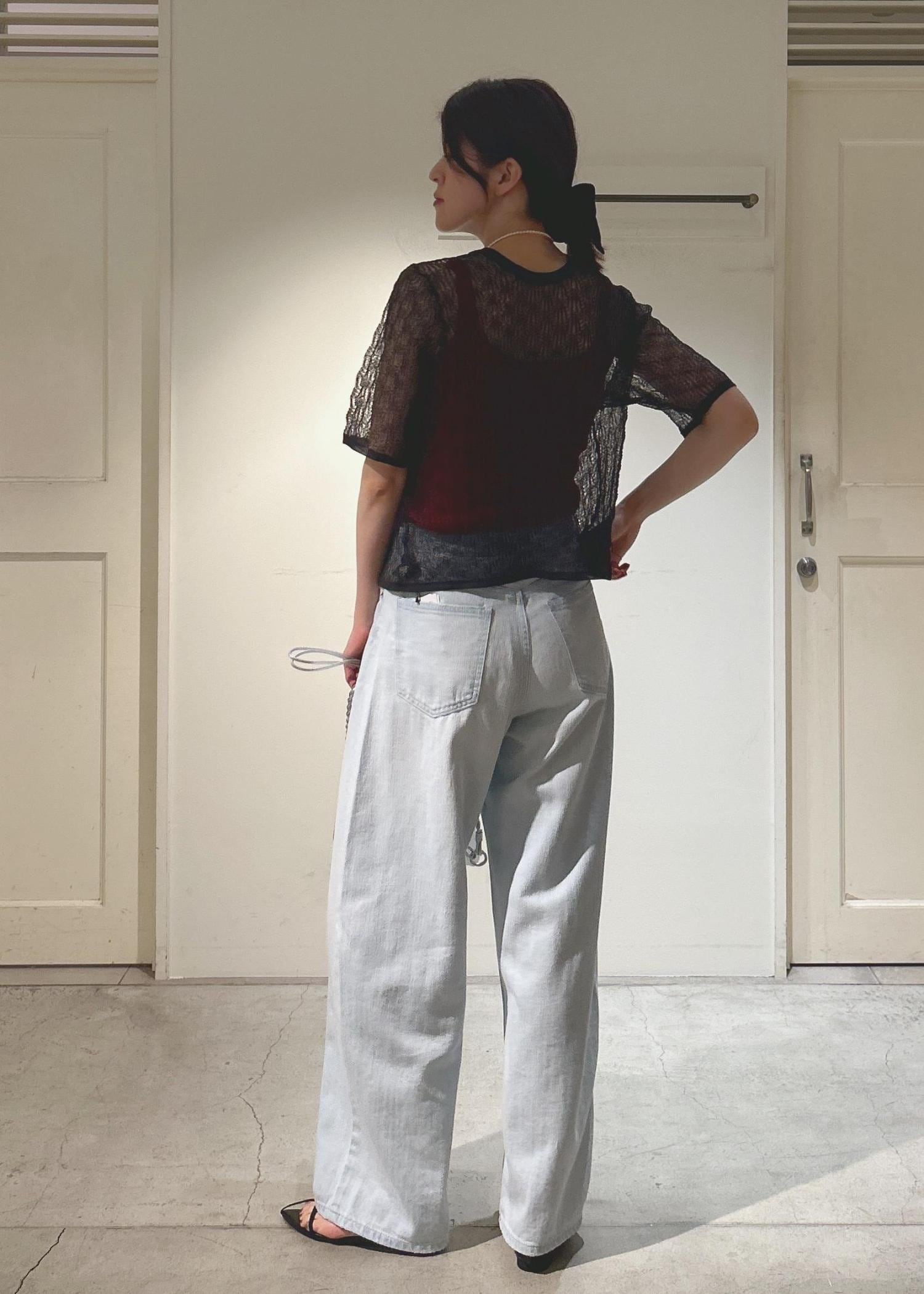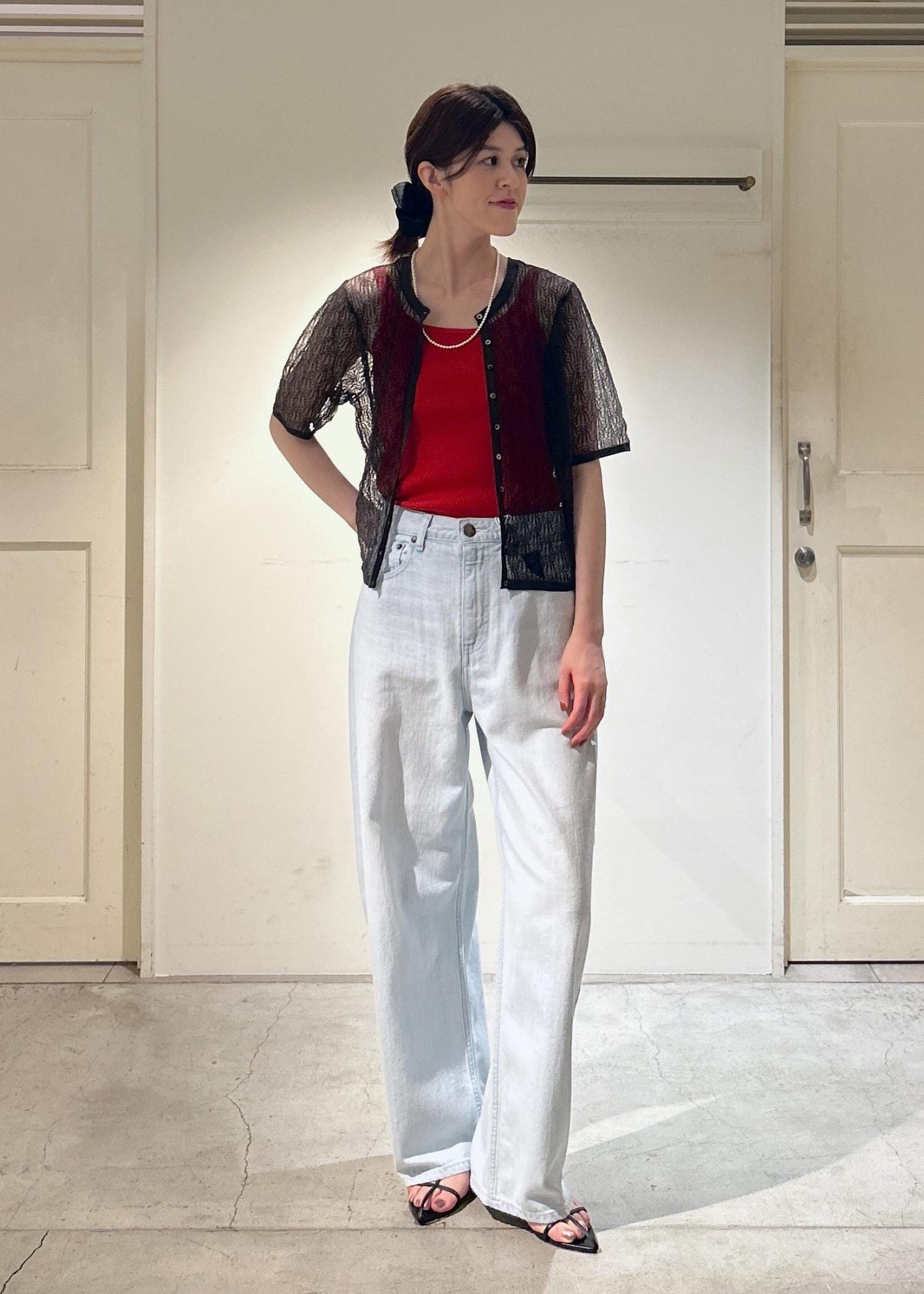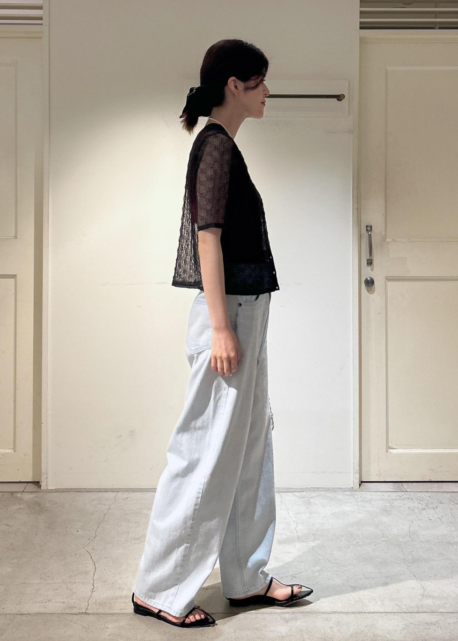 私は、フェミニンなシアーレースのトップスと合わせてみました。淡いブルーのカラーは合わせやすく、夏にぴったりです。
