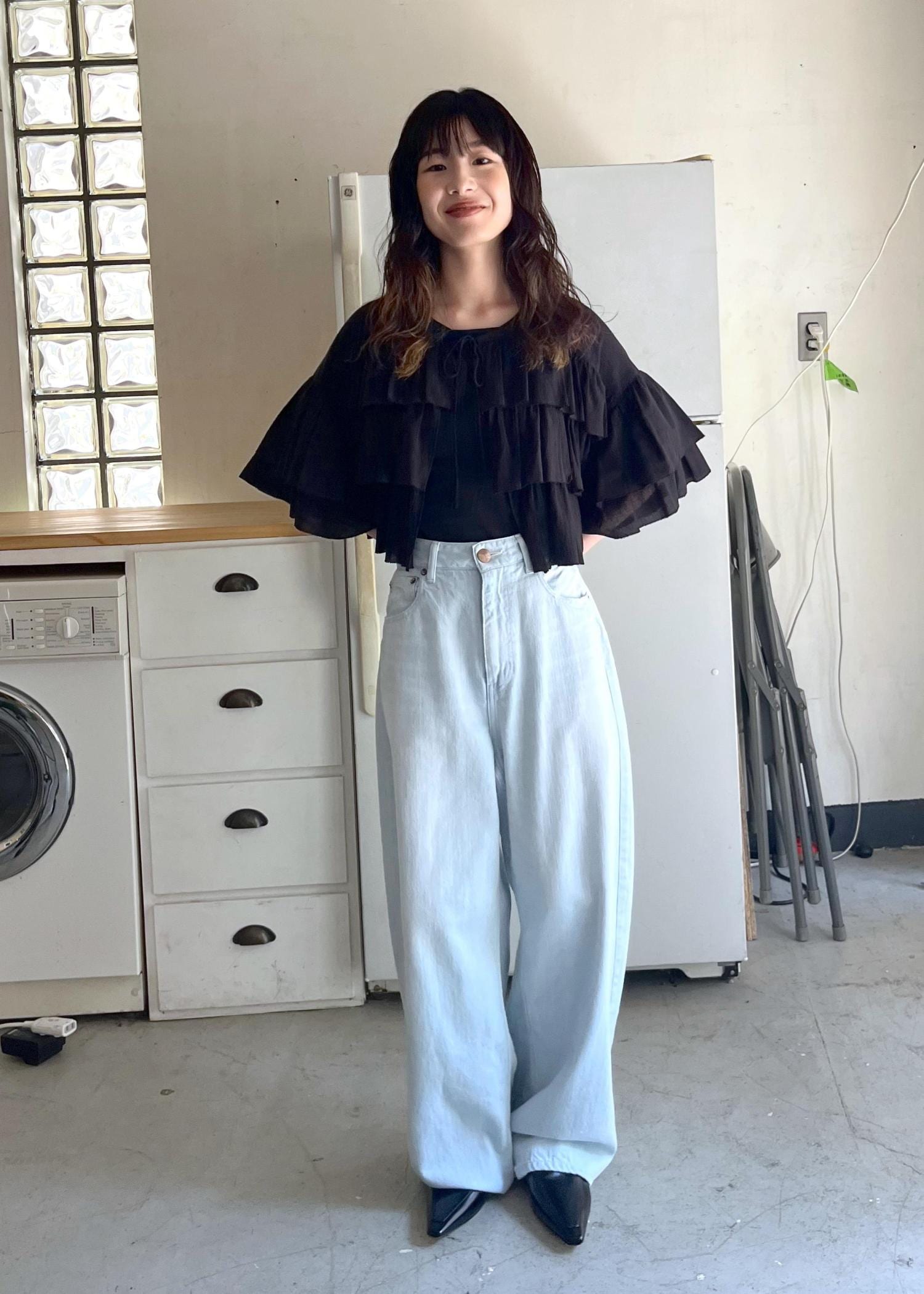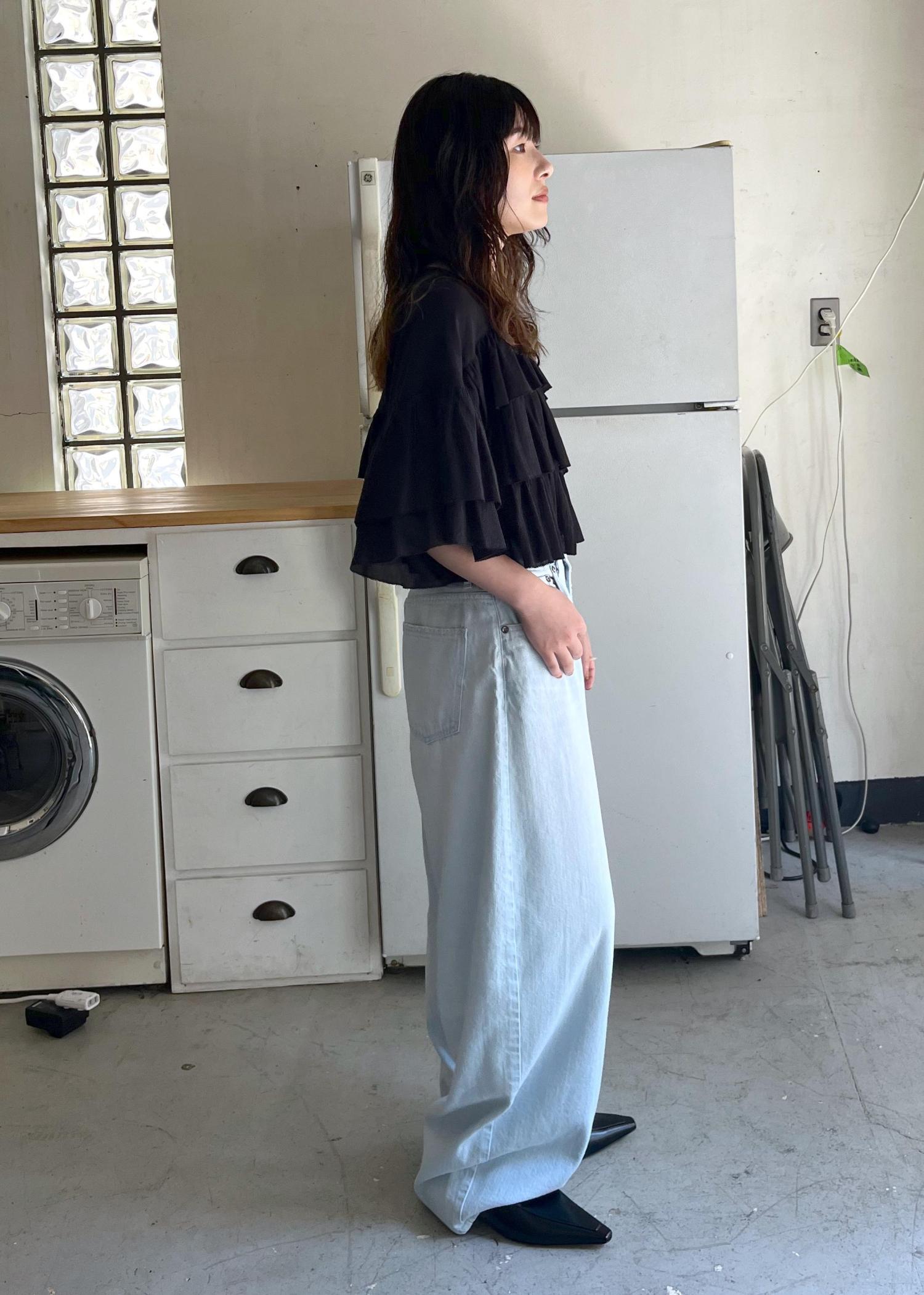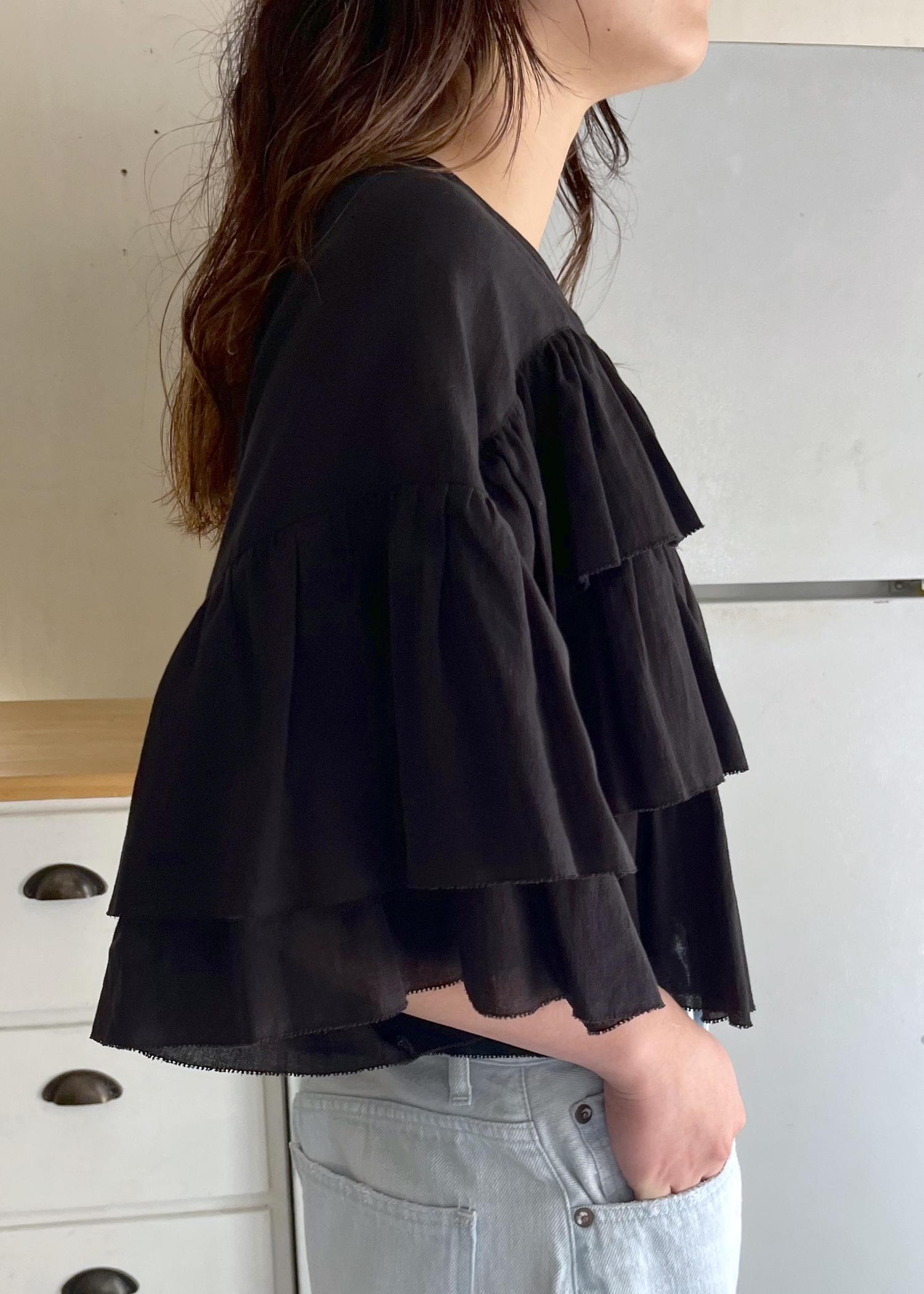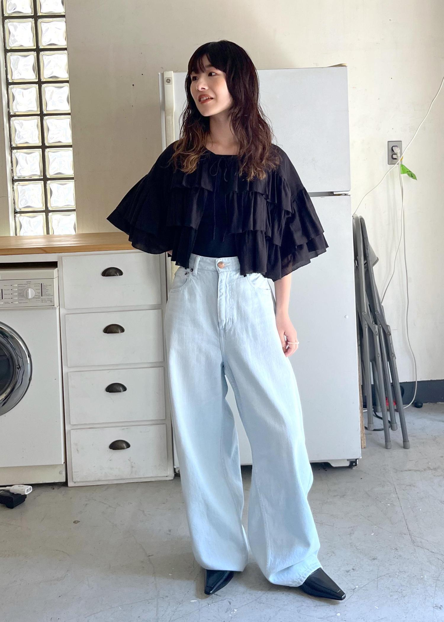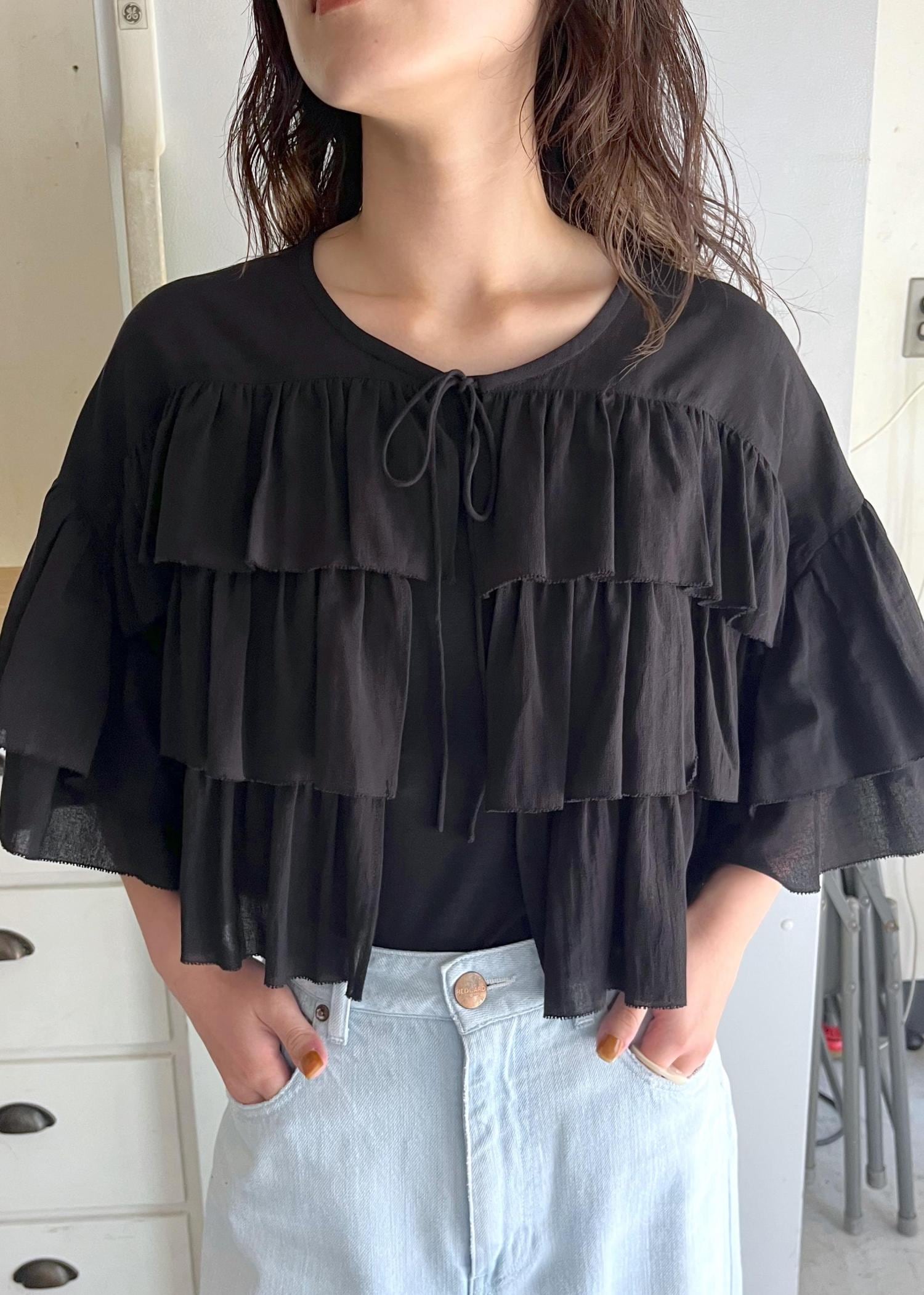 ワッシャー感のあるコットン素材。フリルですが軽く、動きのあるデザインです。羽織としてレイヤードして長く着ていただけます◎