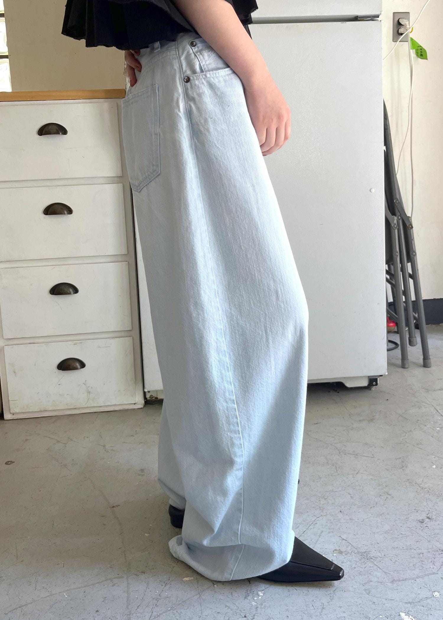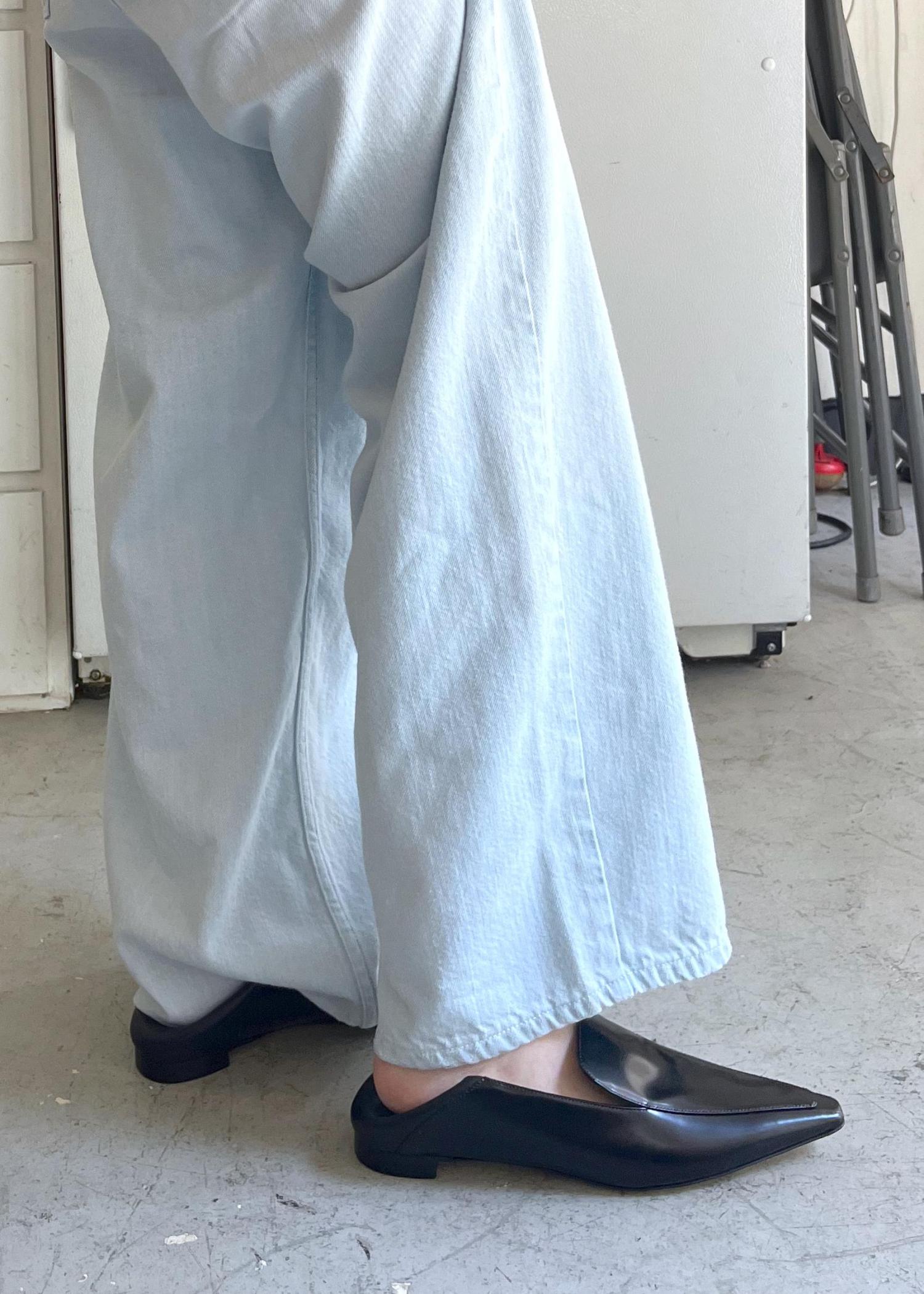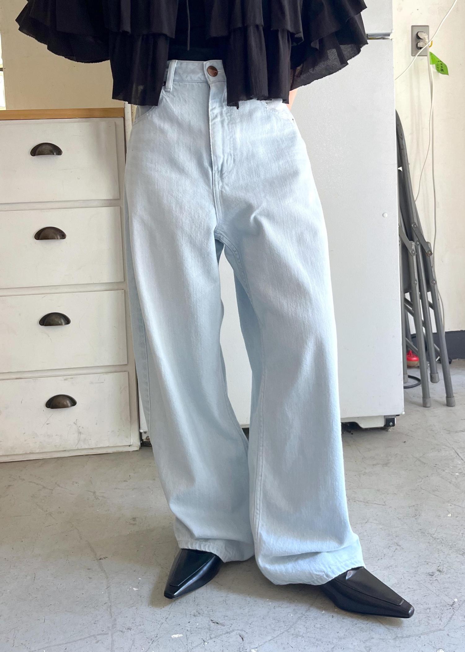 柔らかいデニム地でとてと履きやすいです。綺麗なカーブシルエットでワイドですがすっきりとした見た目になります。