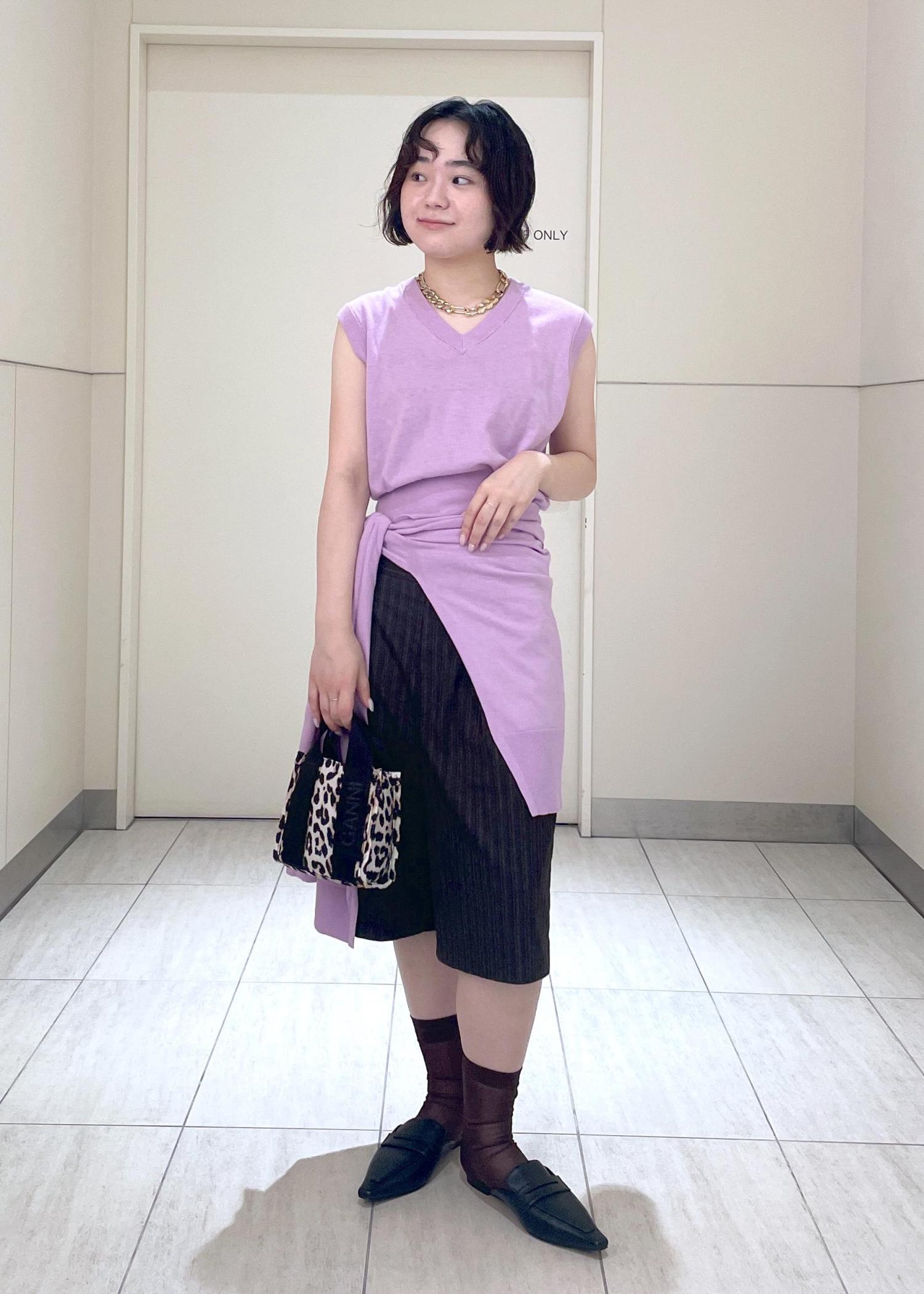 トップスはストールがセットでついているベストを着てみました!ストールは、腰巻きにしてアクセントに。カラーも流行りのペールカラーで流行も抑えてみました。