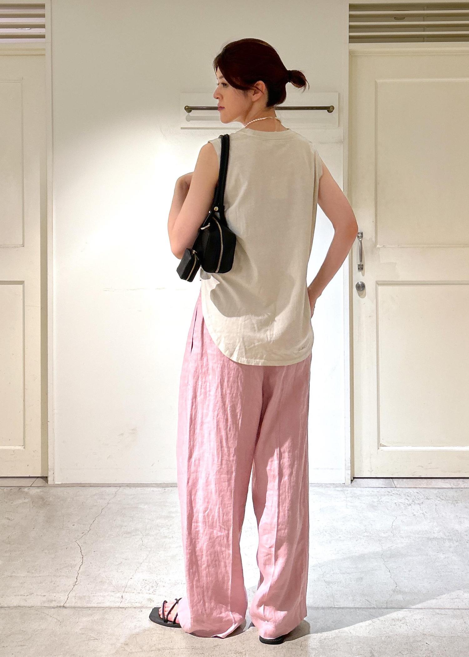 私は、リネンのタックパンツと合わせてカジュアルにまとめてみました。カラーアイテムとも相性バッチリです。