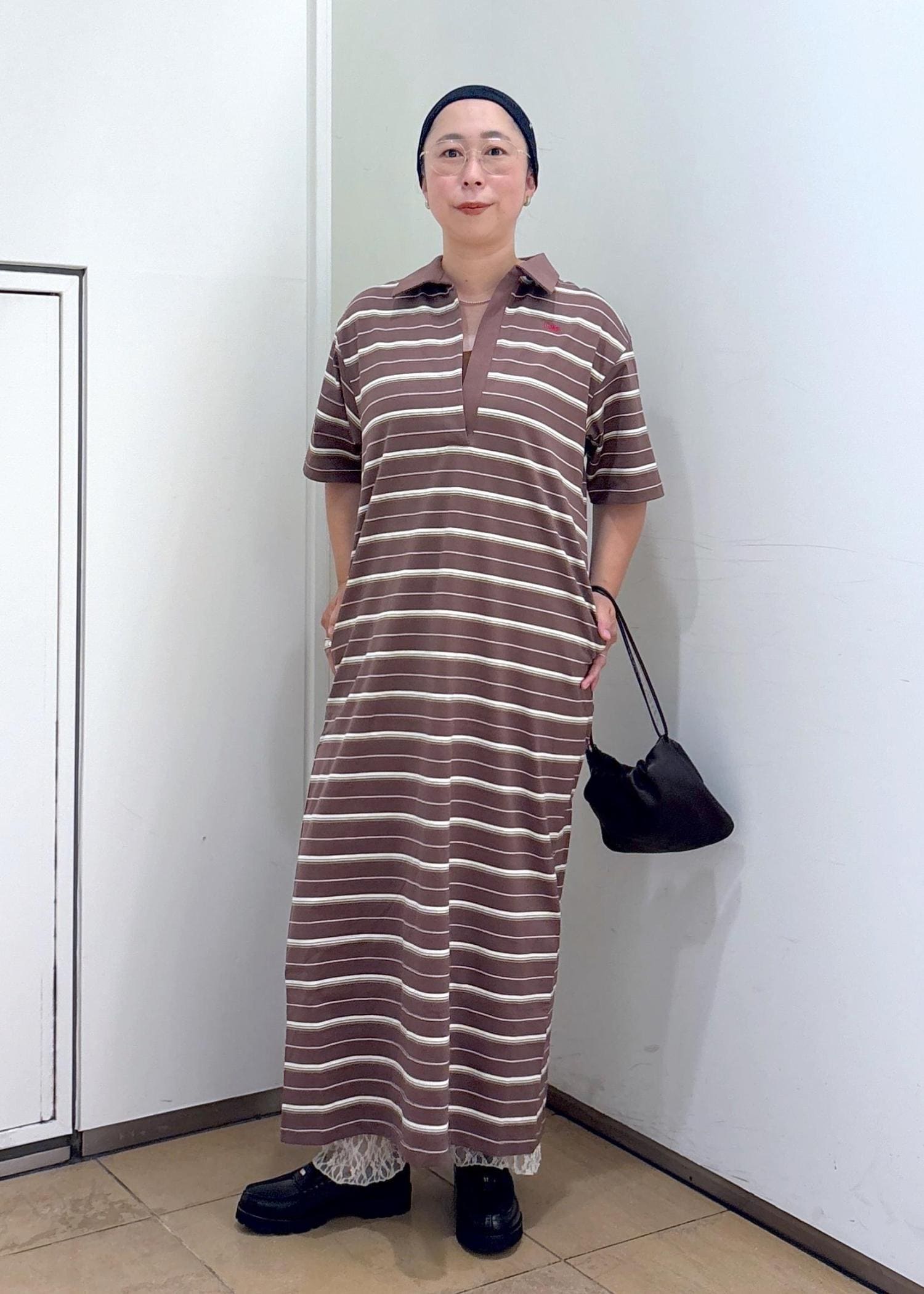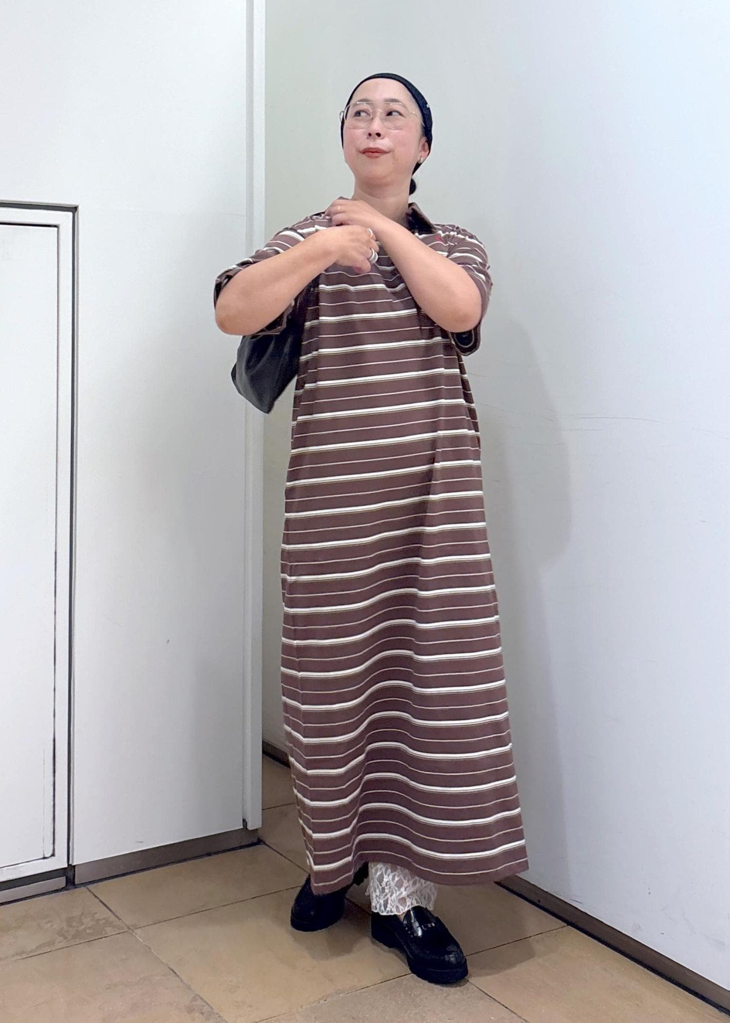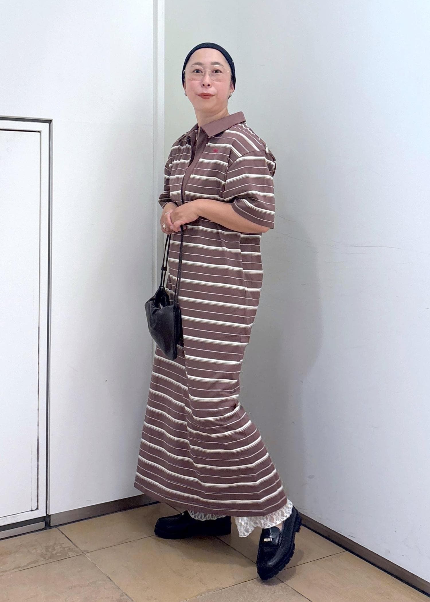 1970年代のサーフカルチャーから着想を得たヴィンテージライクなマルチボーダーワンピースに、秋のエッセンスを加えて、レースパンツとローファーをプラスしてみました。