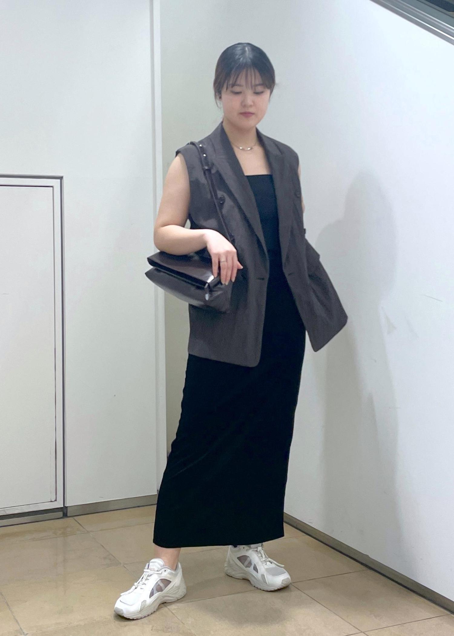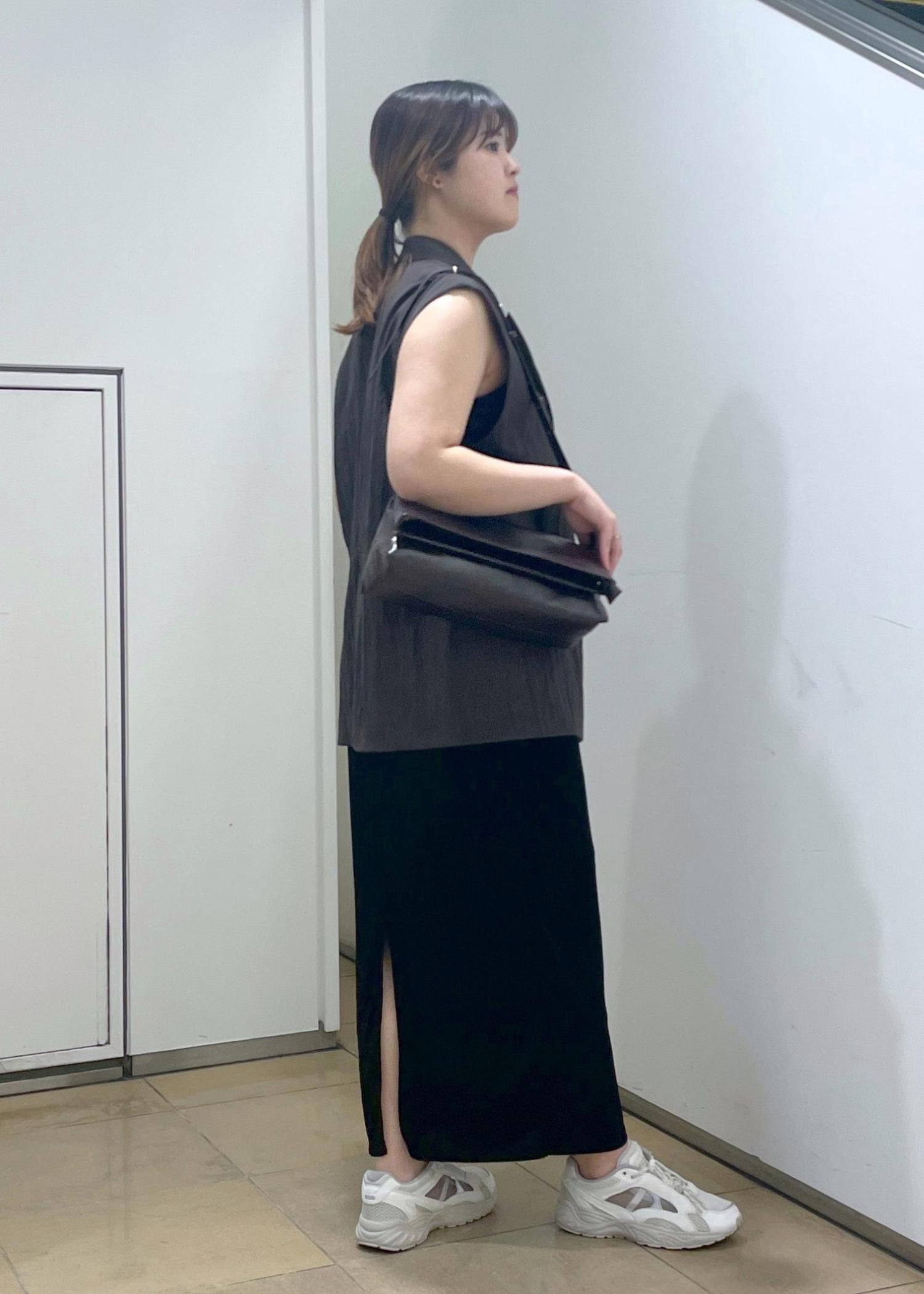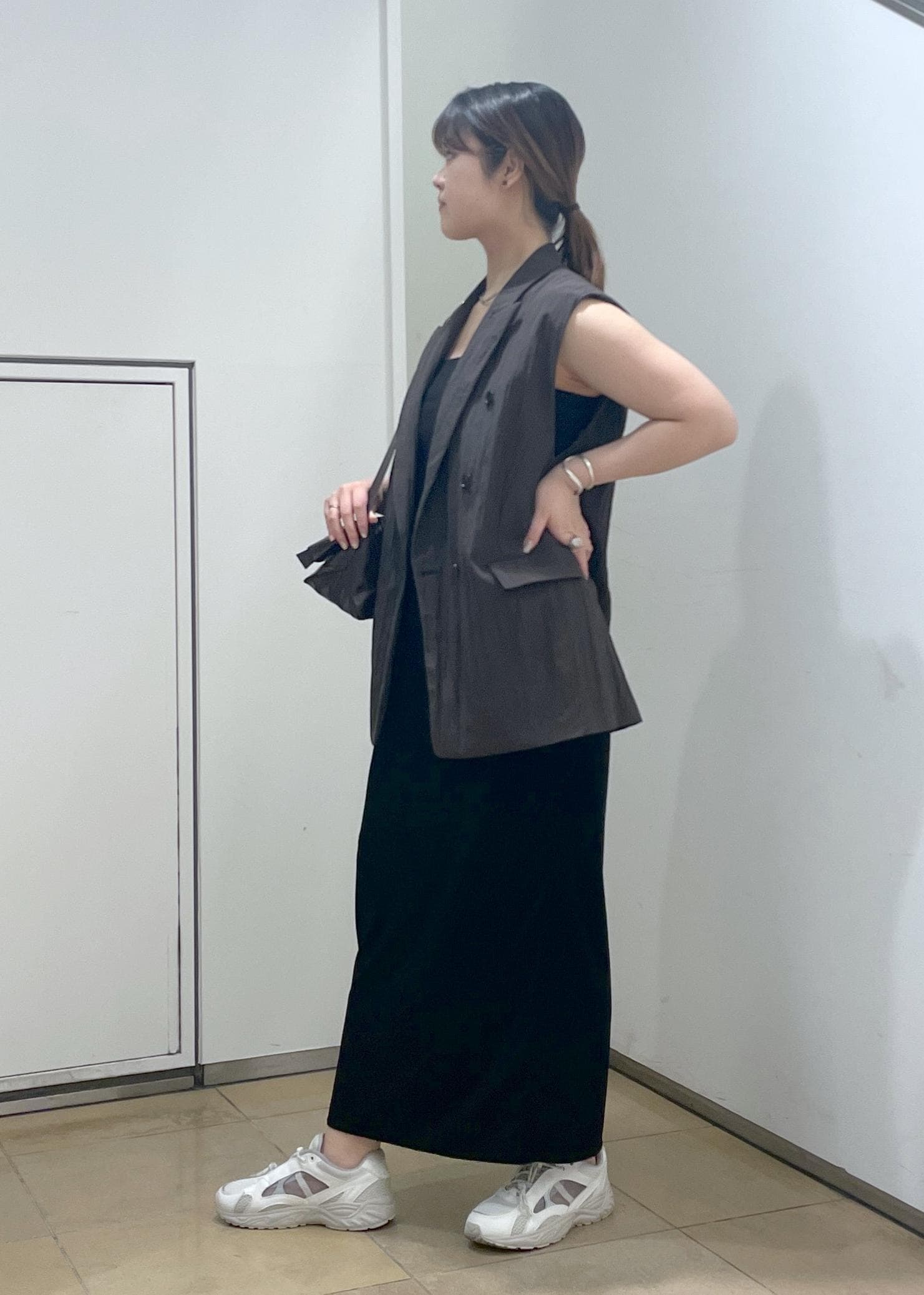 ヒップが隠れるくらいの丈で、肩がやや広い作りなので二の腕がスッキリ見え、体型カバーもできます。