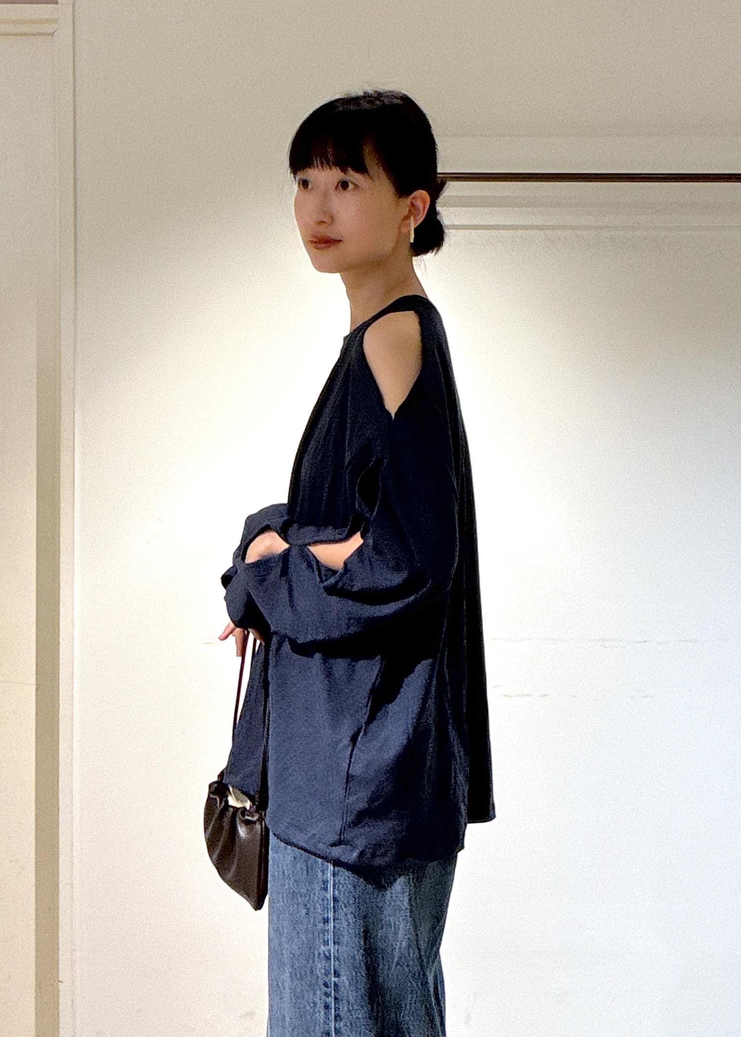 ネイビーのトップスが個人的に新鮮で、デザインも素敵です。