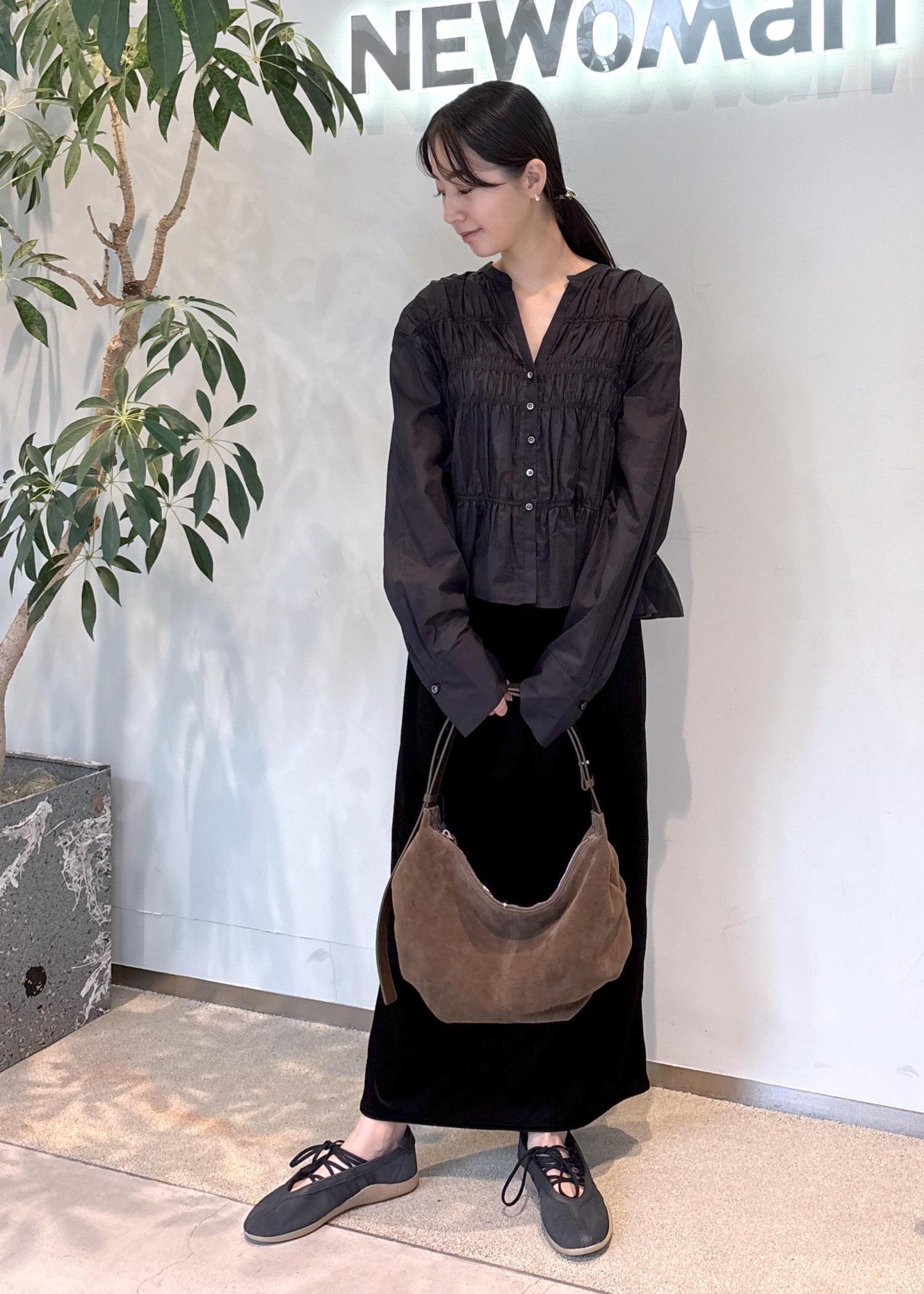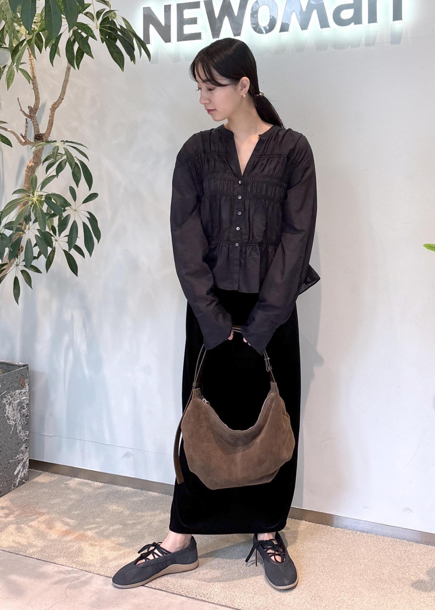 トップスのシャーリングデザインが単調になりがちな黒コーデに立体感を与え、女性らしさを出しました。
