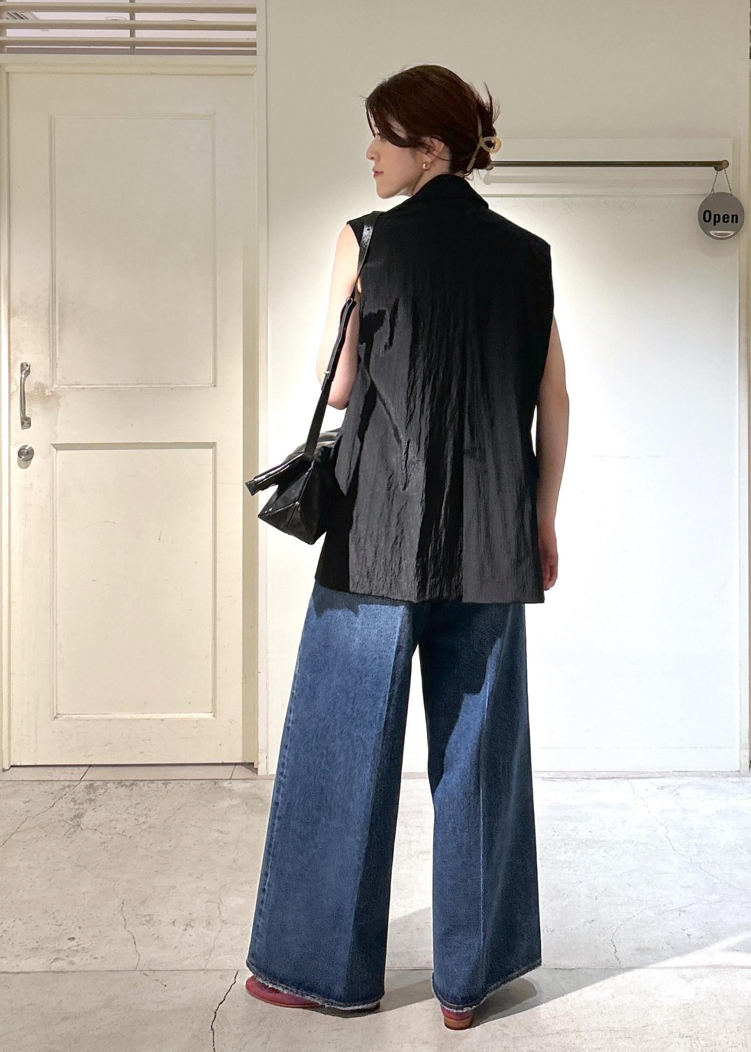 私はバギーデニムと合わせて、カジュアルにまとめてみました。ジレを合わせることで上品さがプラスされます!