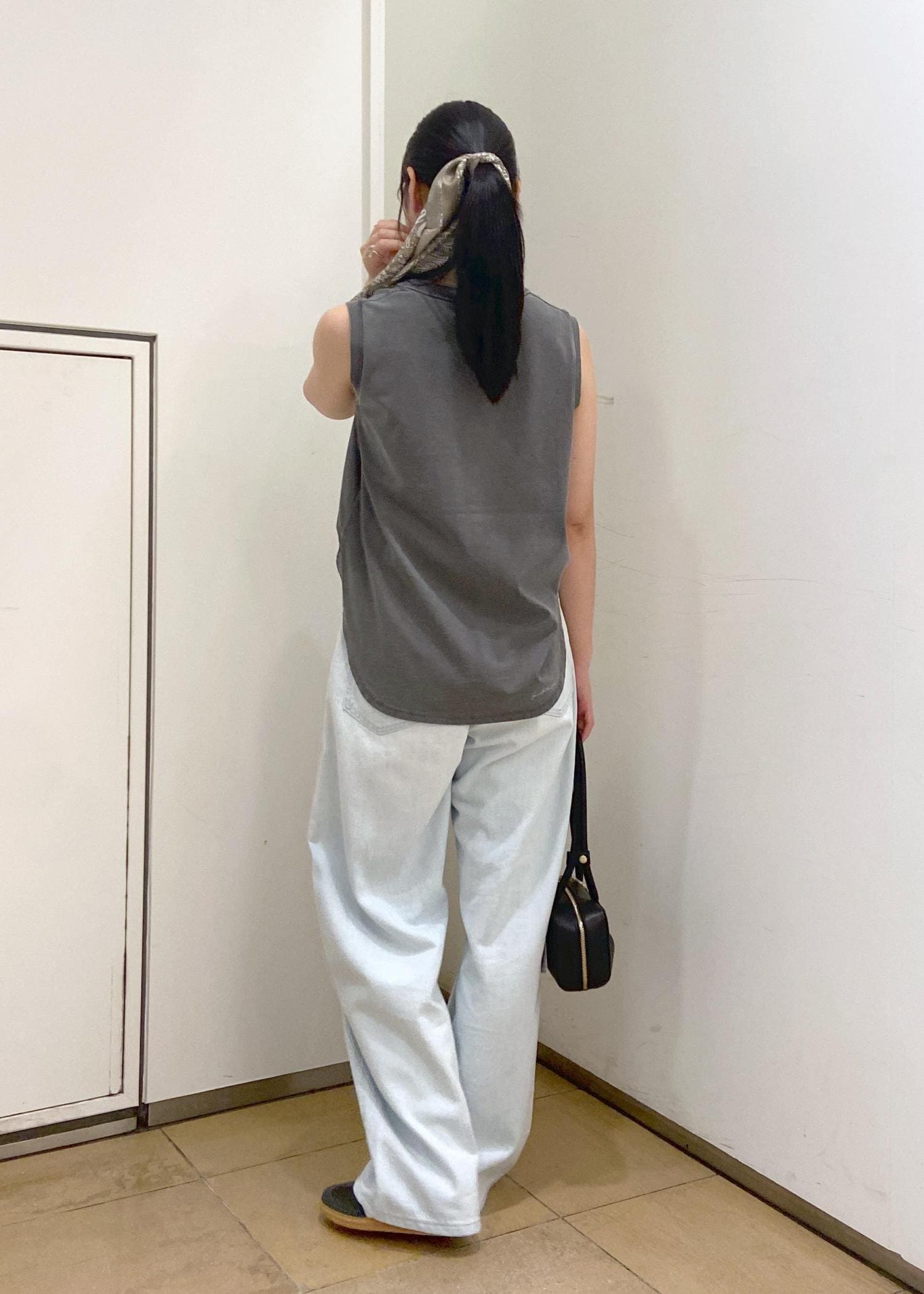 スカーフをアクセントにすると、シンプルなカジュアルスタイルがぐっとおしゃれに。
