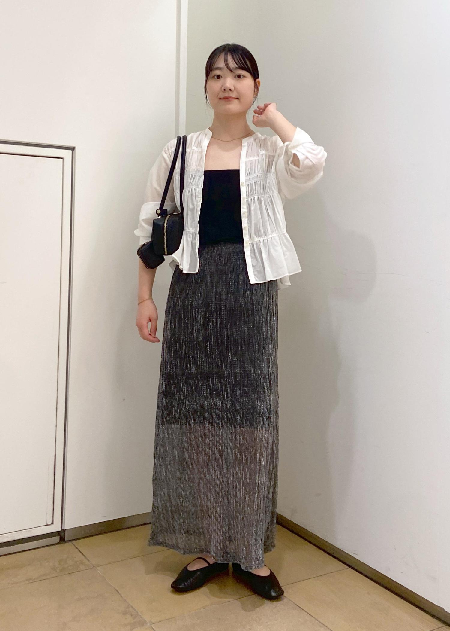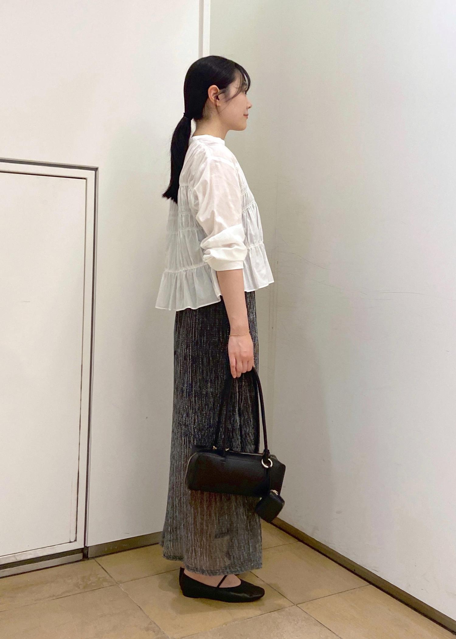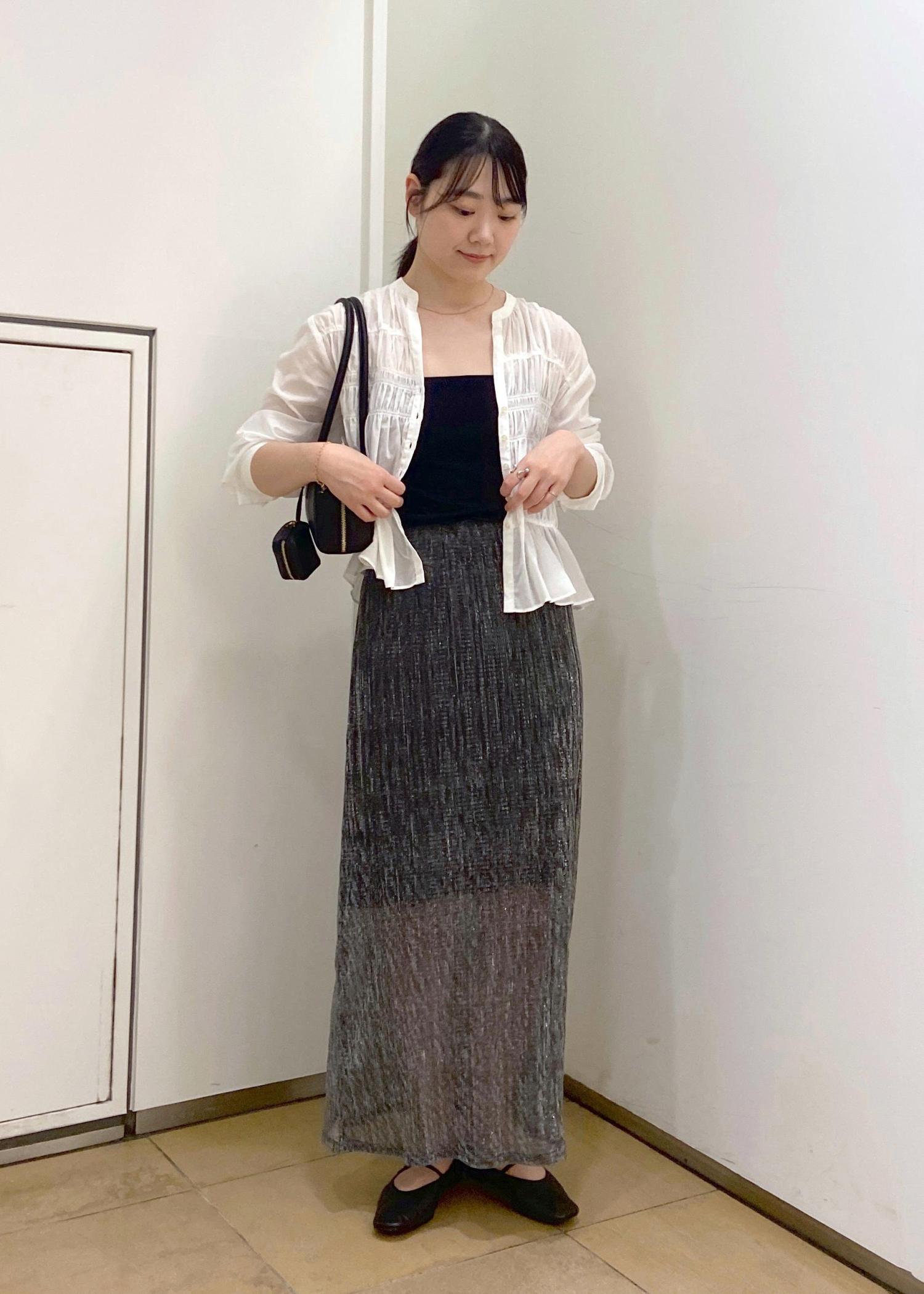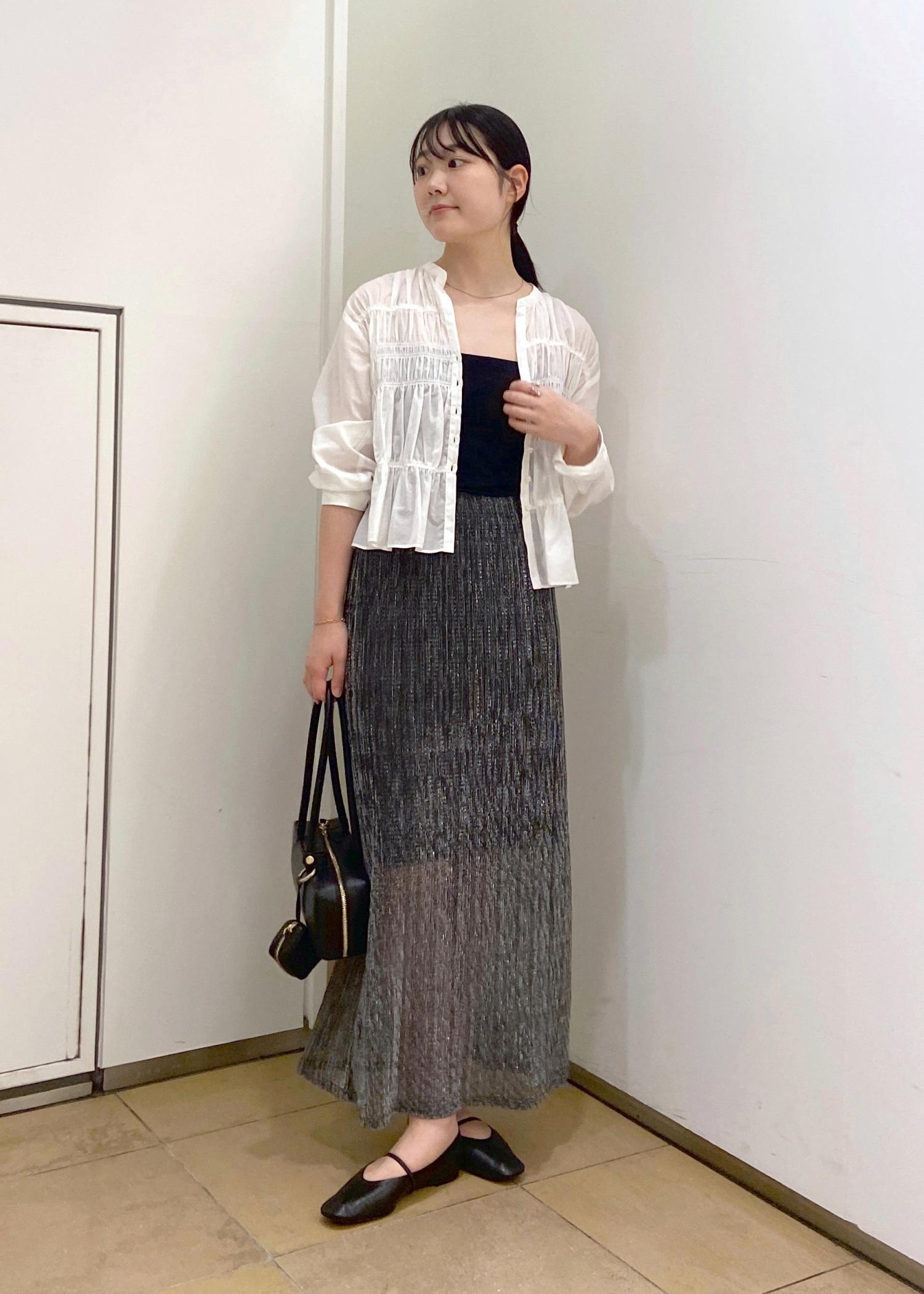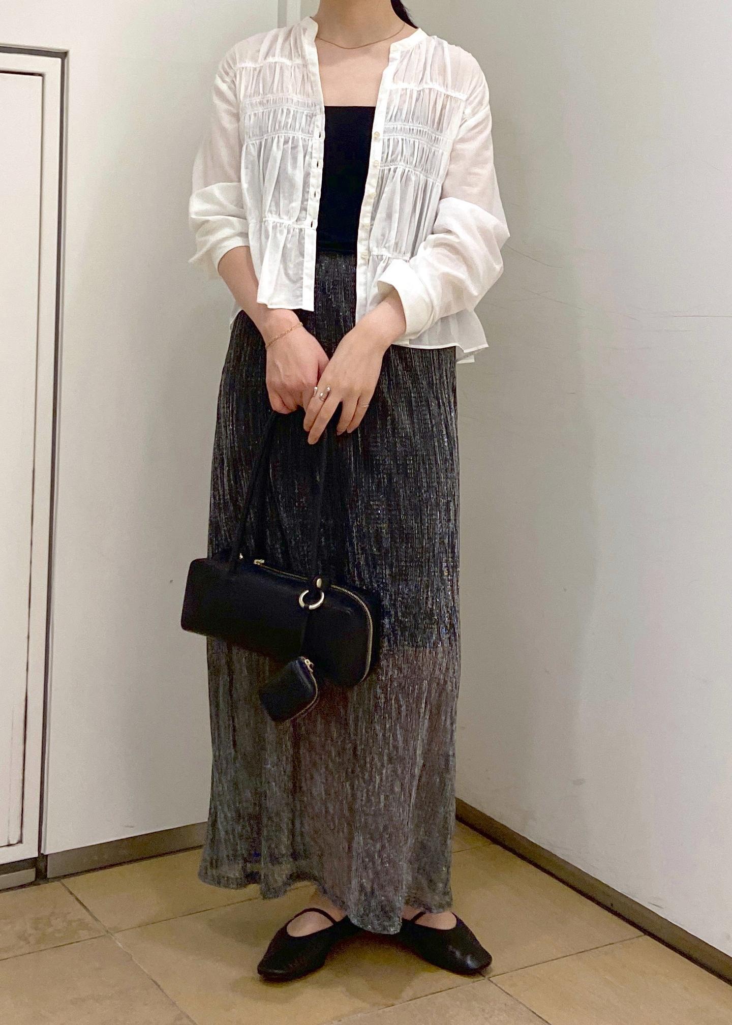 シアーラメスカートが一枚で華やかなのでモノトーンコーデにしました。