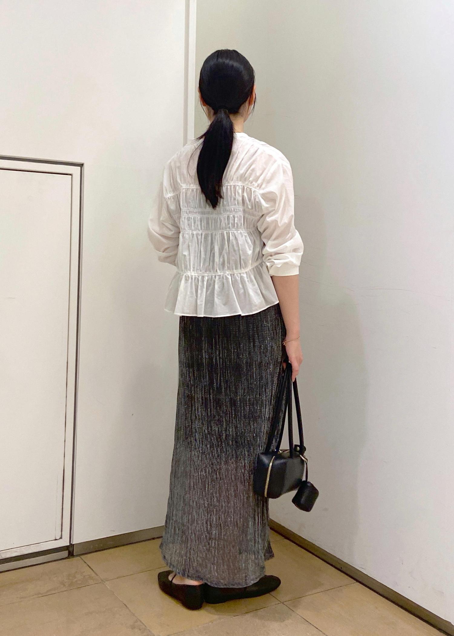 着丈は腰骨あたりの程よくコンパクトなサイズ感。ギャザーが体のラインを拾いにくく、カバーしてくれます。