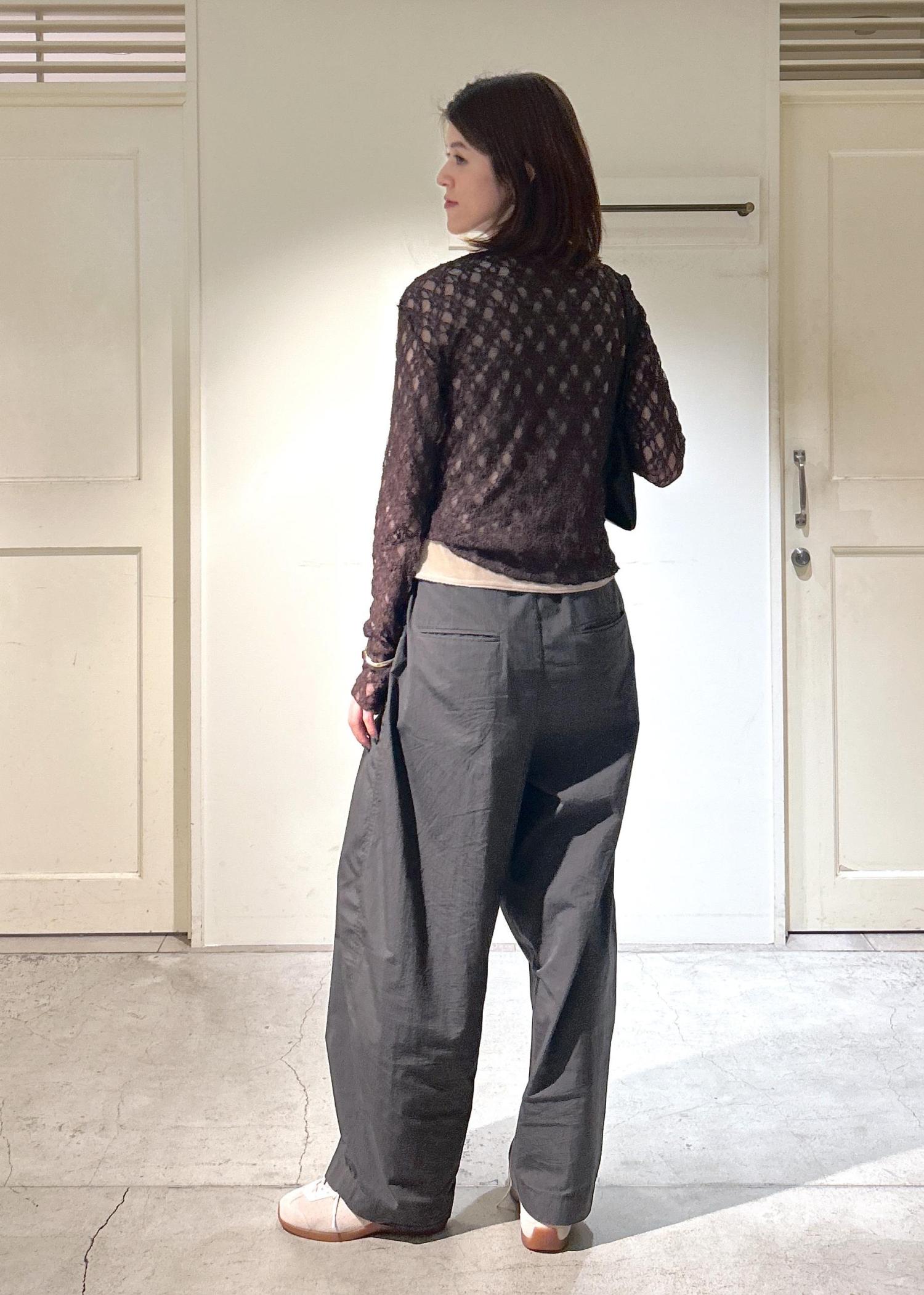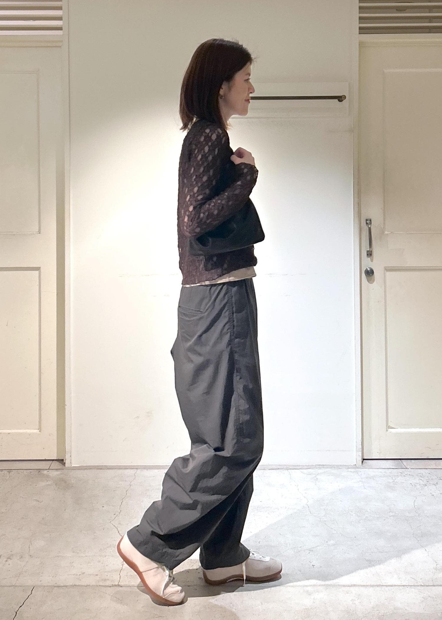 身長171cmで、丈は足の甲につくくらいの長さです。オールゴムなので履きやすく、ゆったりしたシルエットなので体のラインを拾いません。緩やかなカーヴィシルエットです。