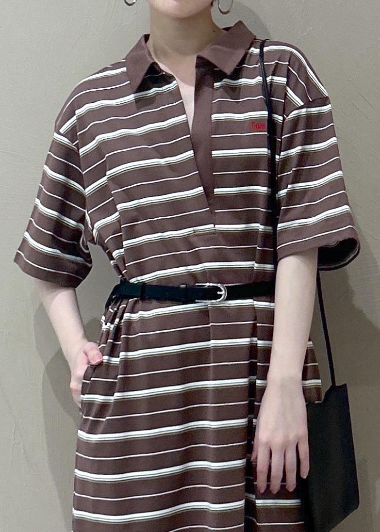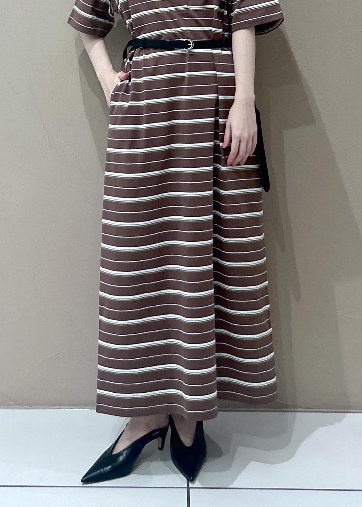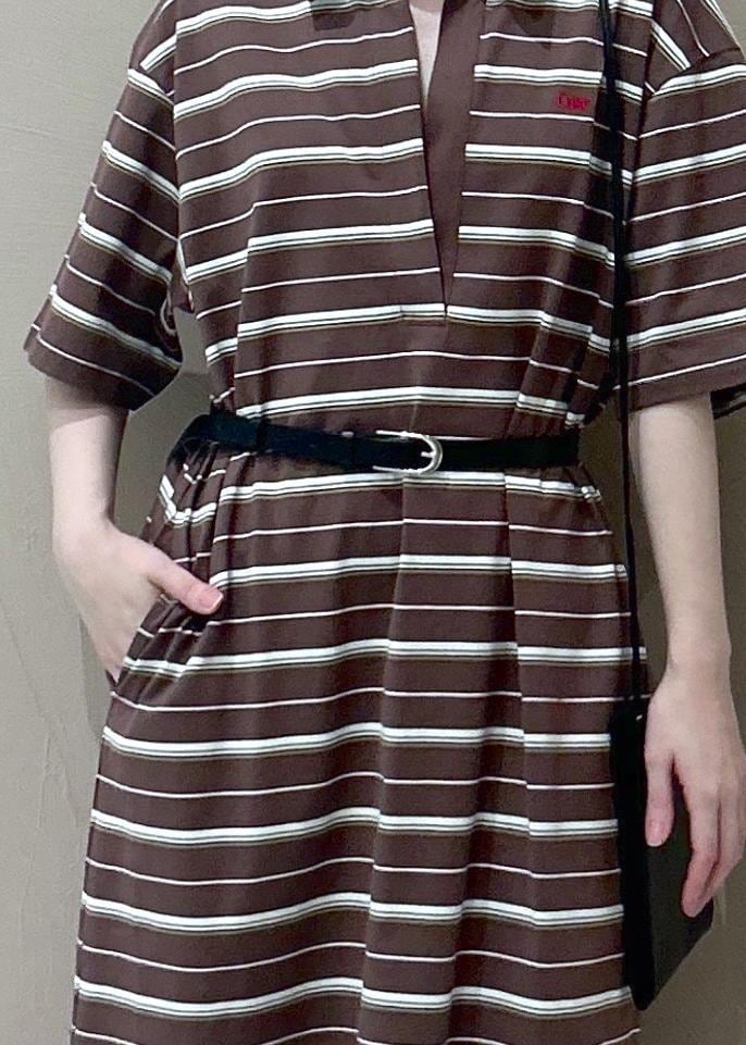 ブラウンを基調とした、シックなカラーのボーダーワンピース。