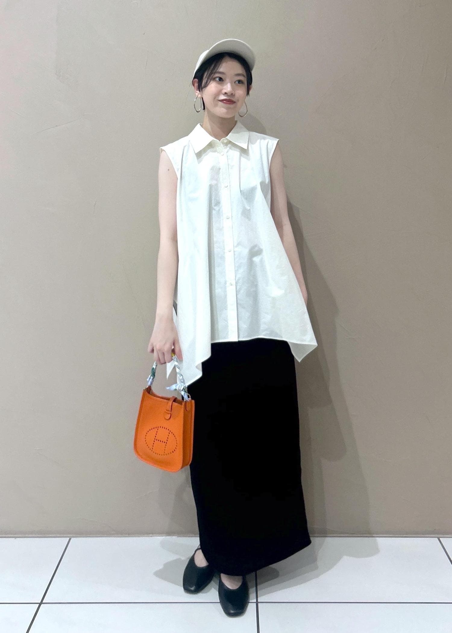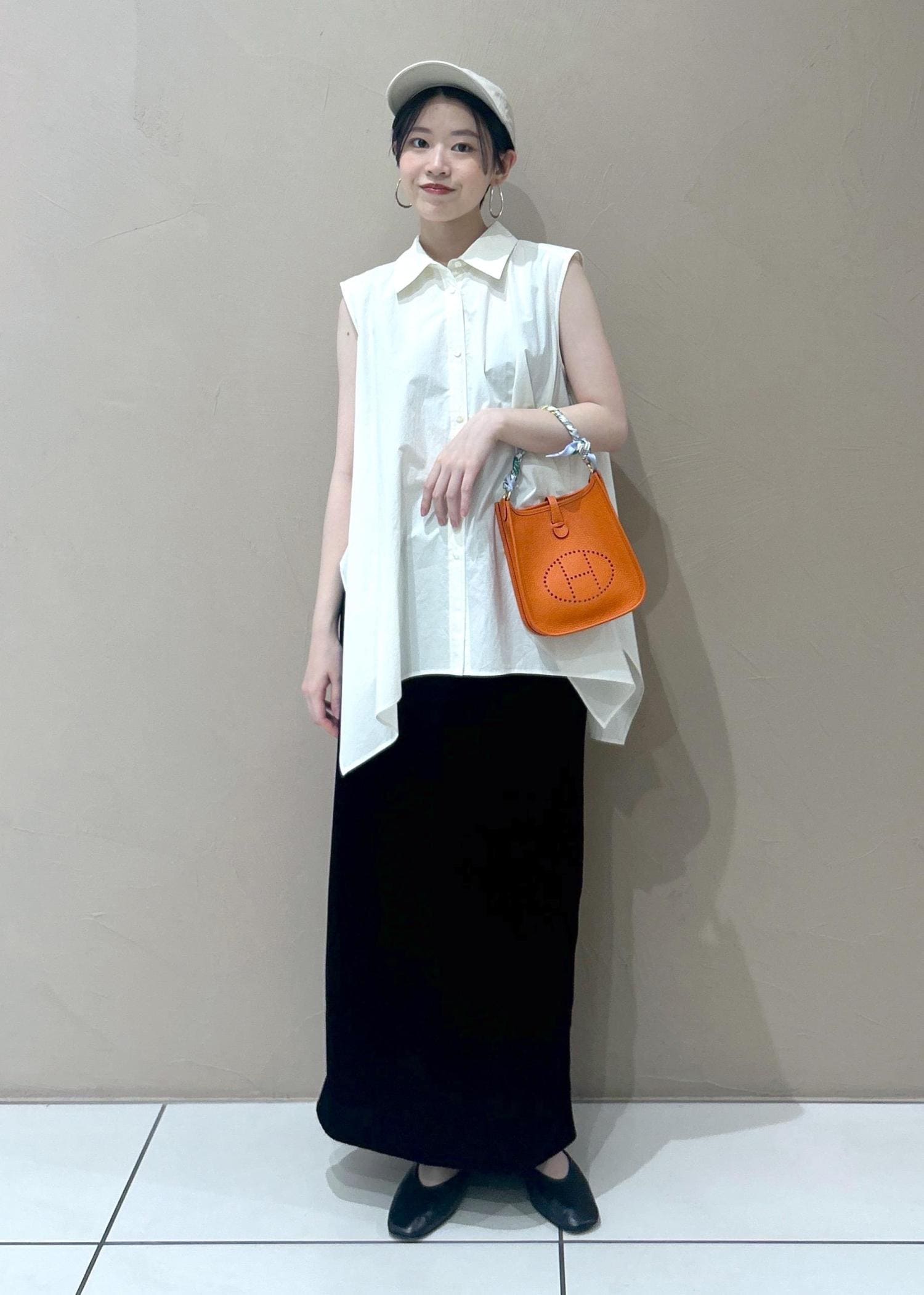 小物でキャップ&色味をプラスしてサロンらしい大人カジュアルなコーディネートにまとめました。