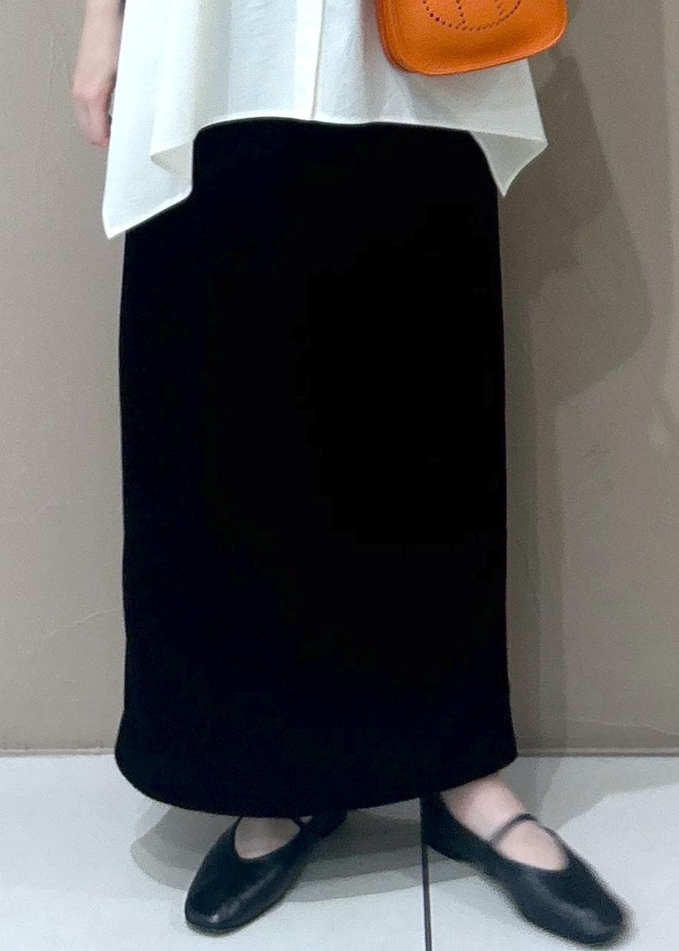 すっきりとしたベロアのスカートを合わせて女性らしいフェミニンな合わせに。