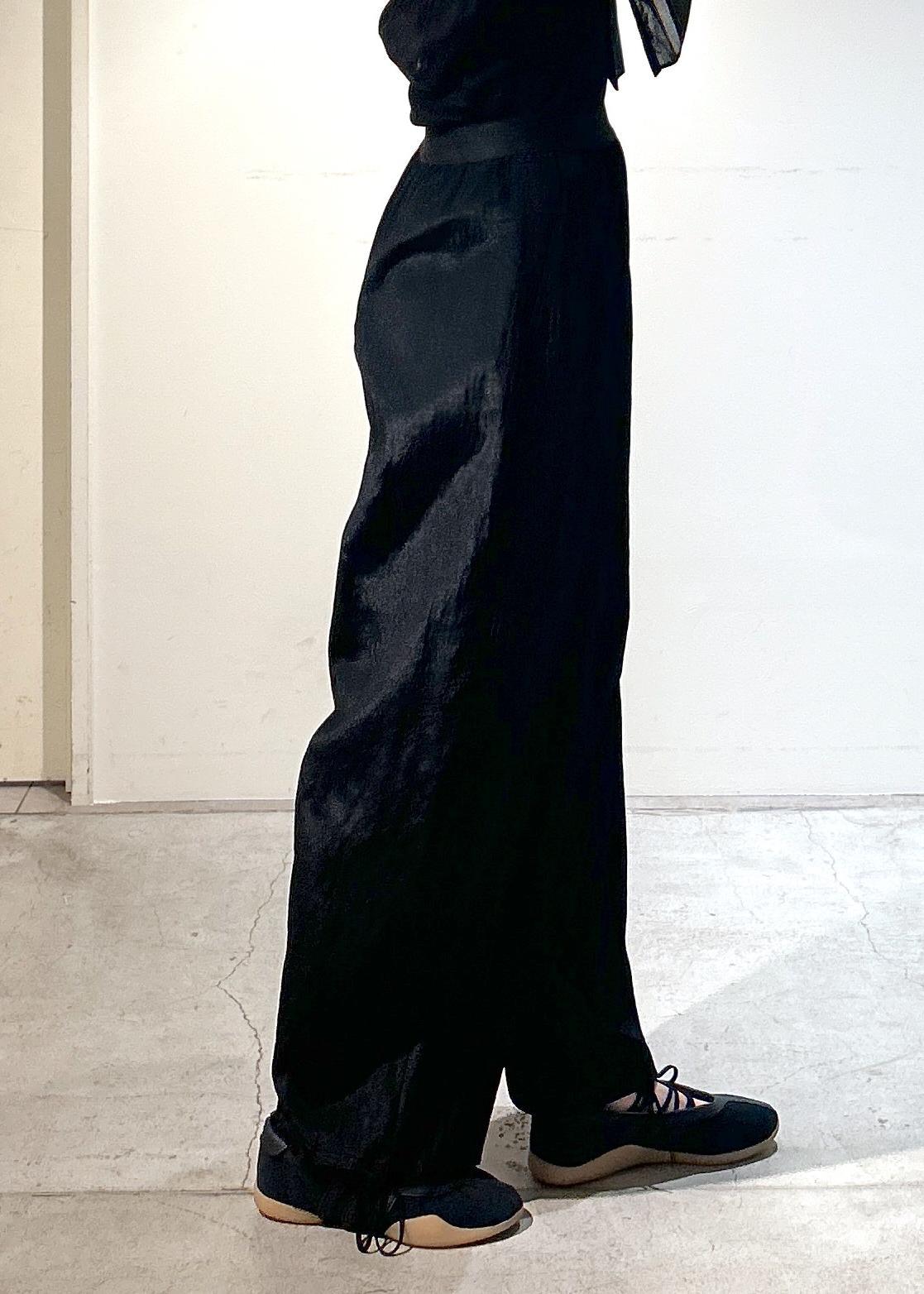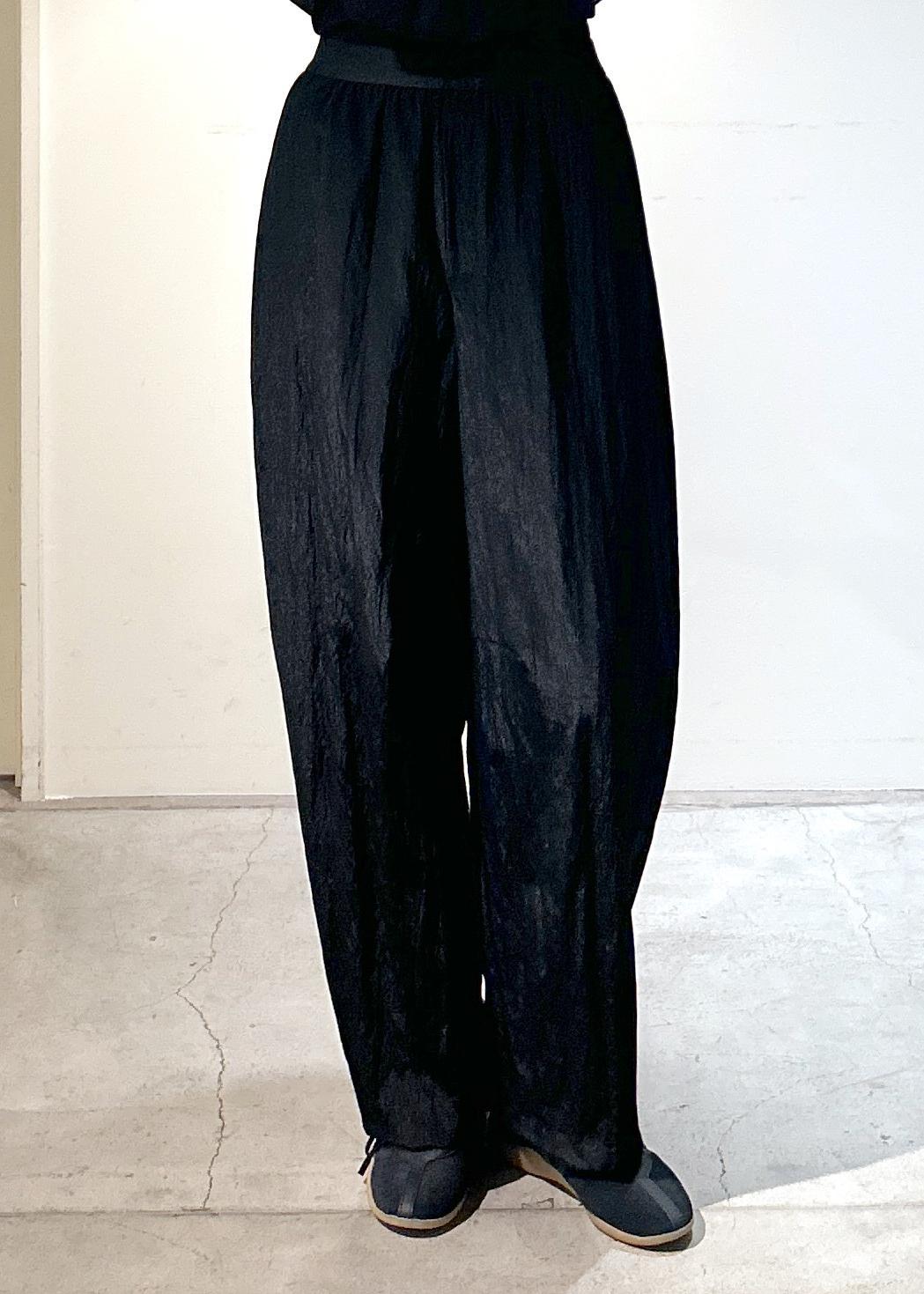 軽くてシャカシャカした素材感。裏地はありませんが、濃いカラーなので透けません。表面に艶感があるので、楽にキレイに履けるパンツです。 -