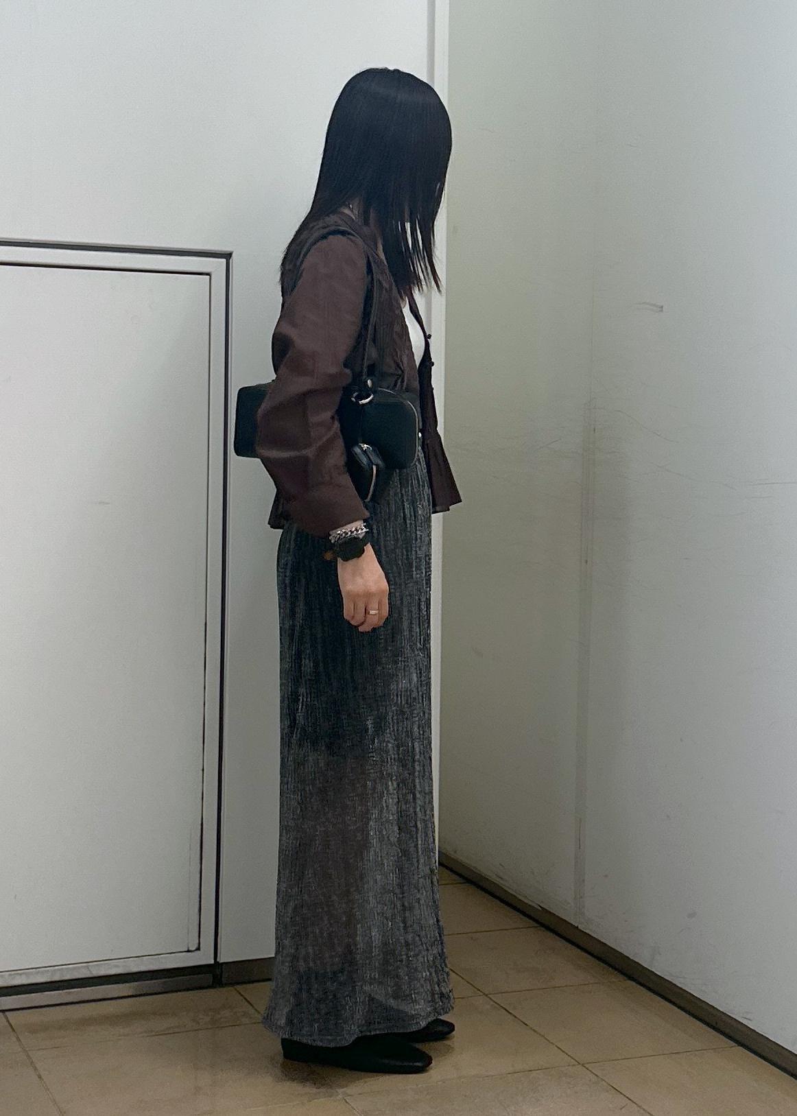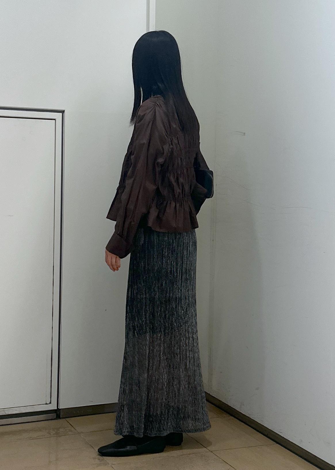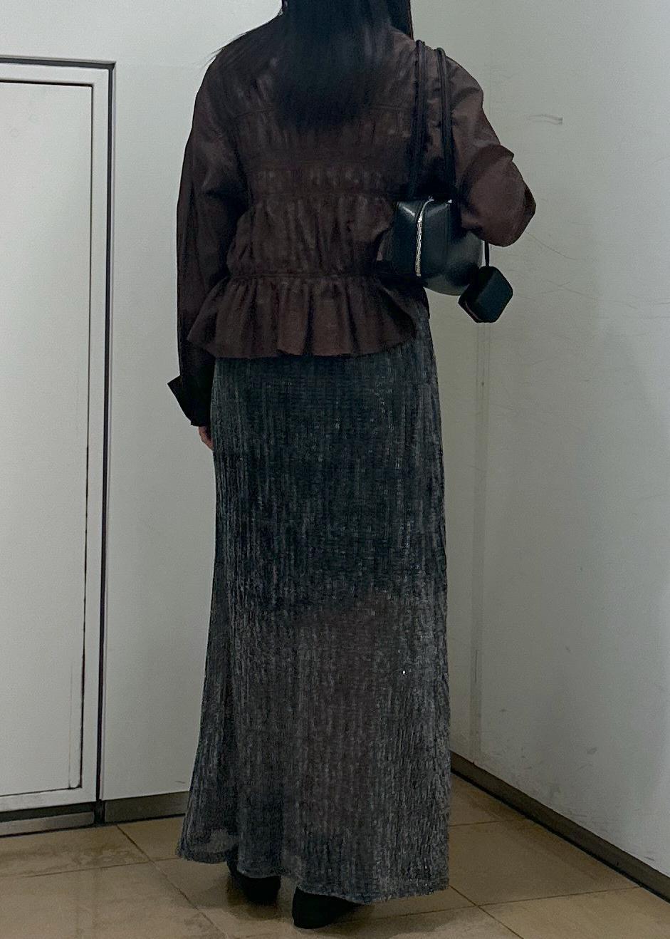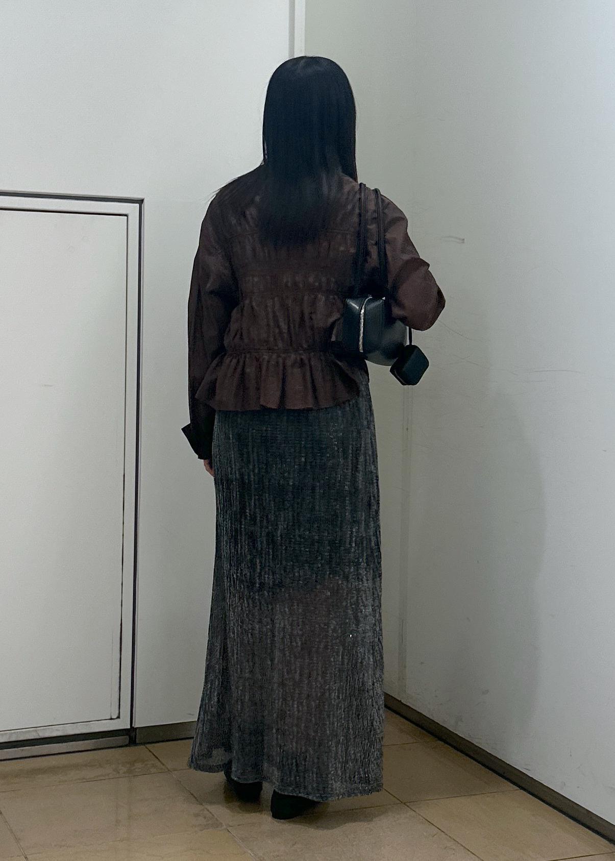 シンプルなシャツスタイルにシアーラメスカートを合わせた女性らしさが出るコーディネートです。