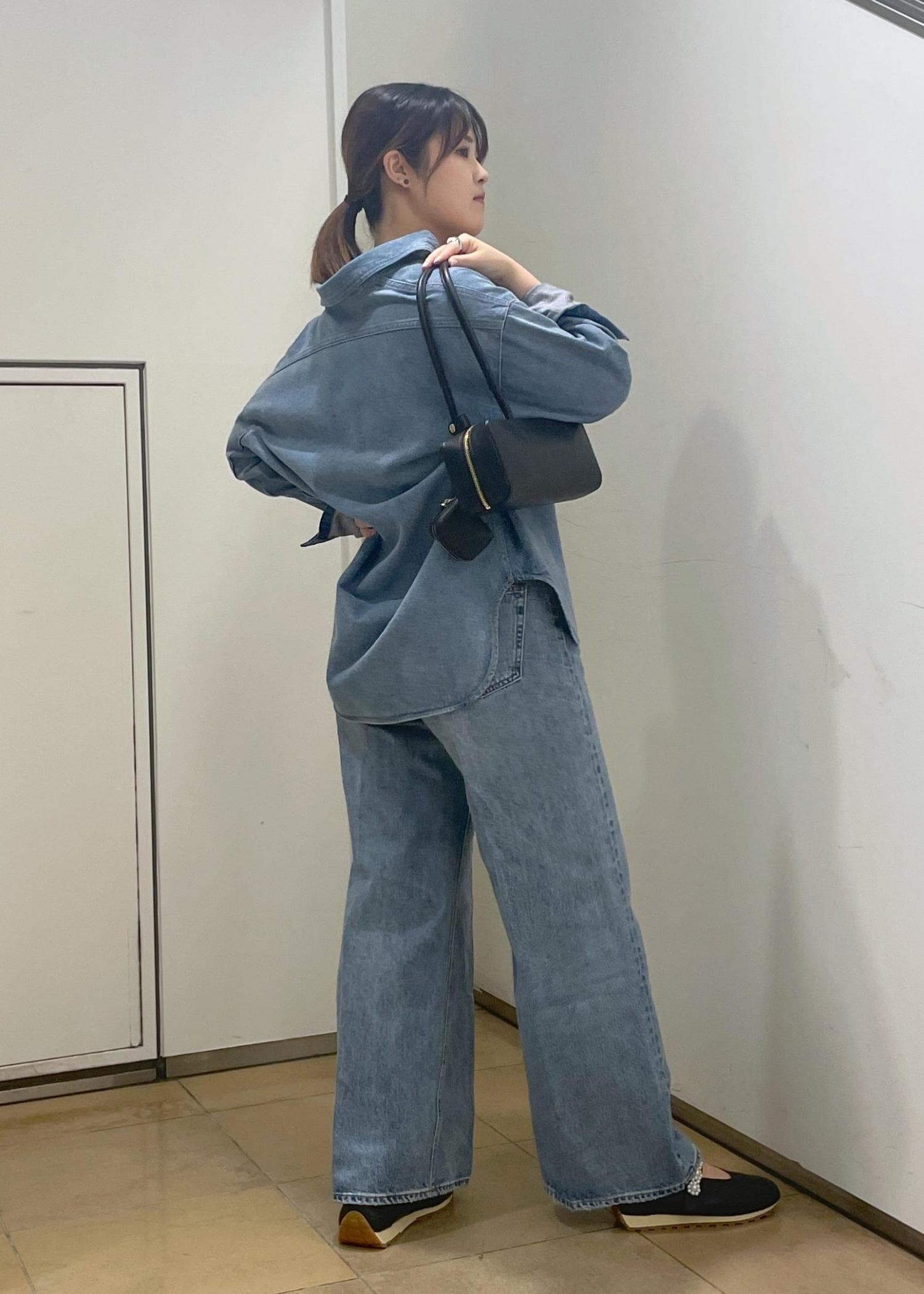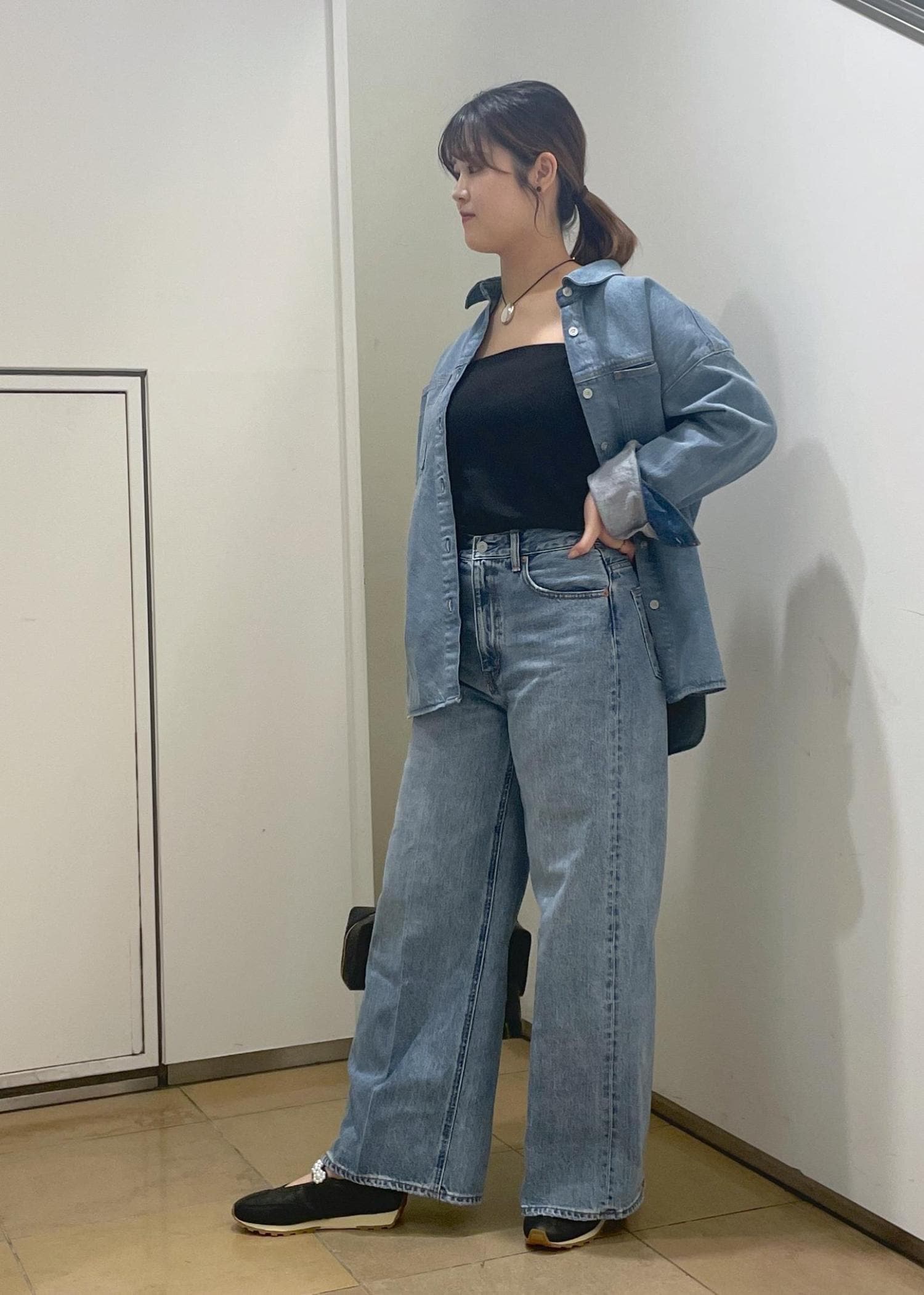 柔らかいデニム生地で、ハリがあるのでボディラインを拾いません。