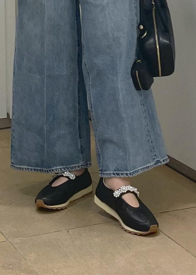 柔らかい牛革が足にフィットしてくれるので軽く、歩きやすく感じます。パールが足元を華やかにしてくれます。マジックテープで着脱も簡単です。