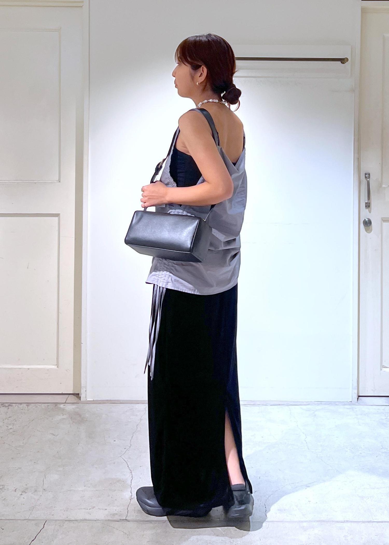直線的なネックラインが新鮮なベースレンジのトップスを少しモードに合わせたくてブラックでまとめてみました。