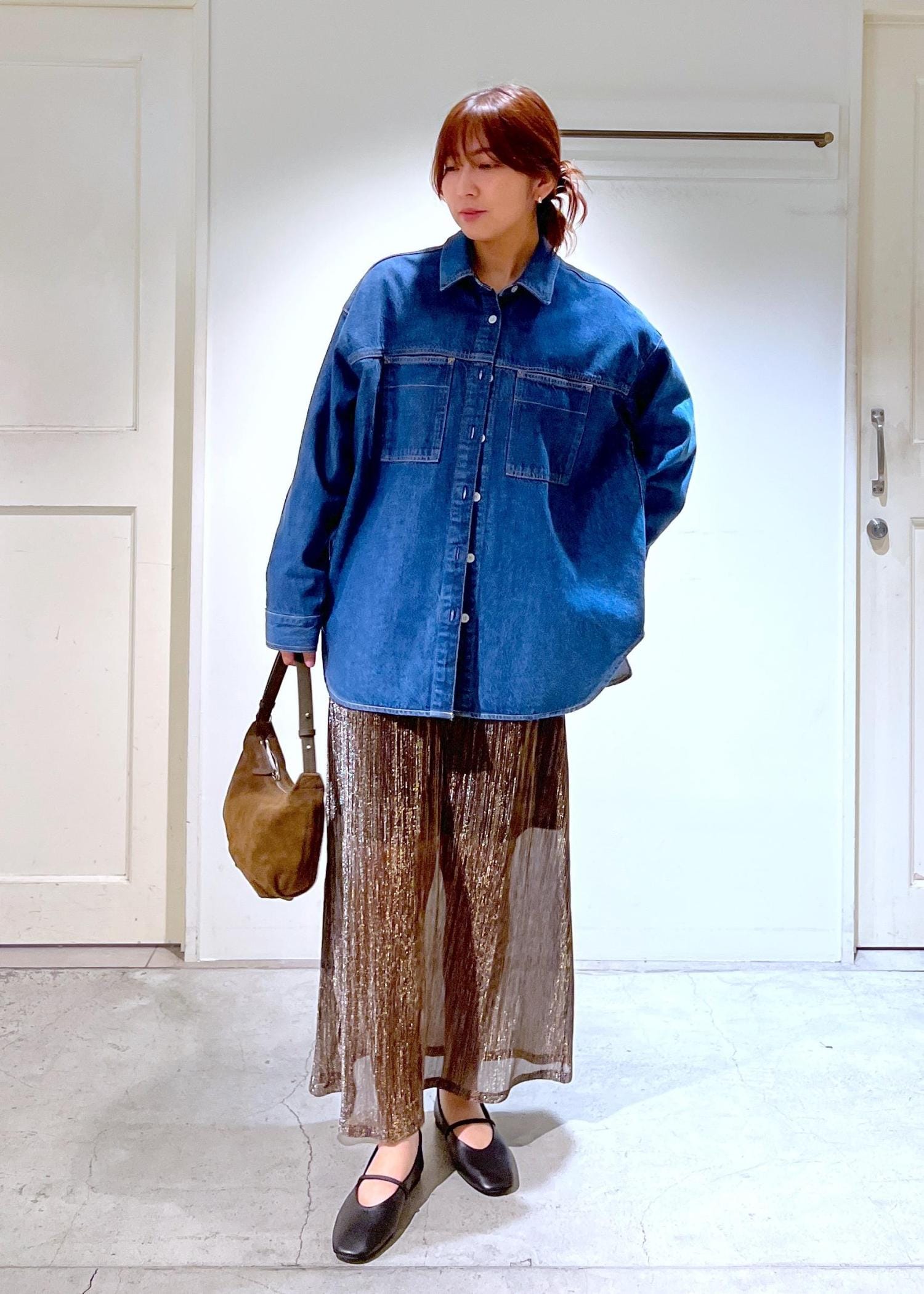 ゆったりしているので、なるべく足元をスッキリ見せたり、ボタンを下だけ開けてラインを意識したりしています。