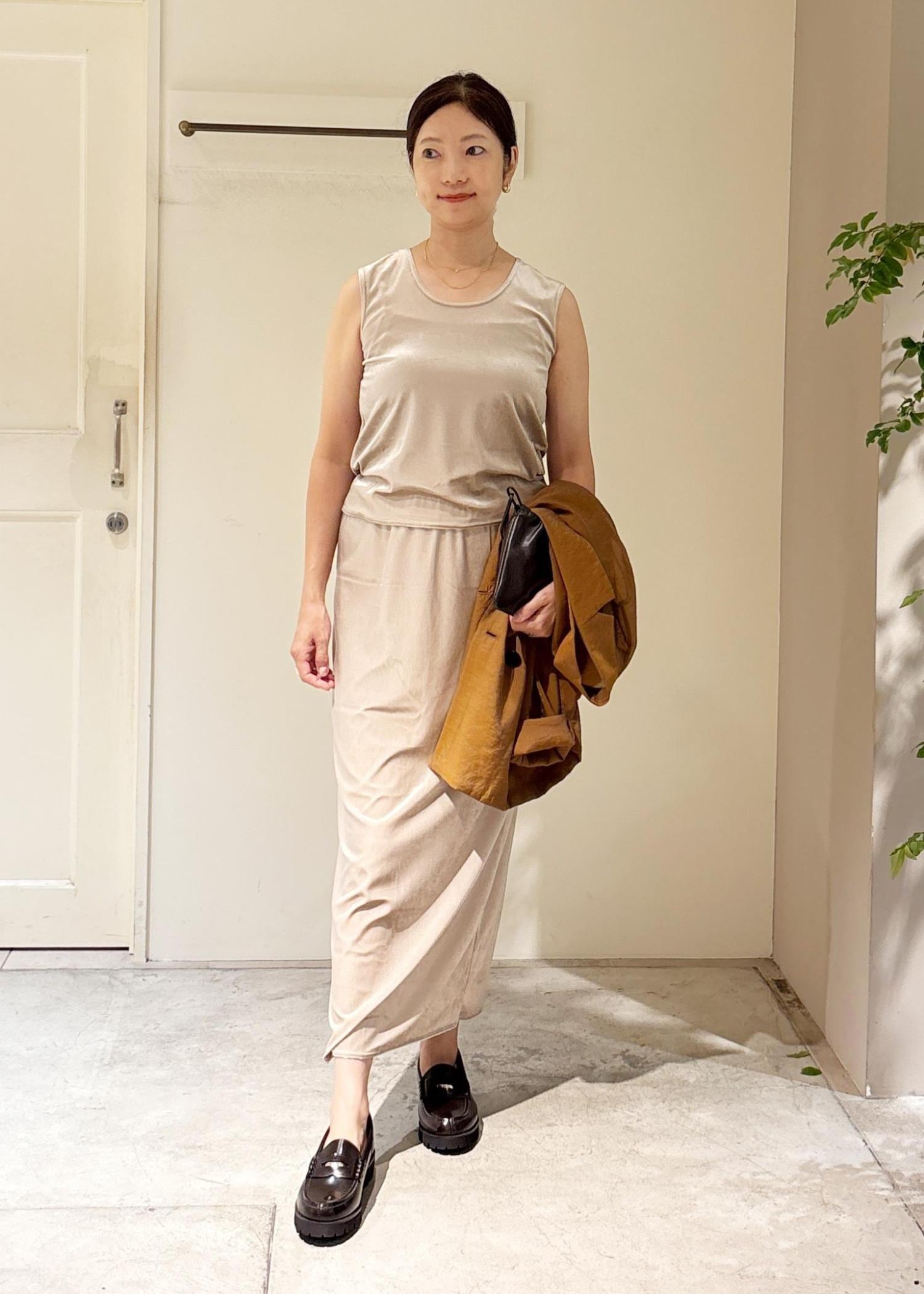 SALON adam et ropéトリアセベロアナロースカート / セットアップ対応ベージュ / F¥7,480レビュー薄手のベロアでIラインが綺麗なスカートです。ウエストも総ゴムでラクですよ。