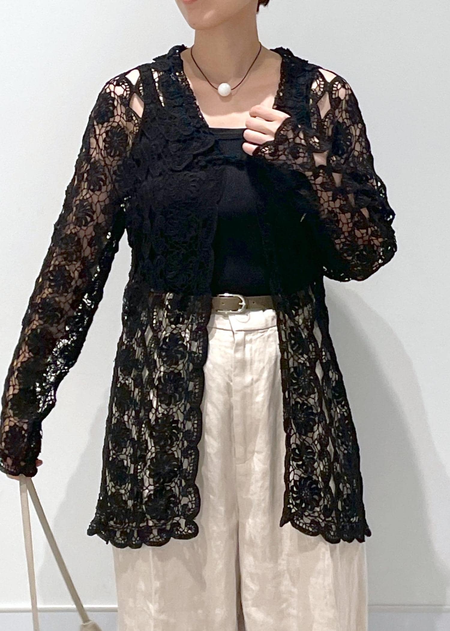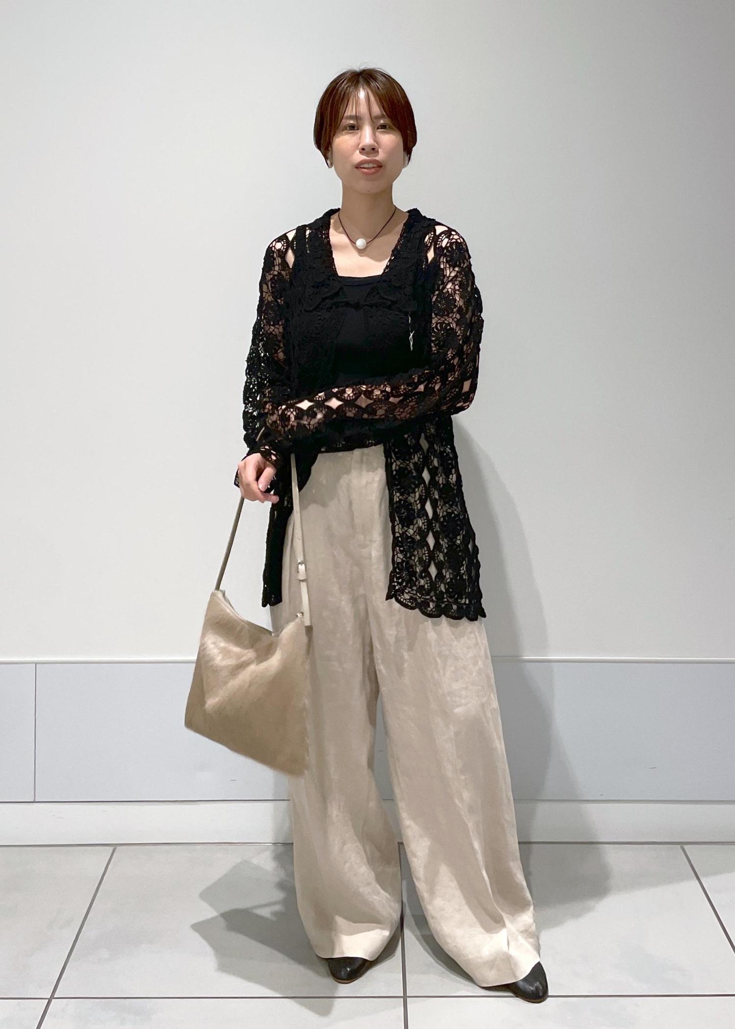ヴィンテージのクロシェカーディガンにリネンのパンツを合わせてナチュラルに*