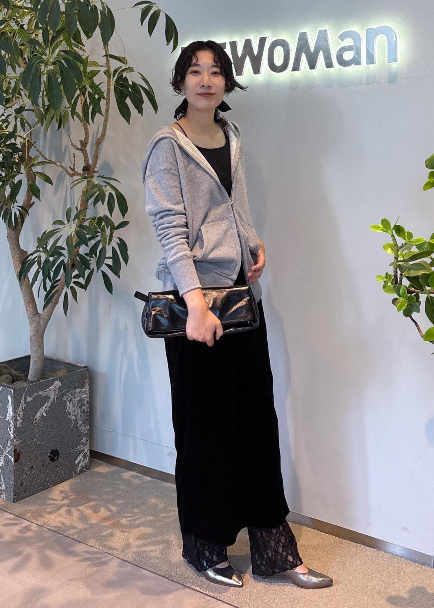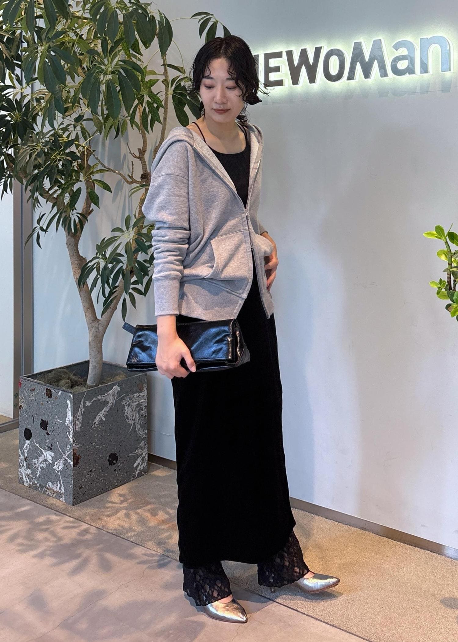 Americana別注アイテムのパーカーとベロア、レースアイテムを合わせたコーディネートです。パーカーはスッキリ細身のシルエットが縦ラインを綺麗にスタイルアップ効果も抜群です!