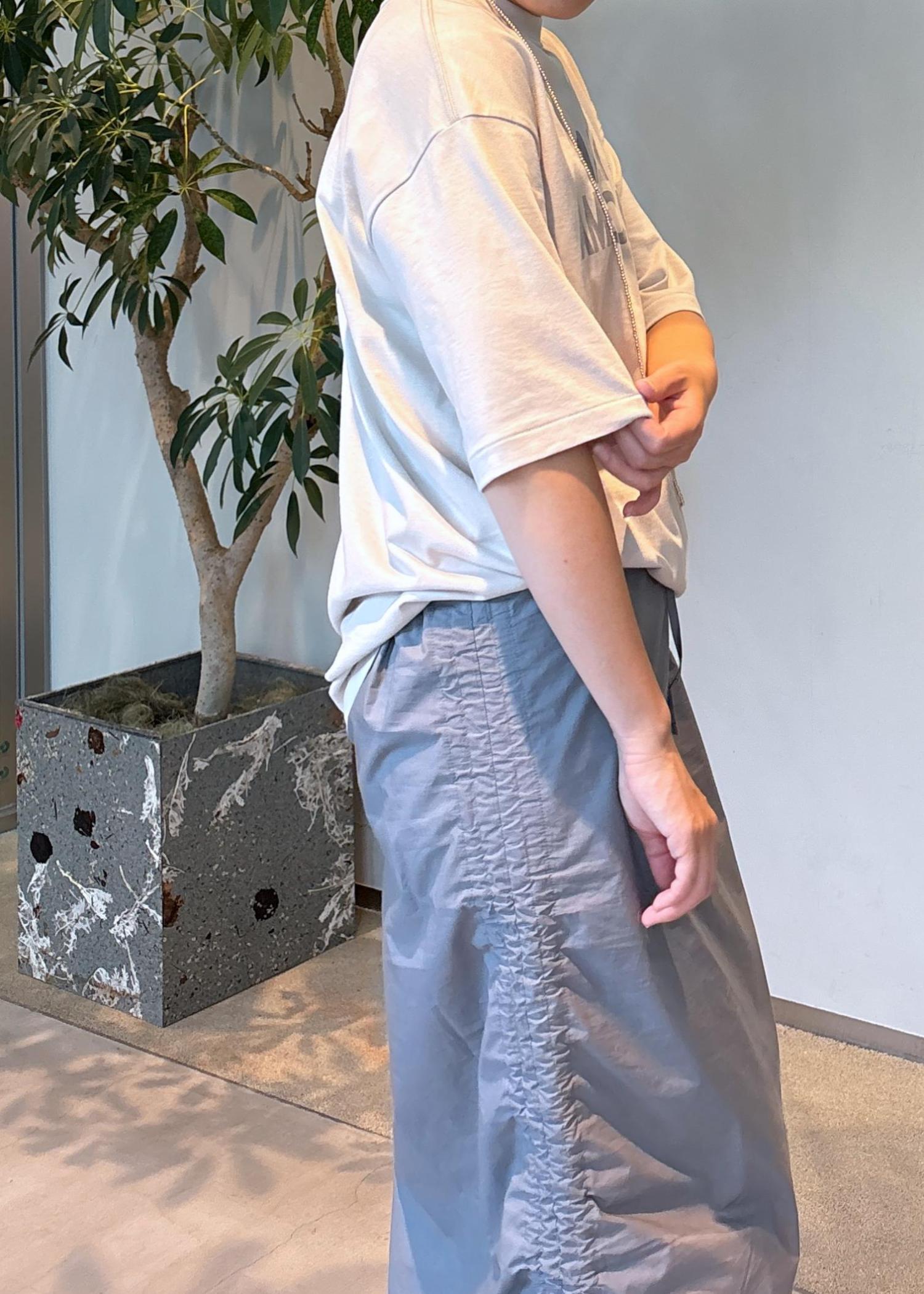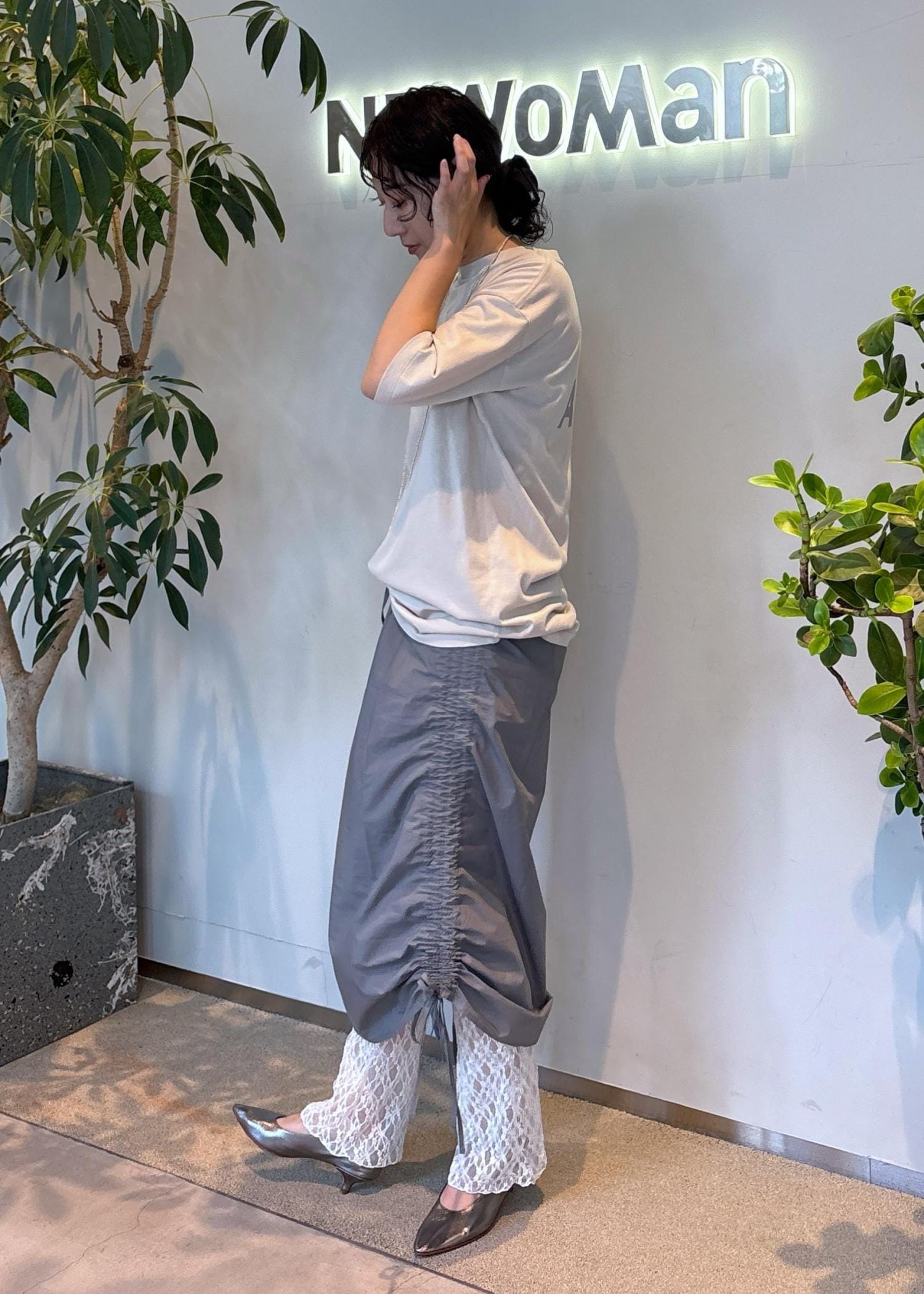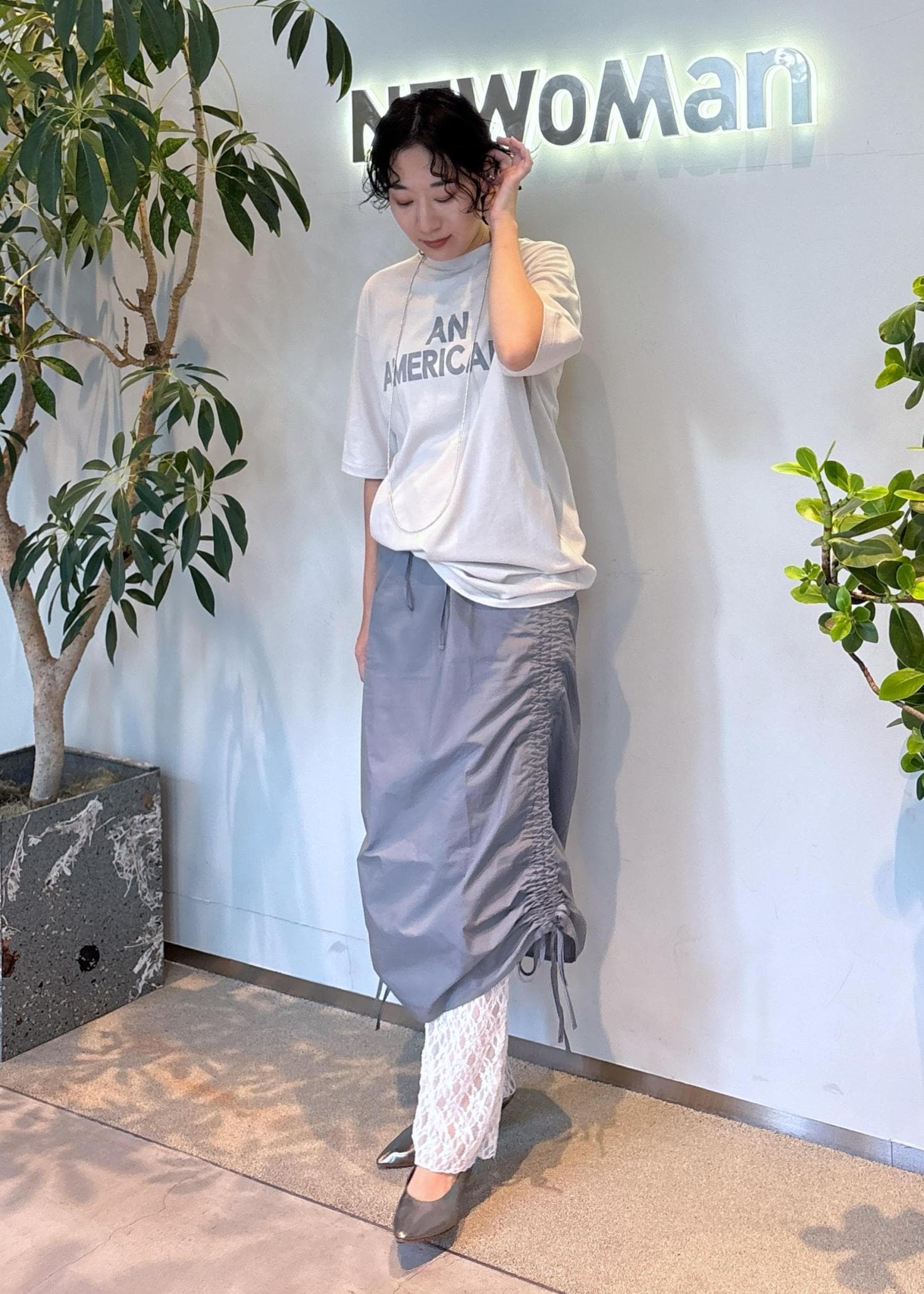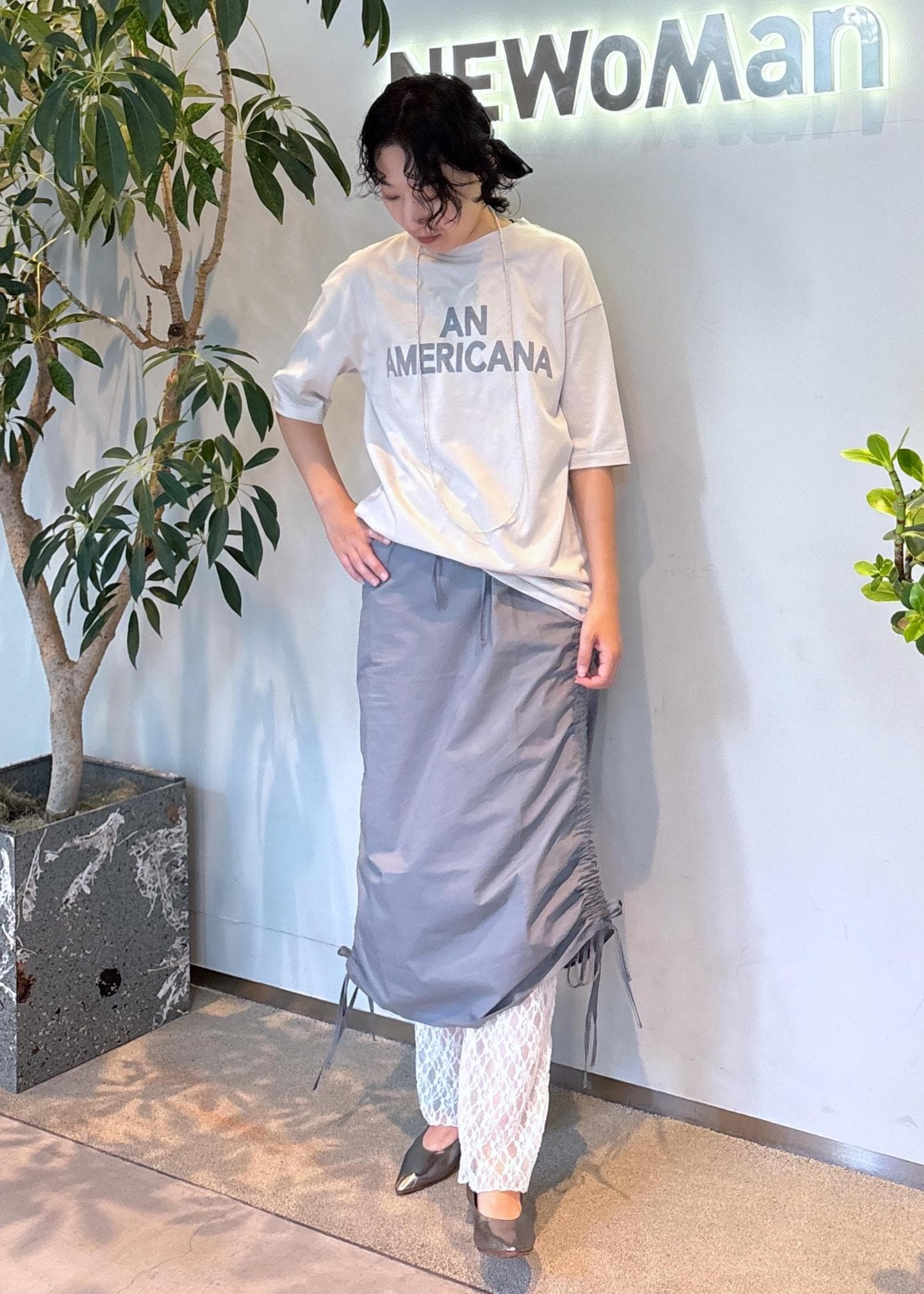 シンプルAmericanaの別注Tシャツに、デザイン性のあるBaserange のスカートを合わせたコーディネート。