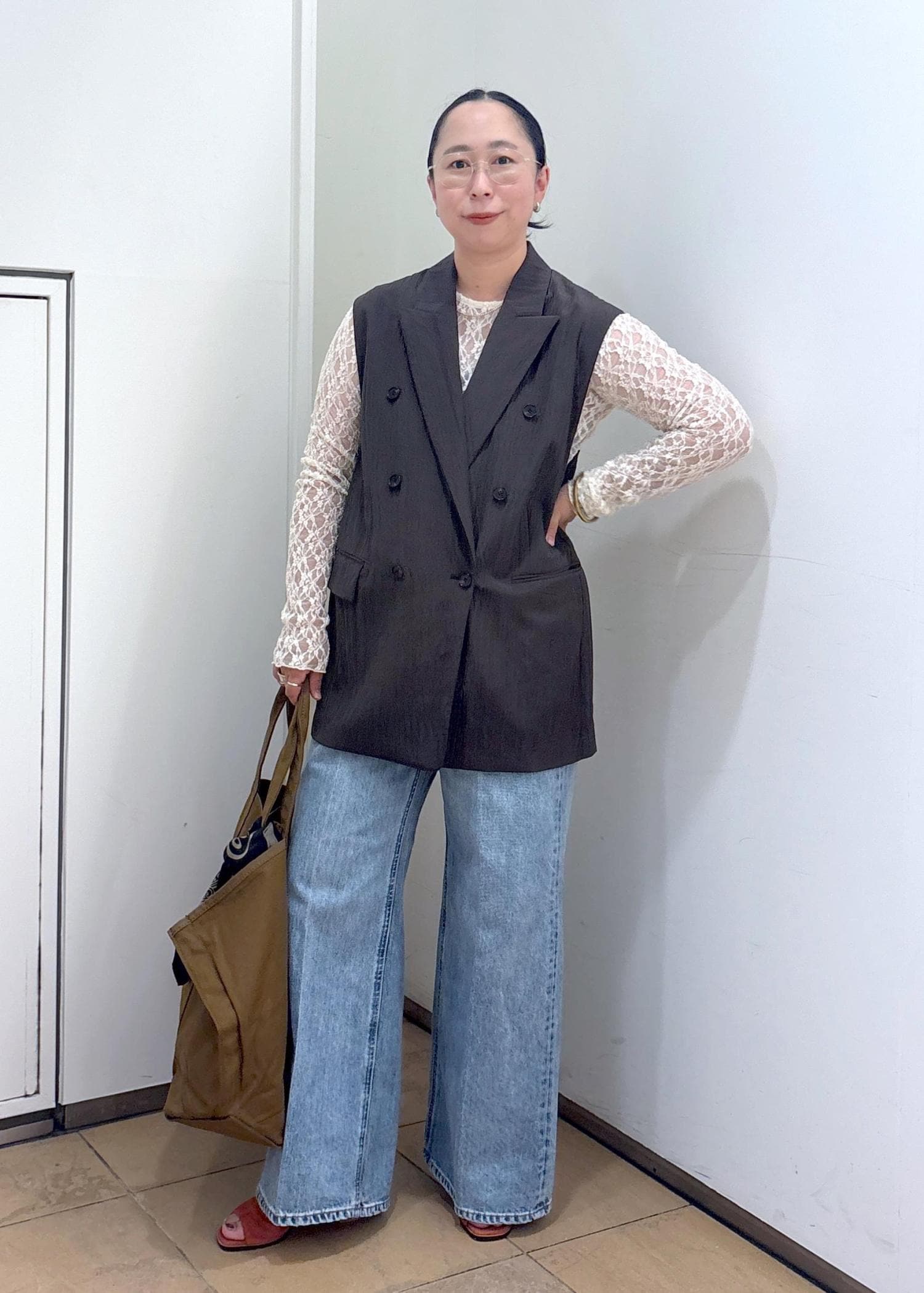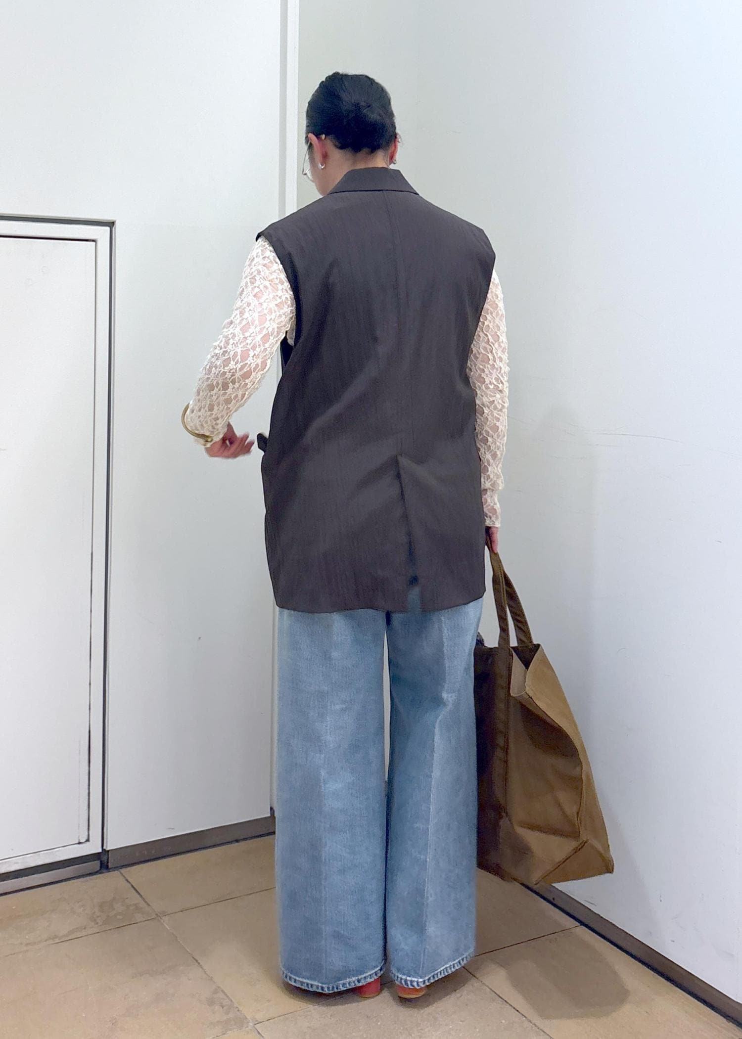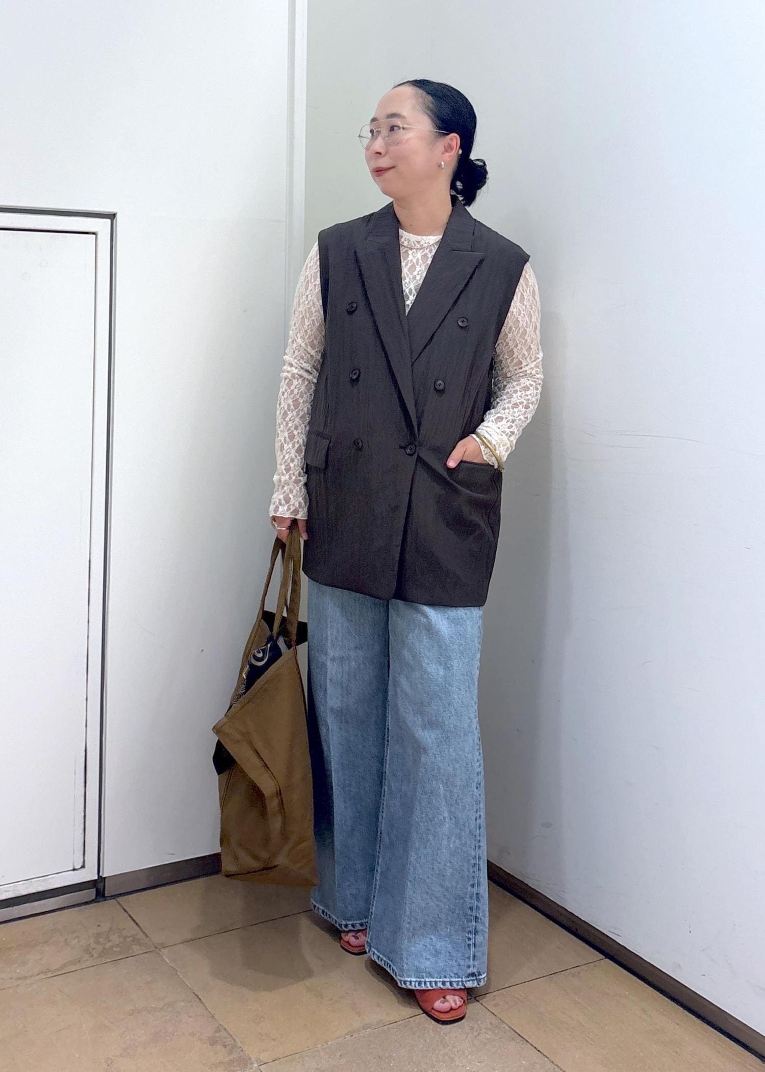 マットな質感のジレにバギーデニムの合わせに、シアーなレーストップスで女性らしさをプラスしてみました。