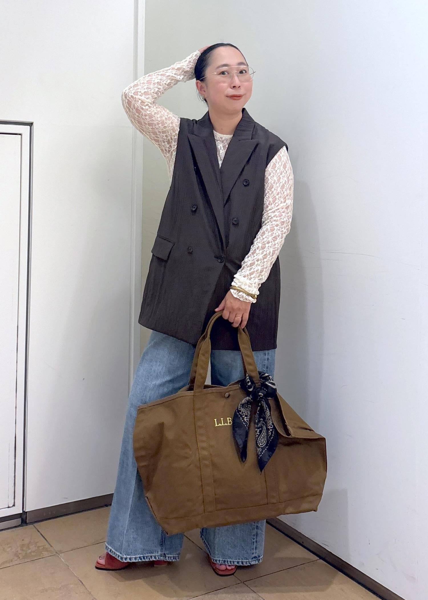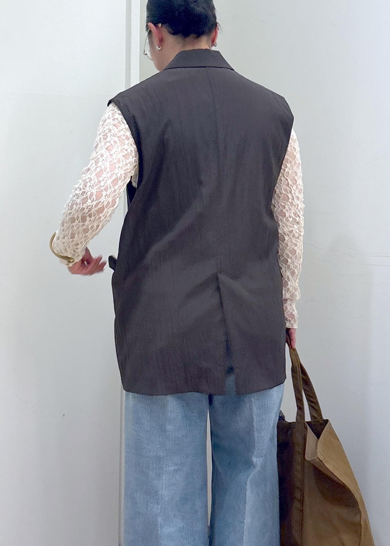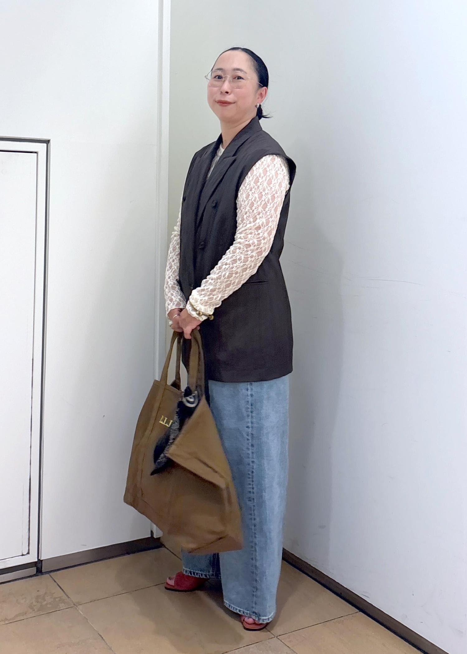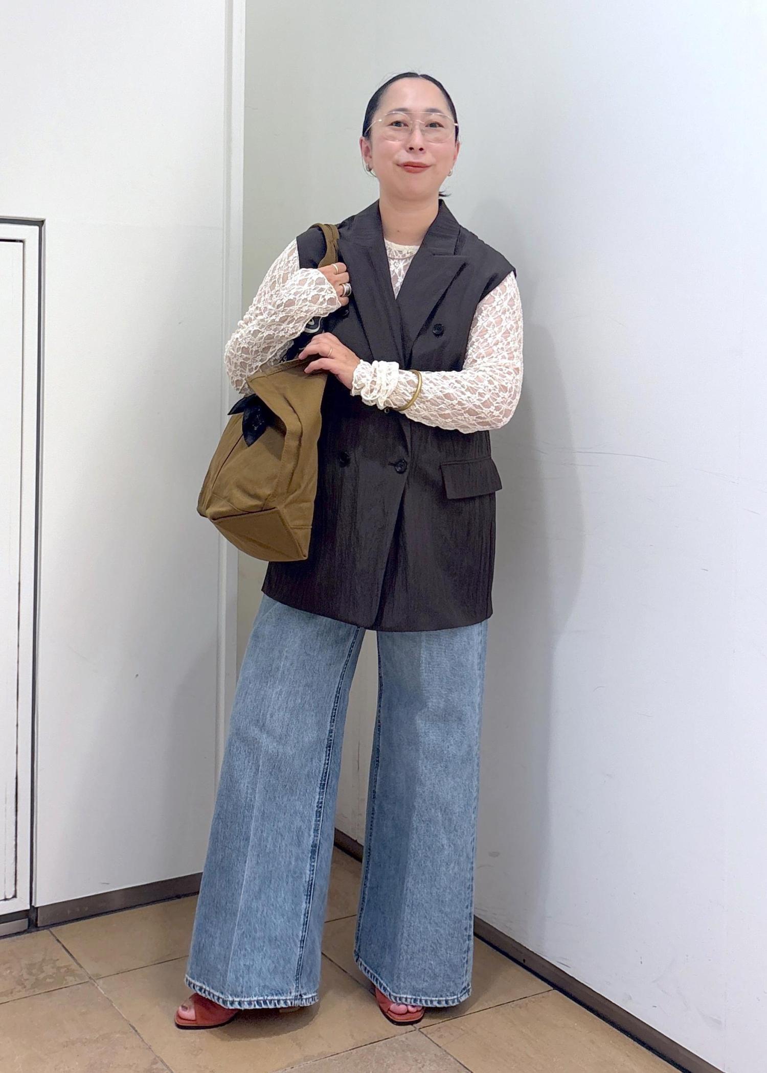 マットな質感のジレにバギーデニムの合わせに、シアーなレーストップスで女性らしさをプラスしてみました。