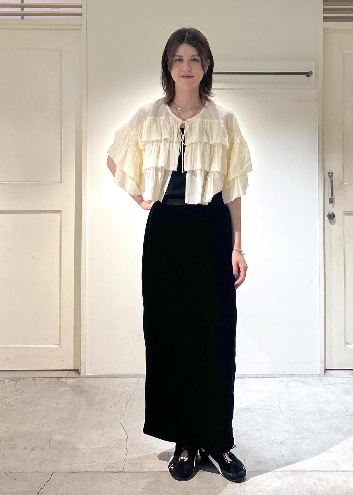 丈は腰骨上くらい、袖は肘上くらいの長さです。全体的にラッフルフリルが付いているデザインなので、ラインが出にくく体型カバーできます。ボレロ丈なので、スッキリ着られてスタイルアップできます。