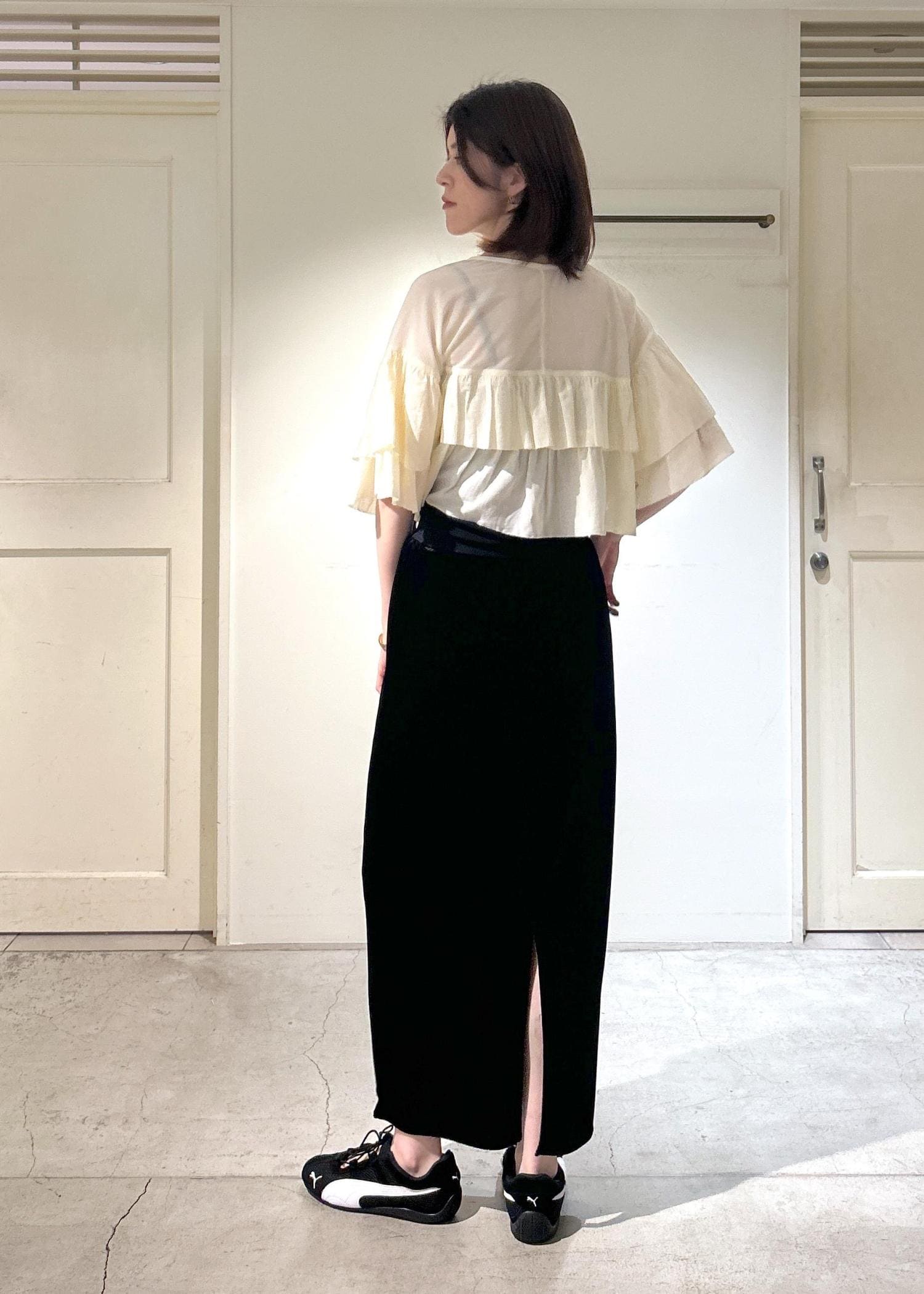身長171cmで、丈は踝上くらいの長さです。ウエストはオールゴムで履きやすいです。タイトスカートなので、比較的ラインは拾いますが締め付け感はありません。