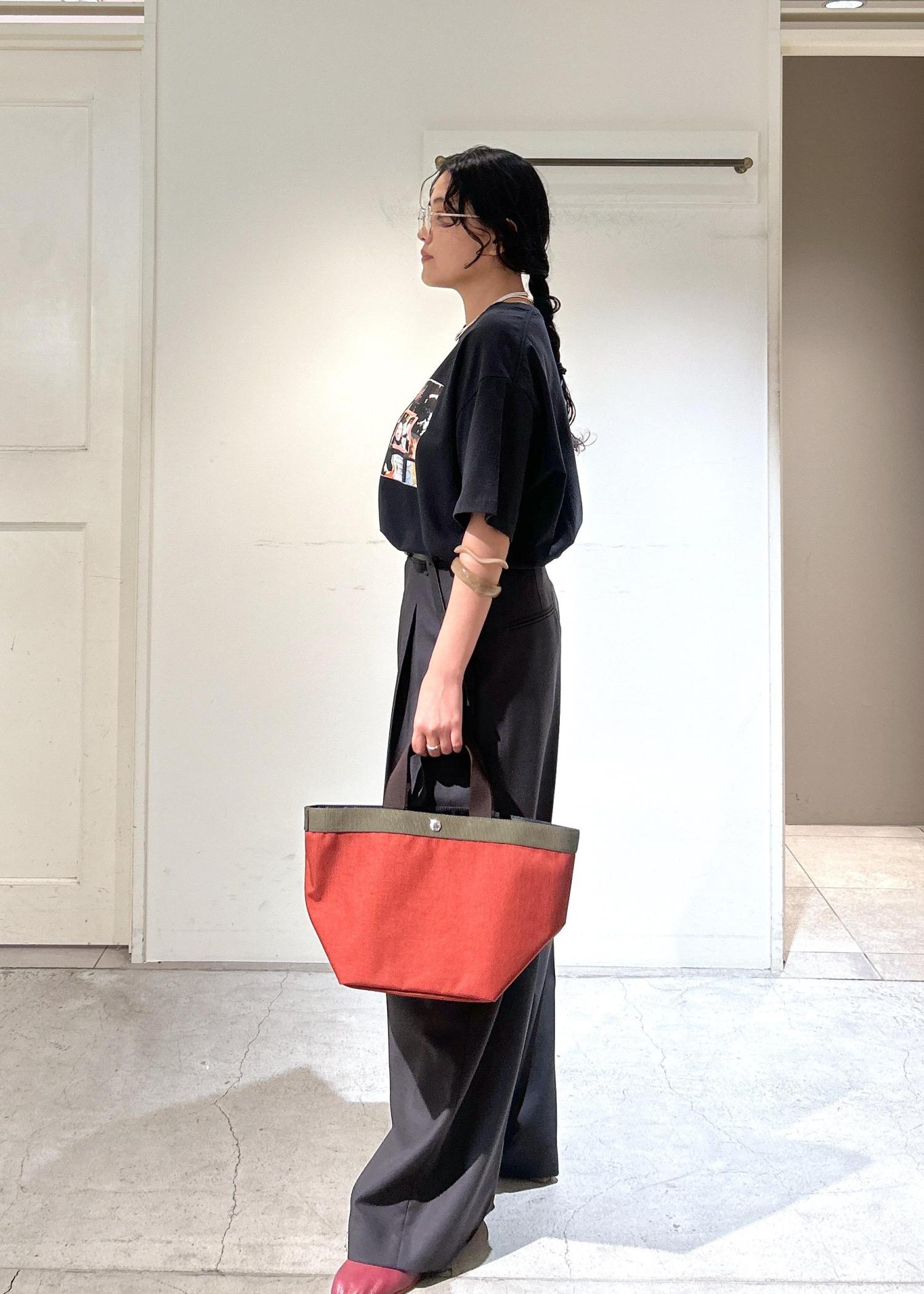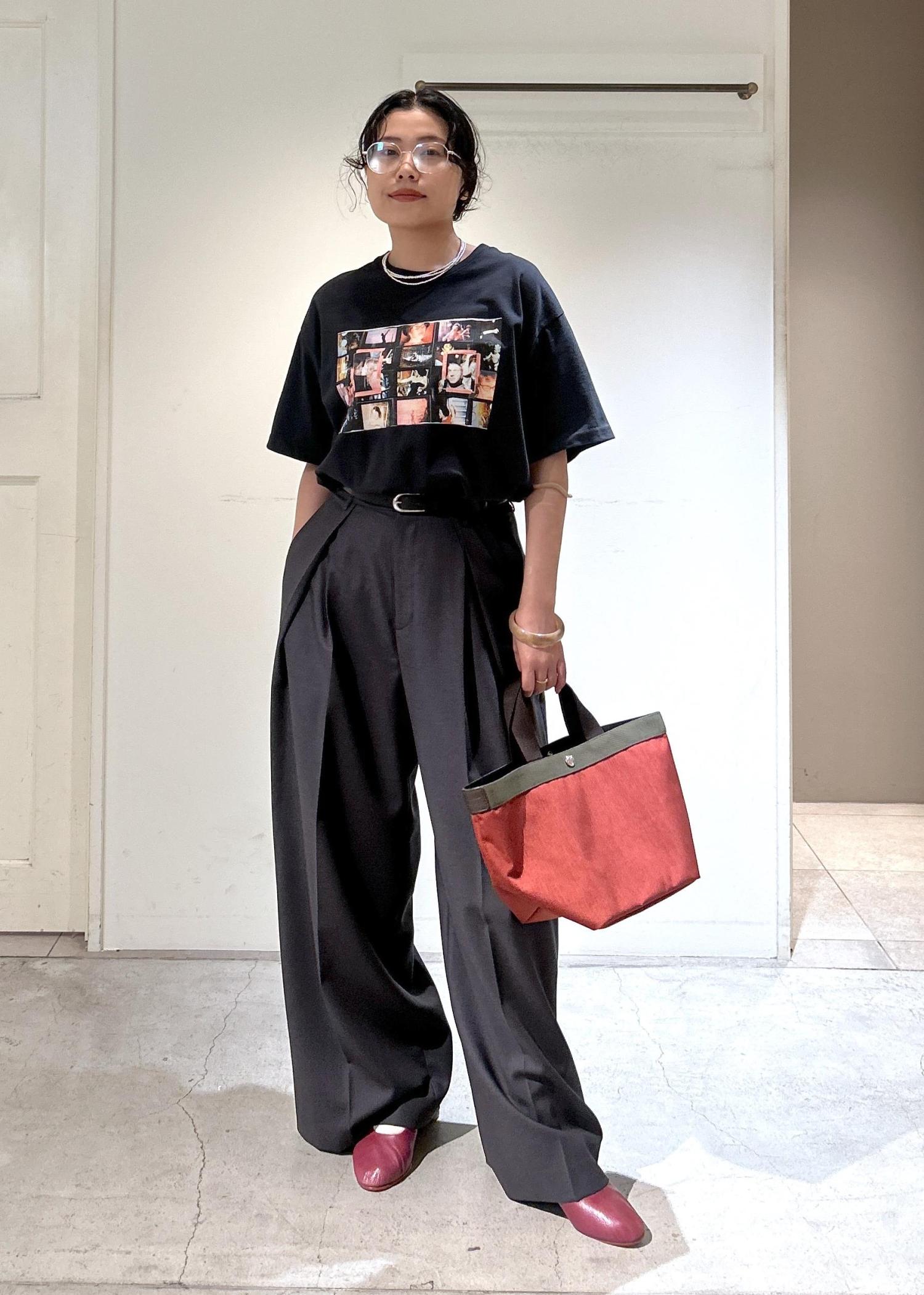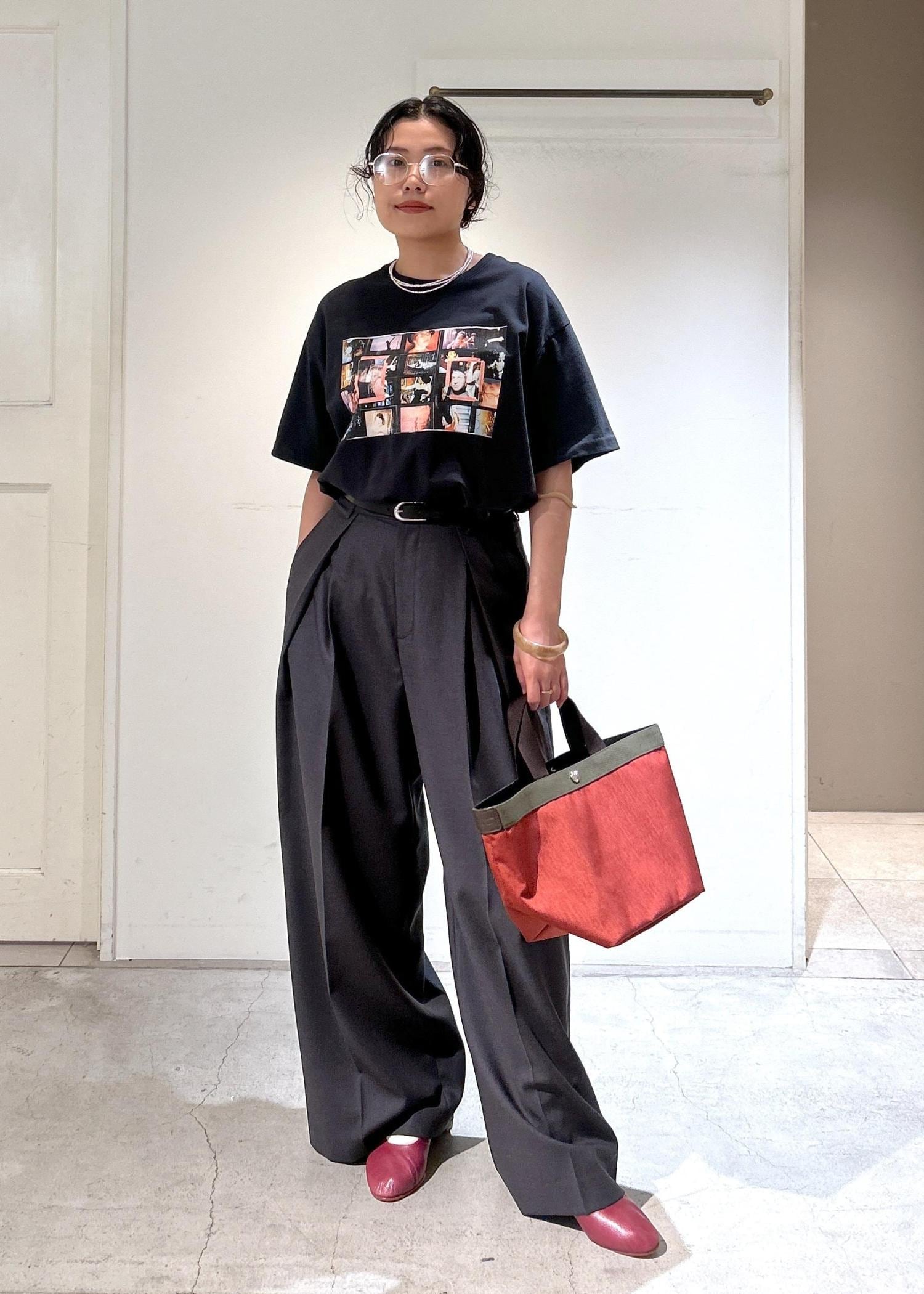 Jim GoldbergのTシャツにスラックスを合わせ赤のパンプスで秋らしさをプラスしました。