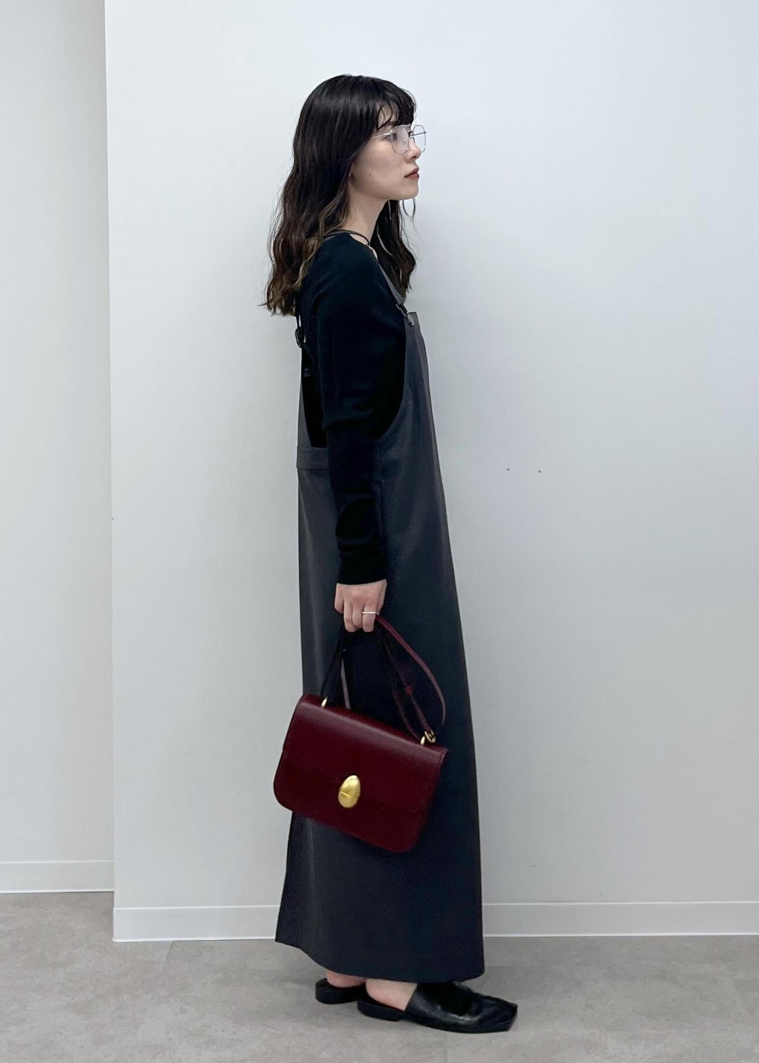 レザー素材。ゴールド金具がきちんと感もあるクラシックな印象のバッグです。ワインレッドの色味が秋冬服との相性◎です。