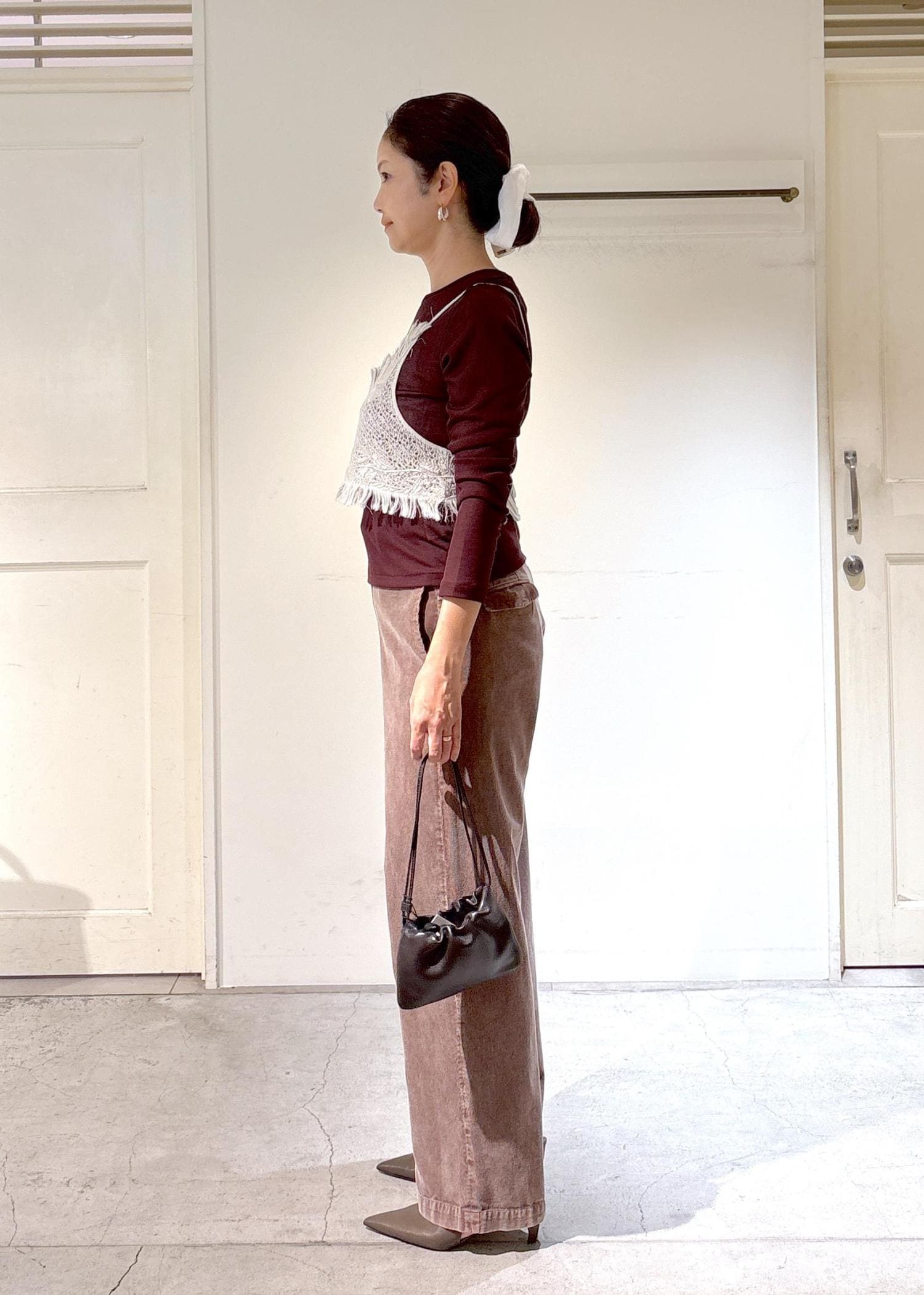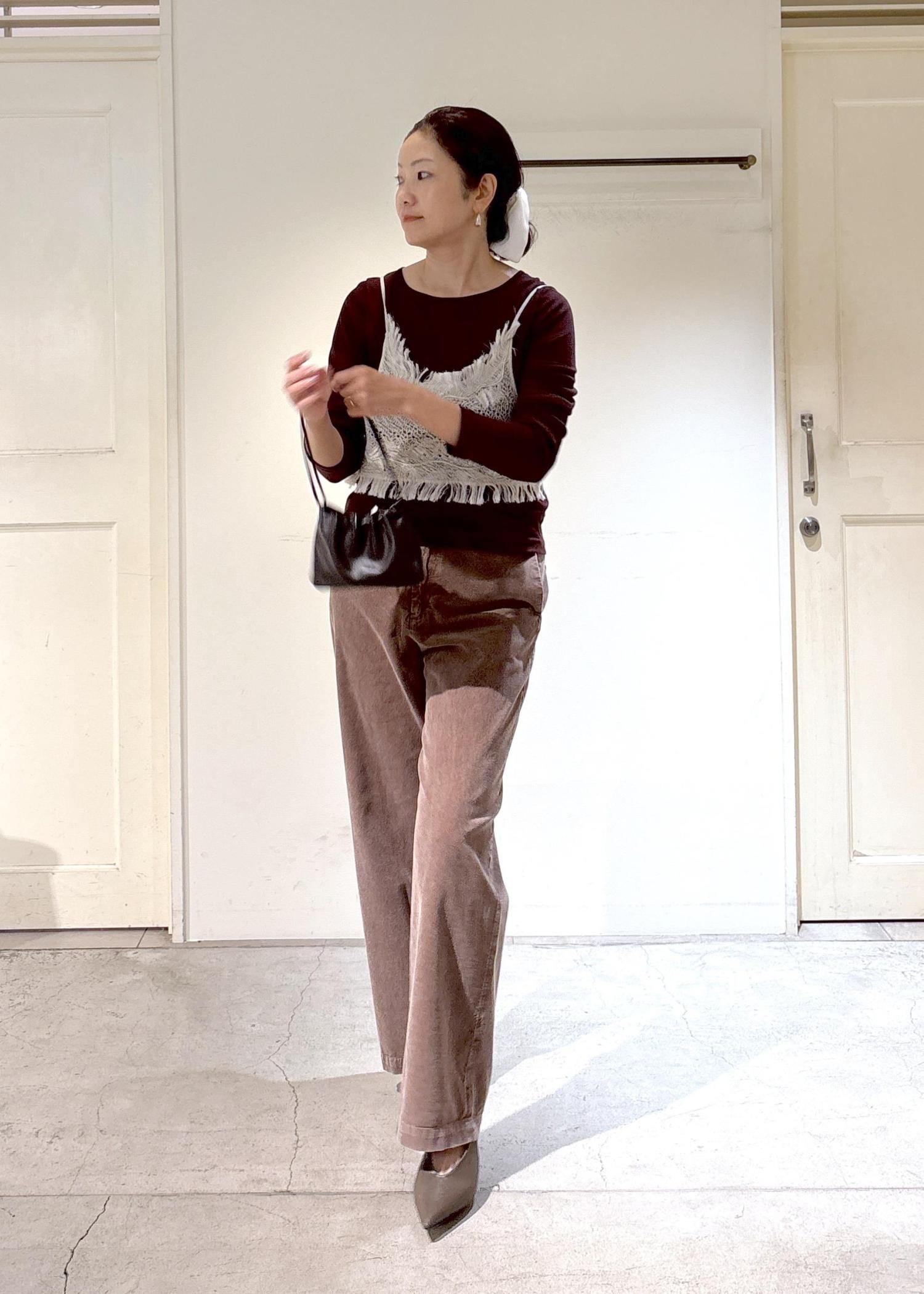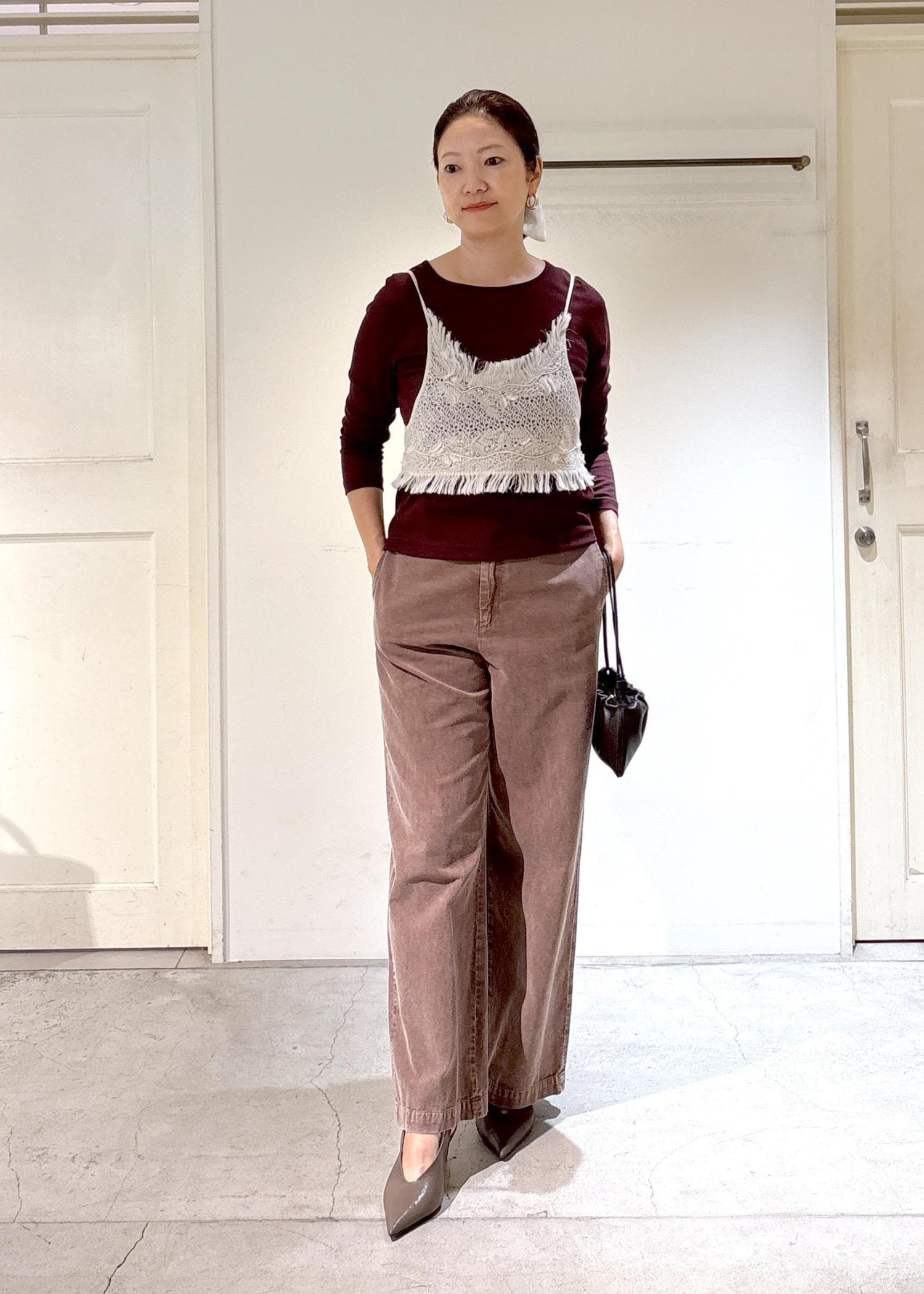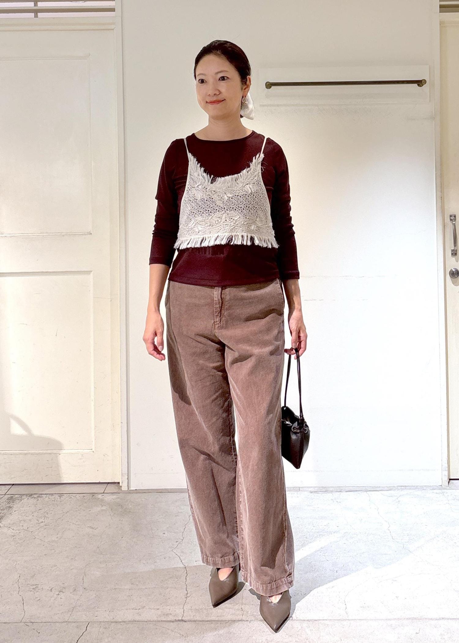 秋カラーのカットソーにレースビスチェを重ね、シンプルコーデをアップデート。パンプスで大人っぽく仕上げた秋のお出かけスタイルです。