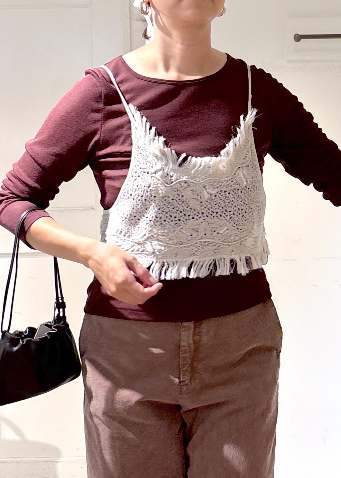 SALON adam et ropéレースシアーキャミソール[セットアップ対応]グレー / F¥16,500レビュー上から被るだけで、こなれた雰囲気が作れるビスチェ。ゆったりとしていますが、コットンポリの肩紐なので、ズレ落ちる事はありません。クラフト感溢れる素敵な一品です。