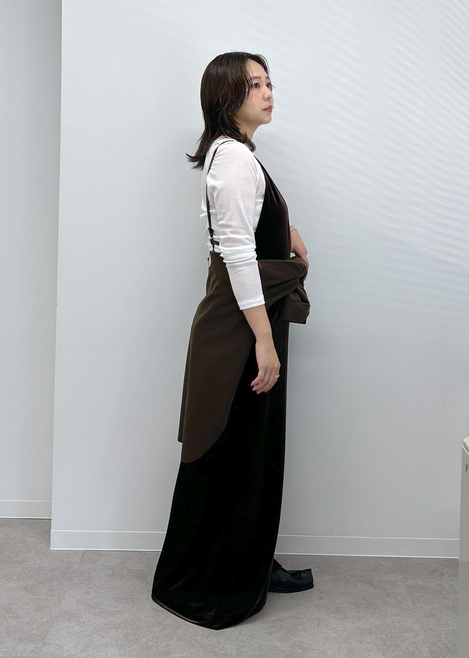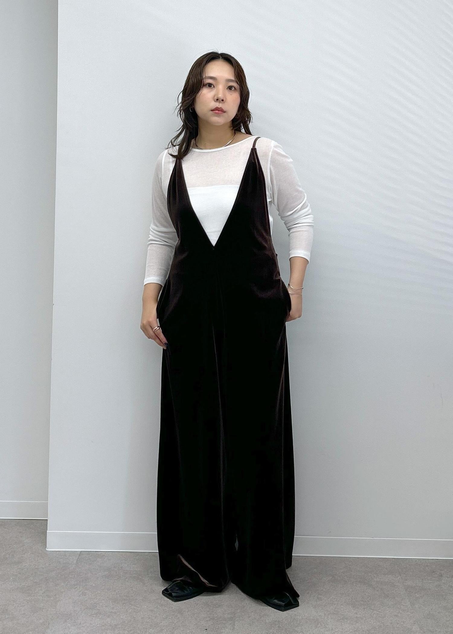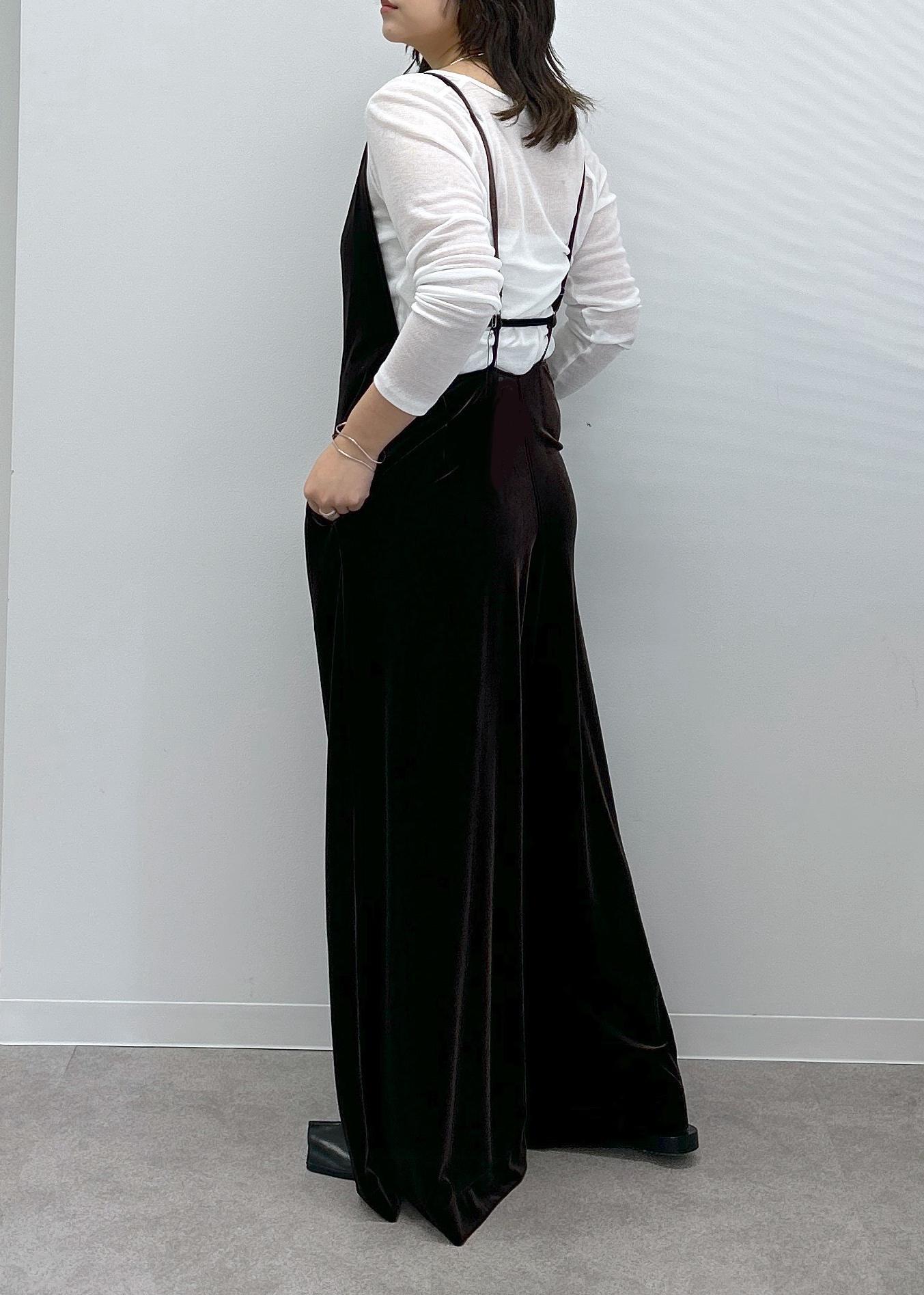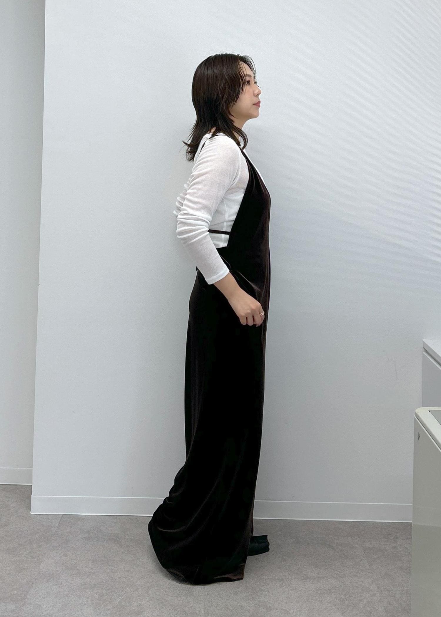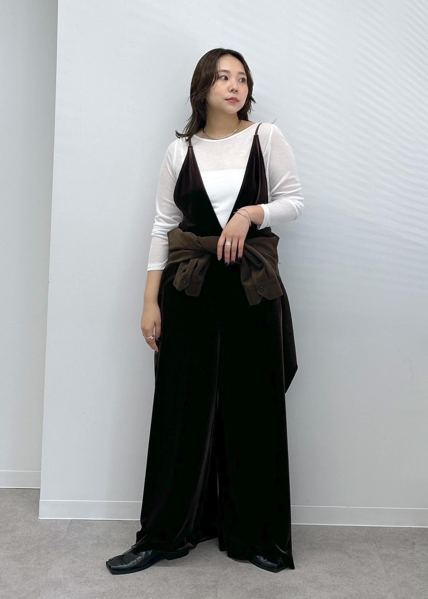 SALON adam et ropé【WEB限定】コンフィリュクスベロアオールインワンブラウン / F¥19,800レビュー身体のラインを拾いにくいゆったりとしたサイズ感です。着丈は長めですが、肩紐で調節ができます。