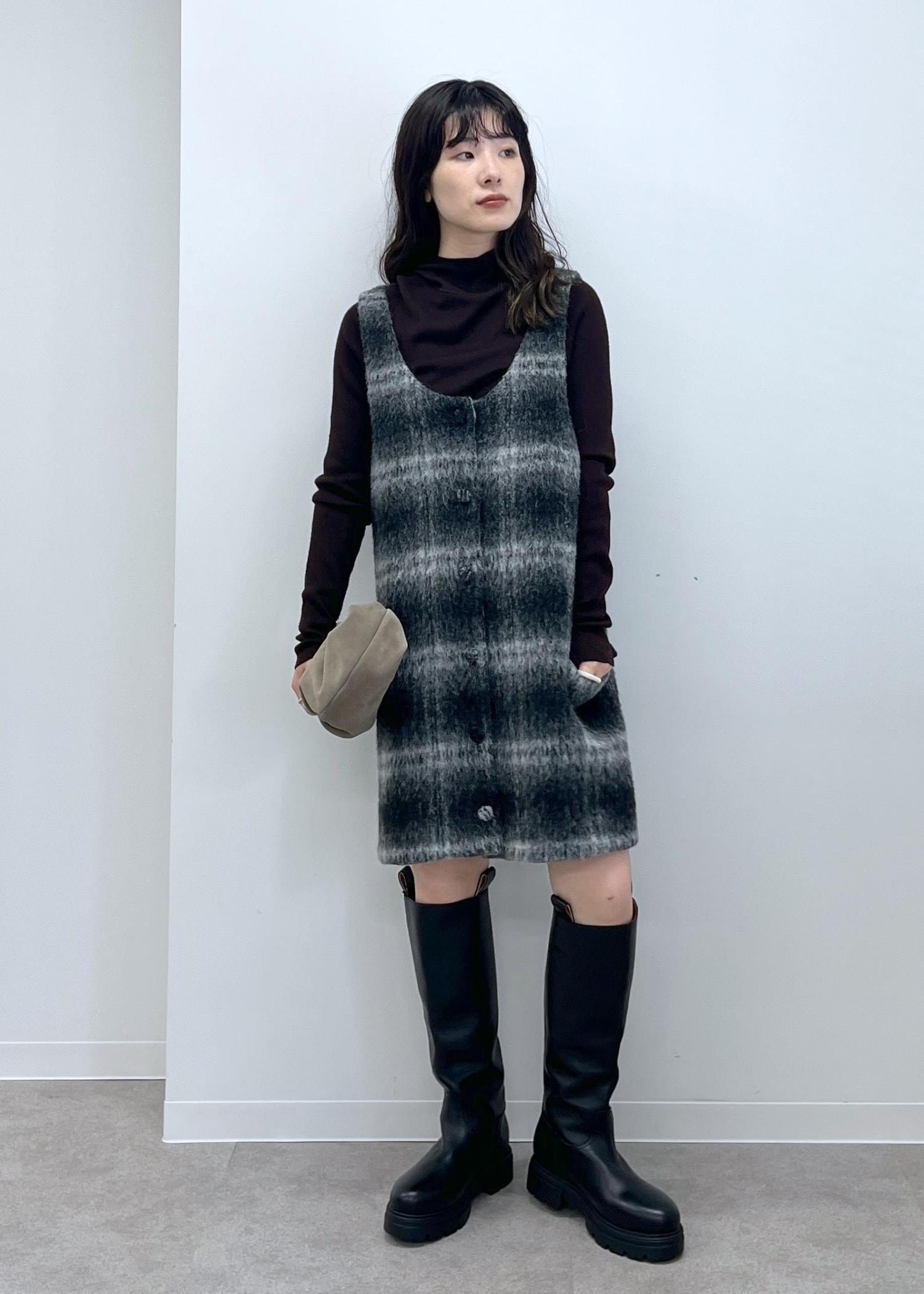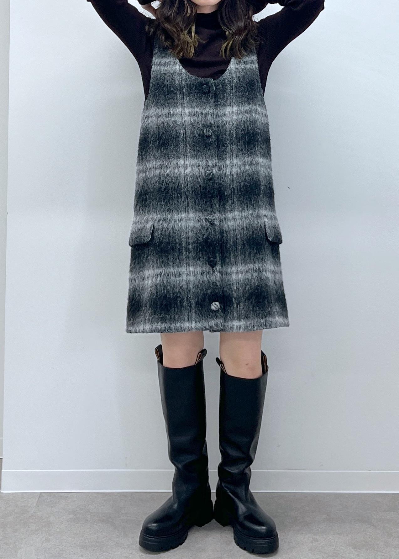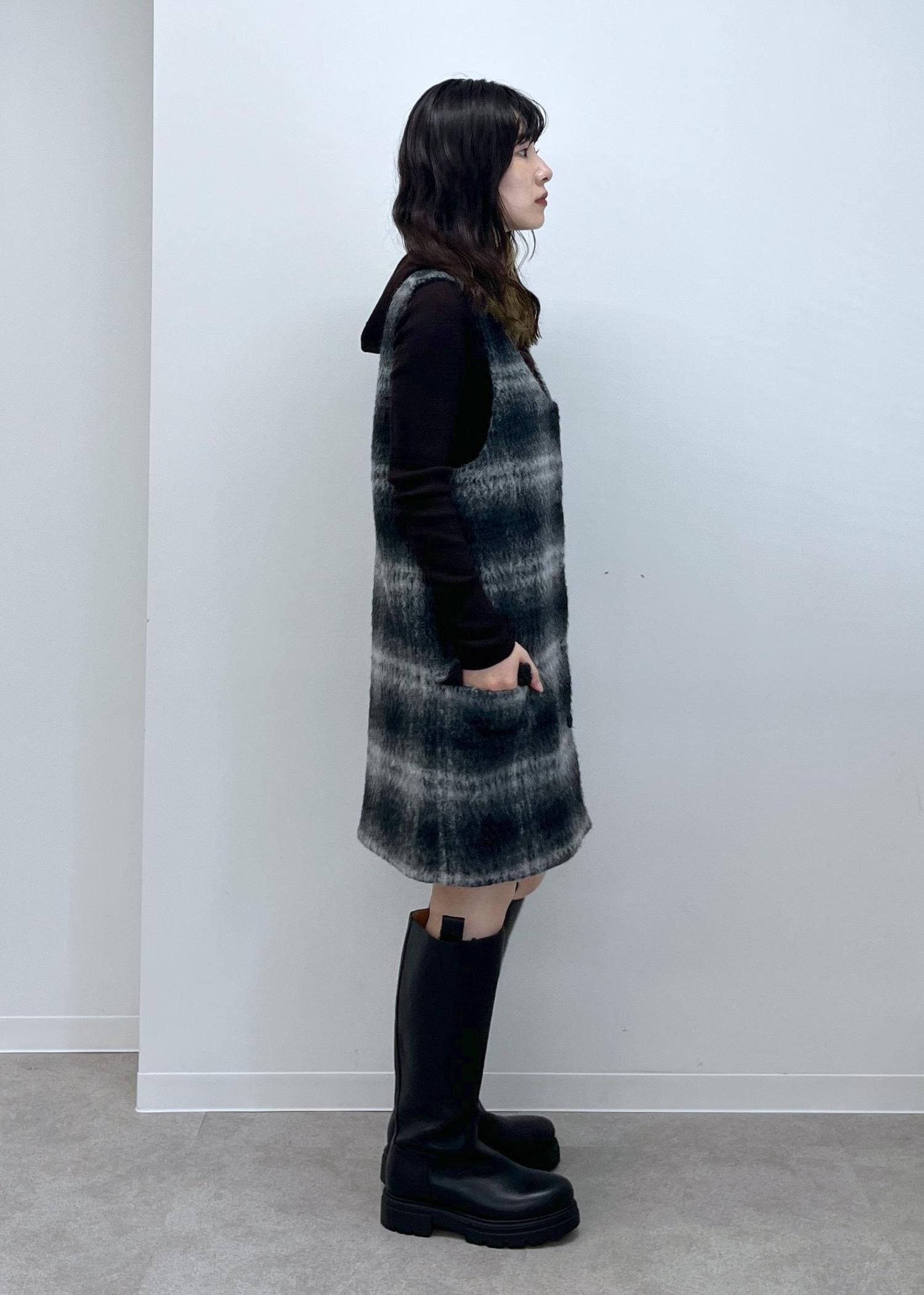 BALLI社のアルパカ混シャギー素材を使用。ミニ丈のゆったりとしたジャンバースカートですが、ボタンを開ければジレとしても着用できます。
