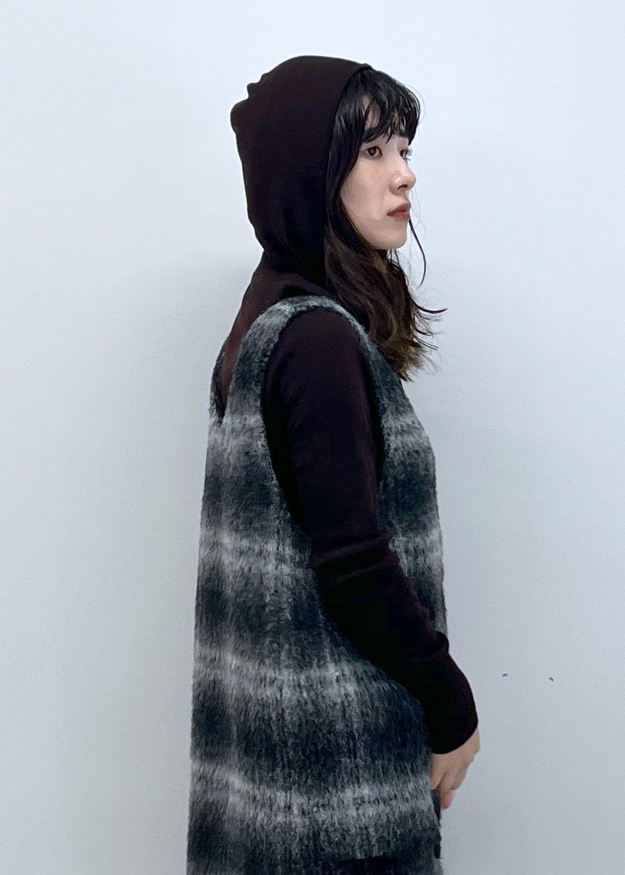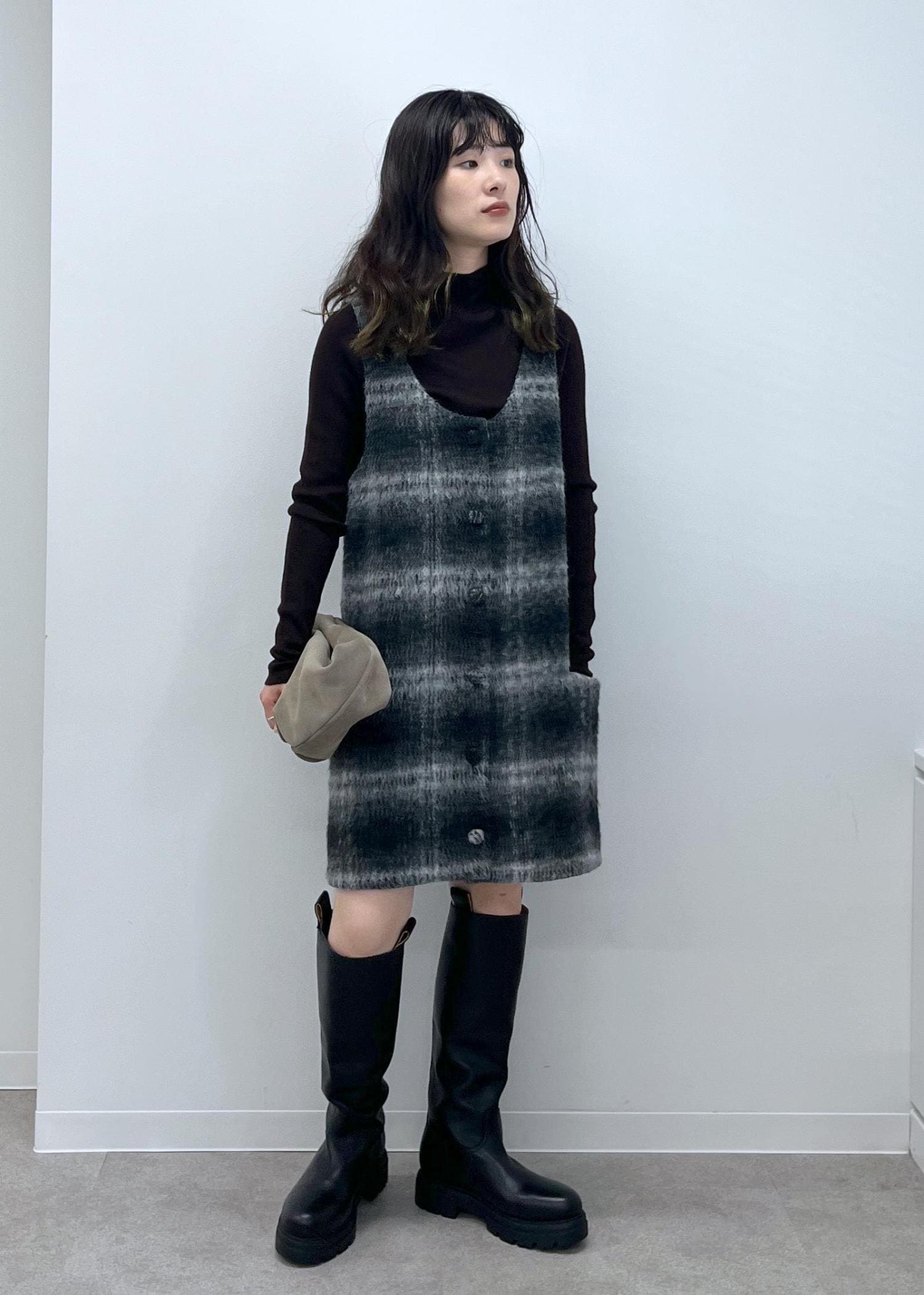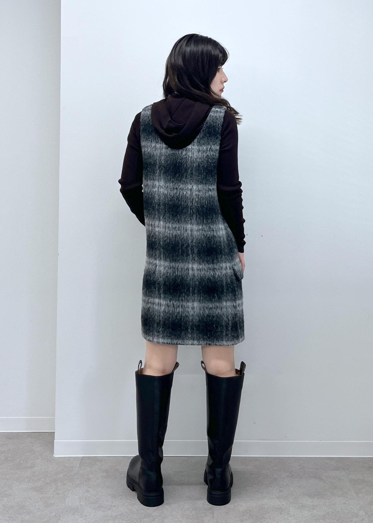 BALLI社のアルパカ混シャギー素材を使用。ミニ丈のゆったりとしたジャンバースカートですが、ボタンを開ければジレとしても着用できます。