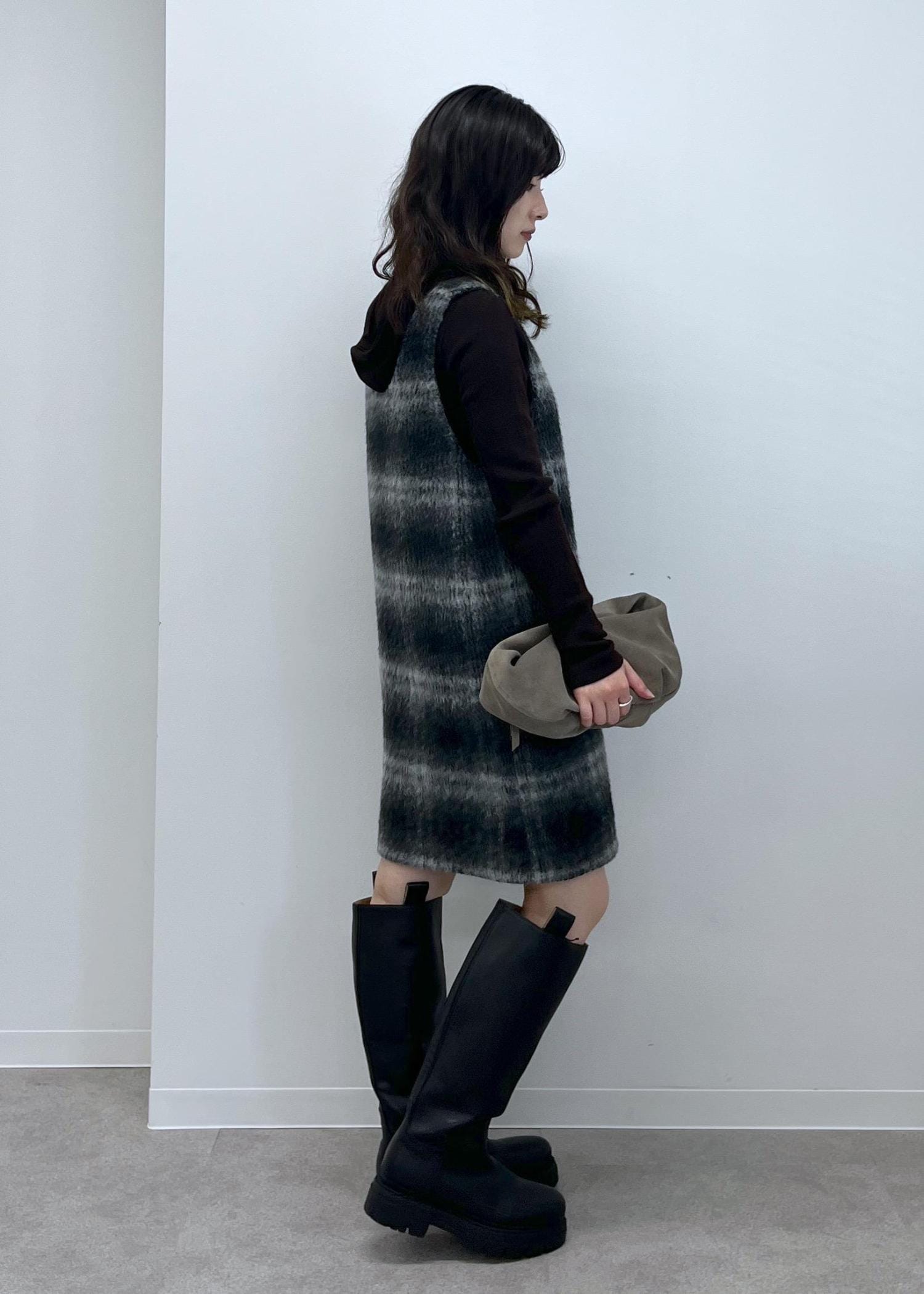 厚底の安定感あるロングブーツ。幅は太めなので、パンツをインしても履けるサイズ感です。