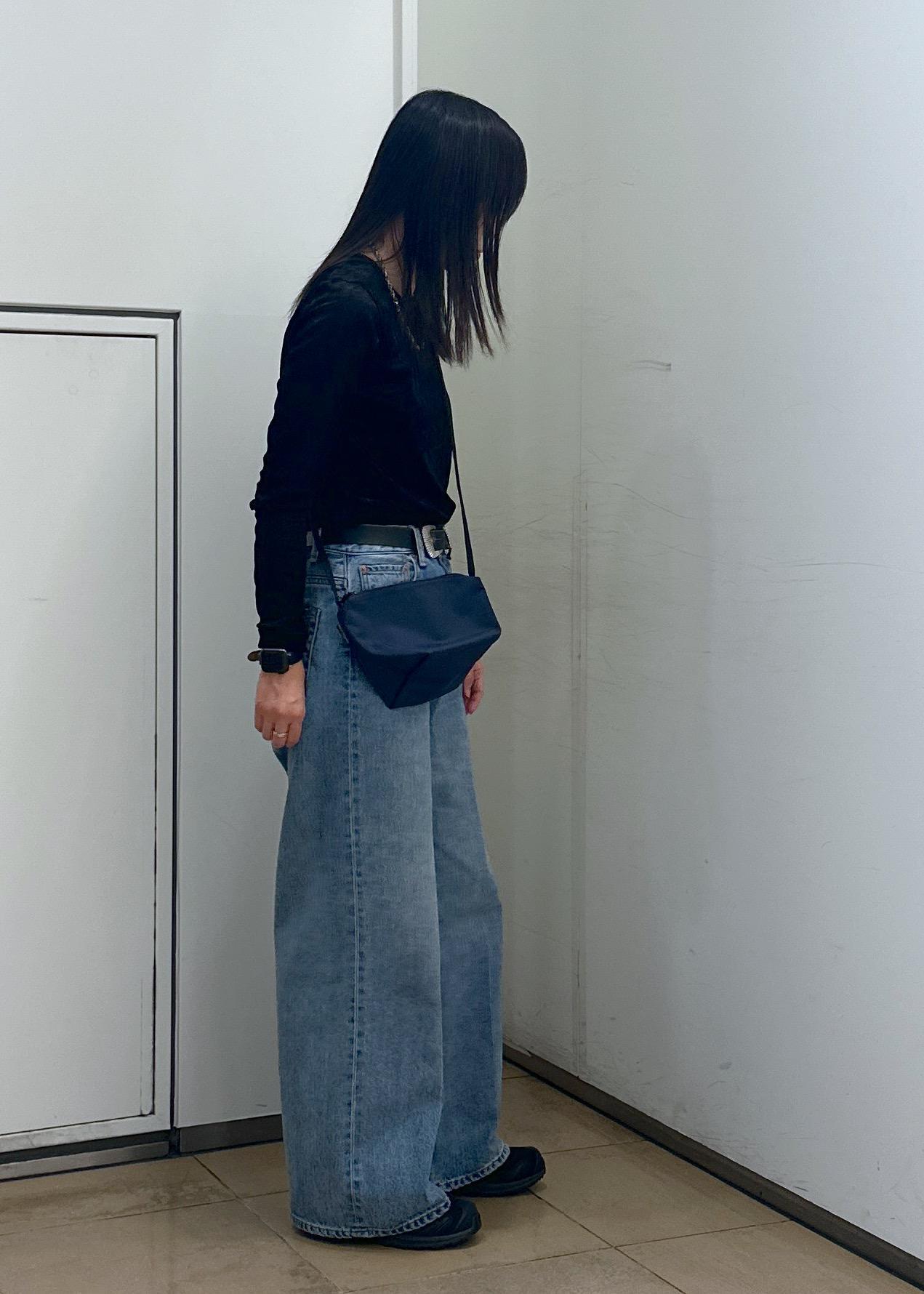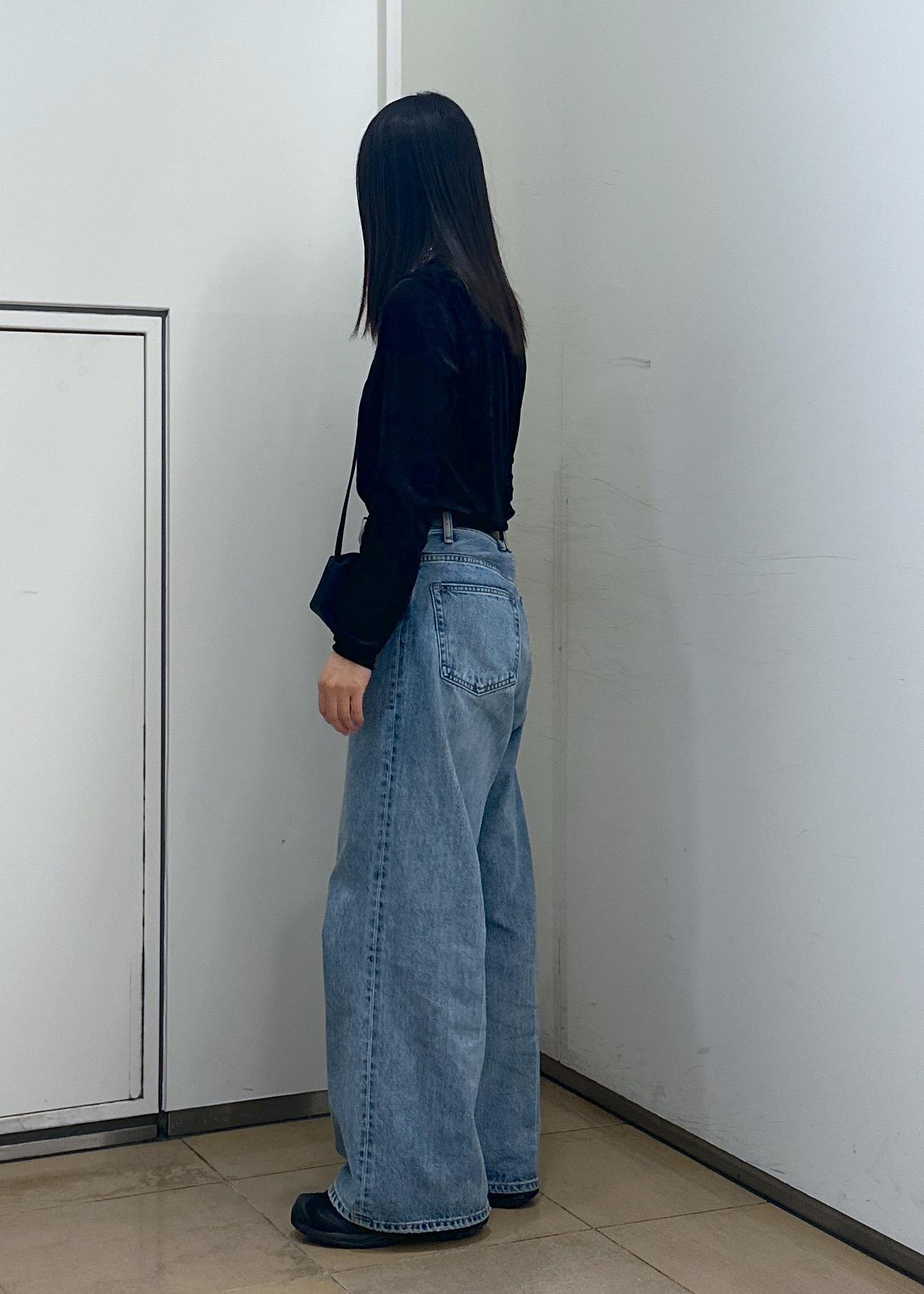 シアーベロアの透け感で女性らしさを取り入れつつ、バギーデニムでストリート感を出したコーディネートです。