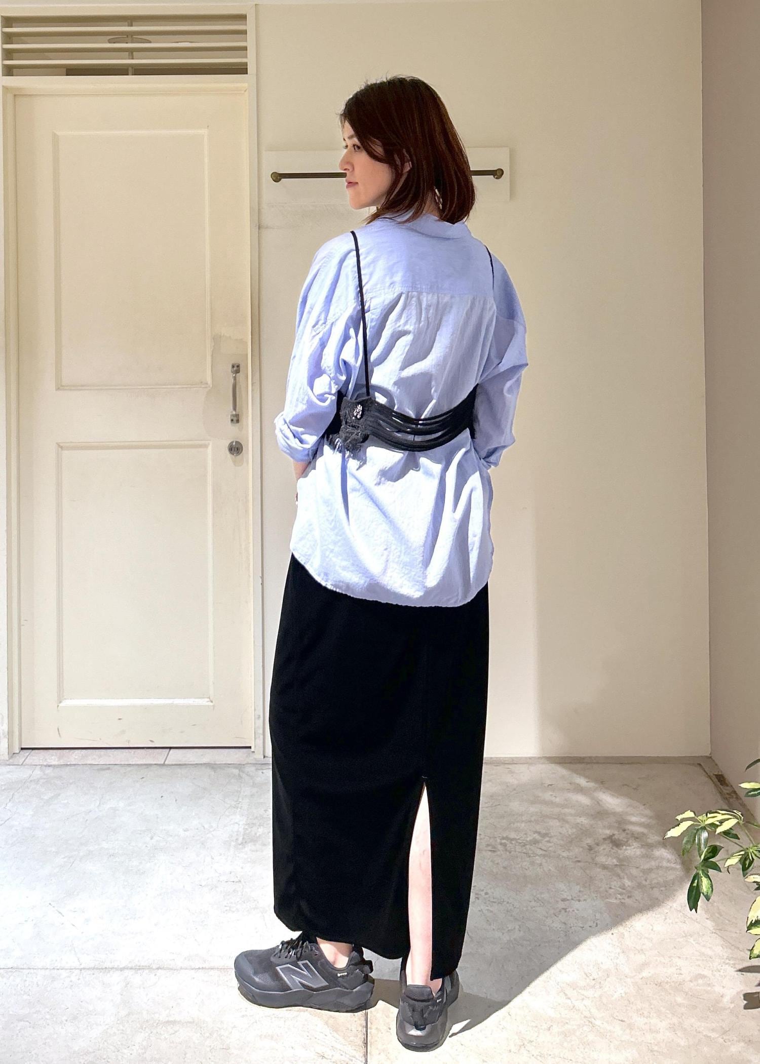 丈はお尻が隠れるくらい、袖は手の甲が隠れるくらいの長さです。身幅はゆったりめのオーバーシャツで、飽きのこないシンプルなデザインです。サイドは大きめのスリットが入っていて、抜け感が出ます。