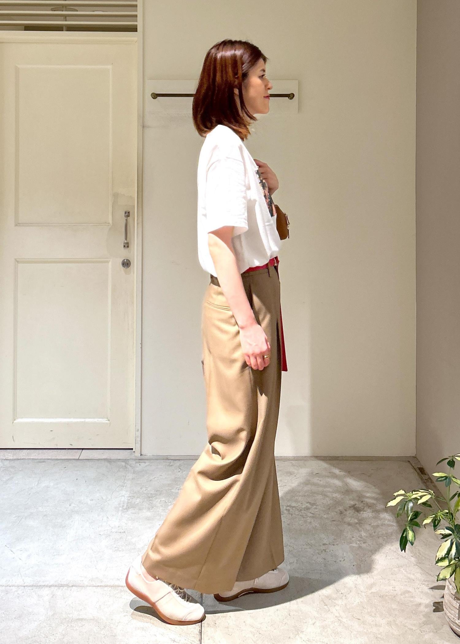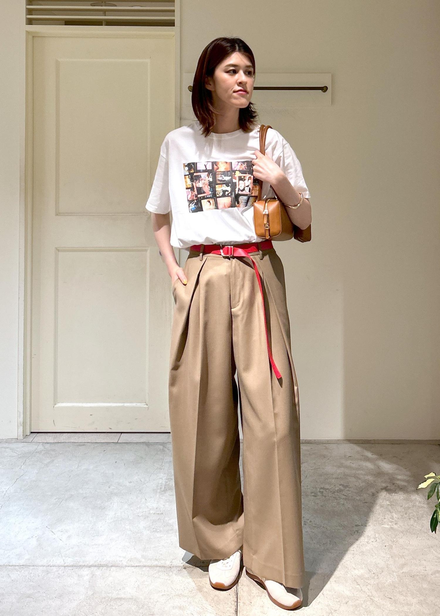 Tシャツをメインにシンプルなコーディネートを組んでみました。小物などのカラーで秋らしさを取り入れ、赤いベルトをポイントにしてみました。