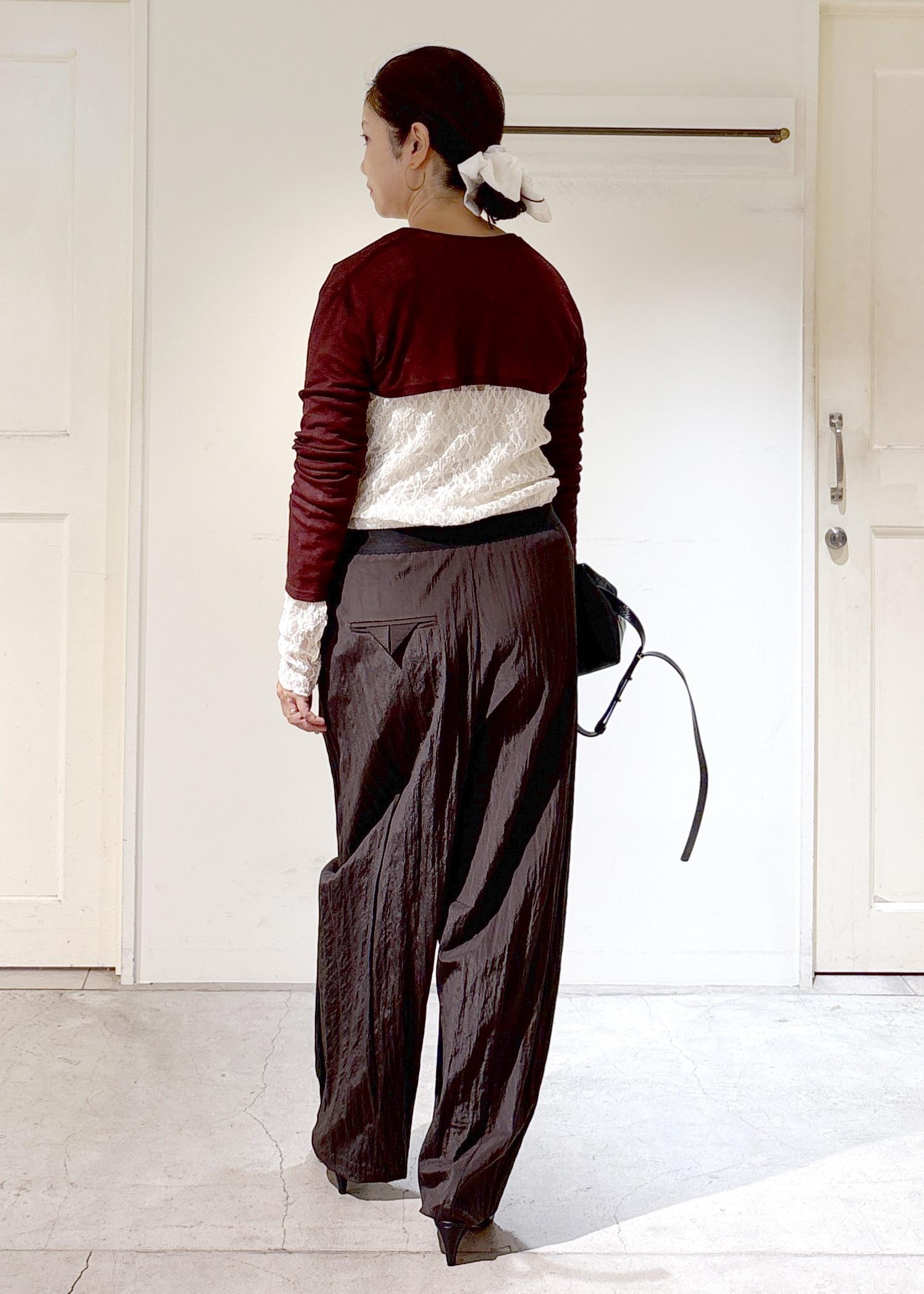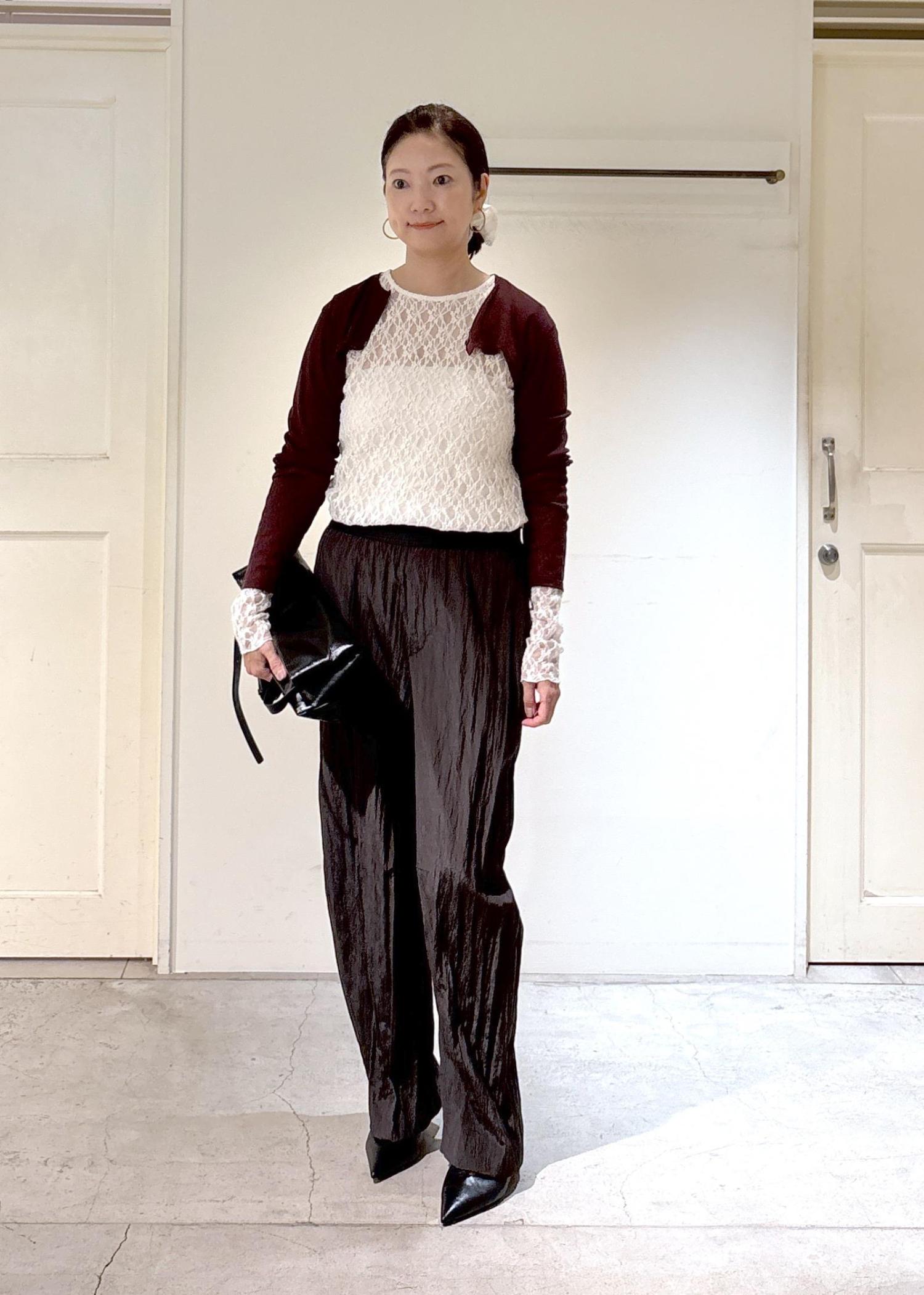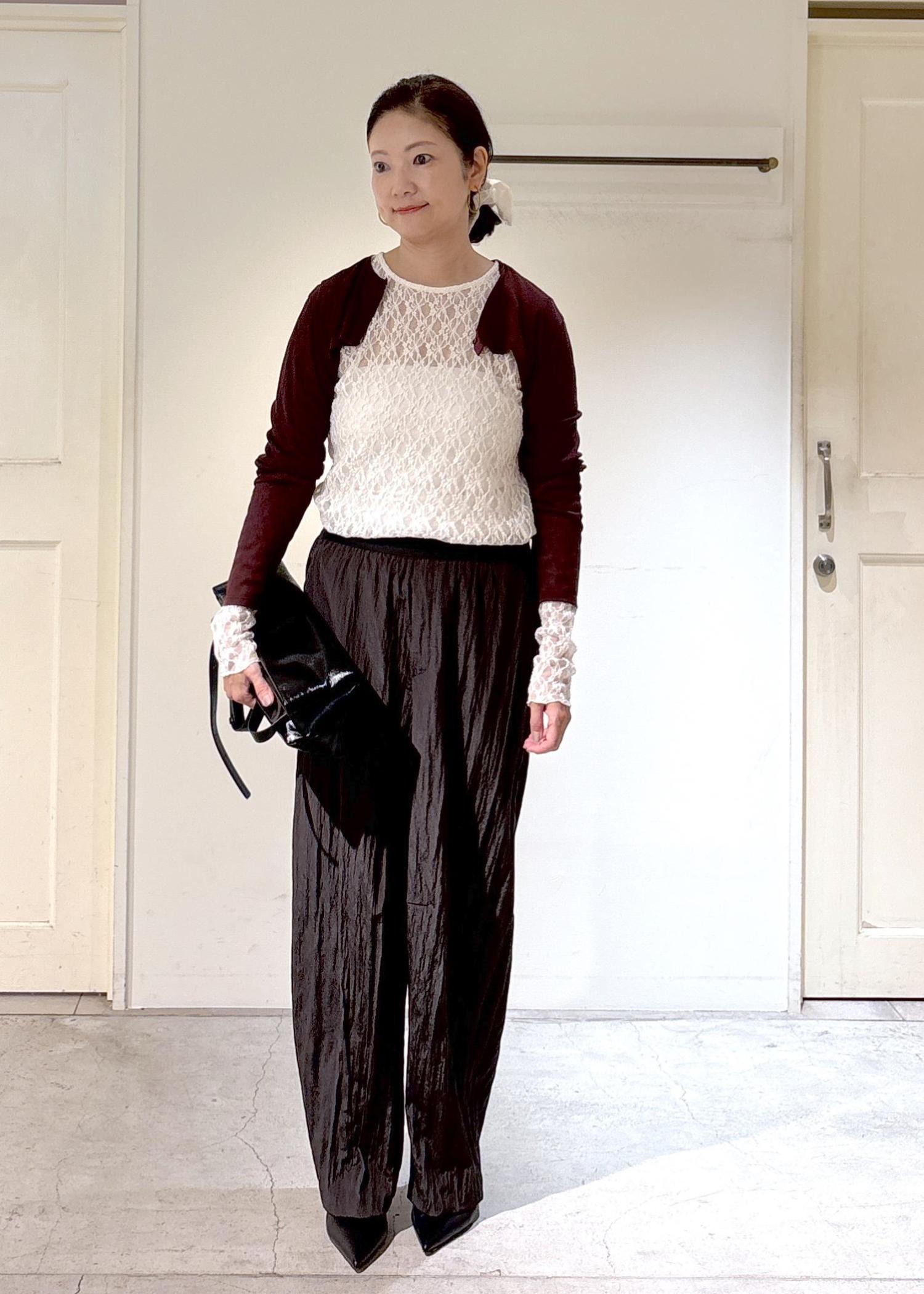 レーストップスにショートカーディガンを重ね、トレンド感のあるスタイルに。